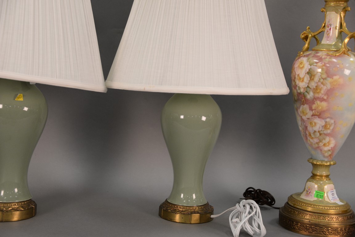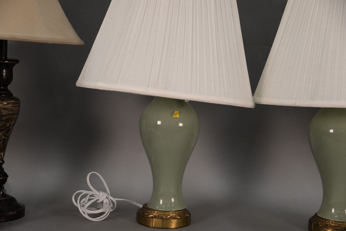 Lot 88: Five table lamps to include a set of three faux marble table lamps with shades and a pair of porcelain jade color. ht. 18in. to 27in…