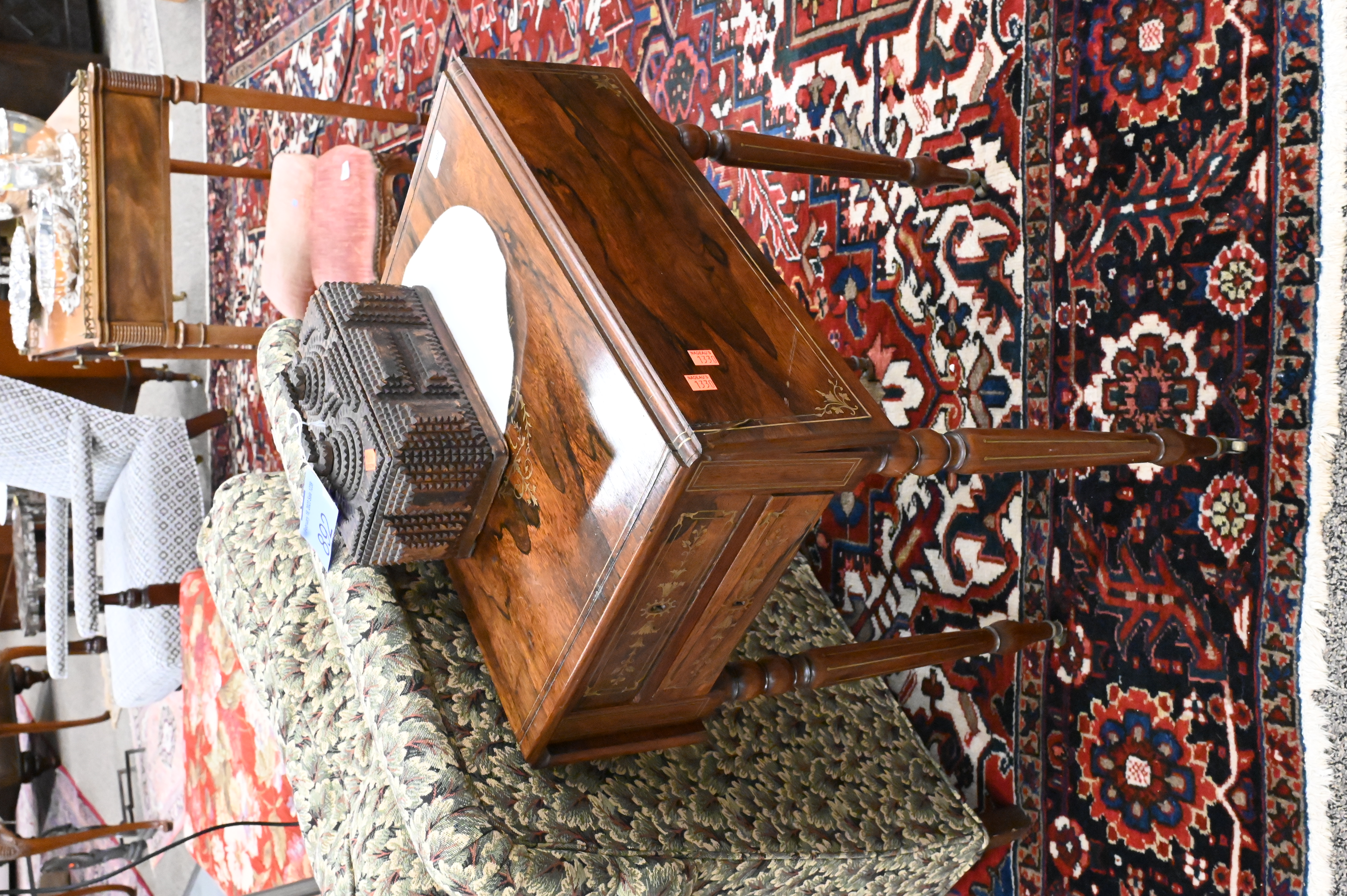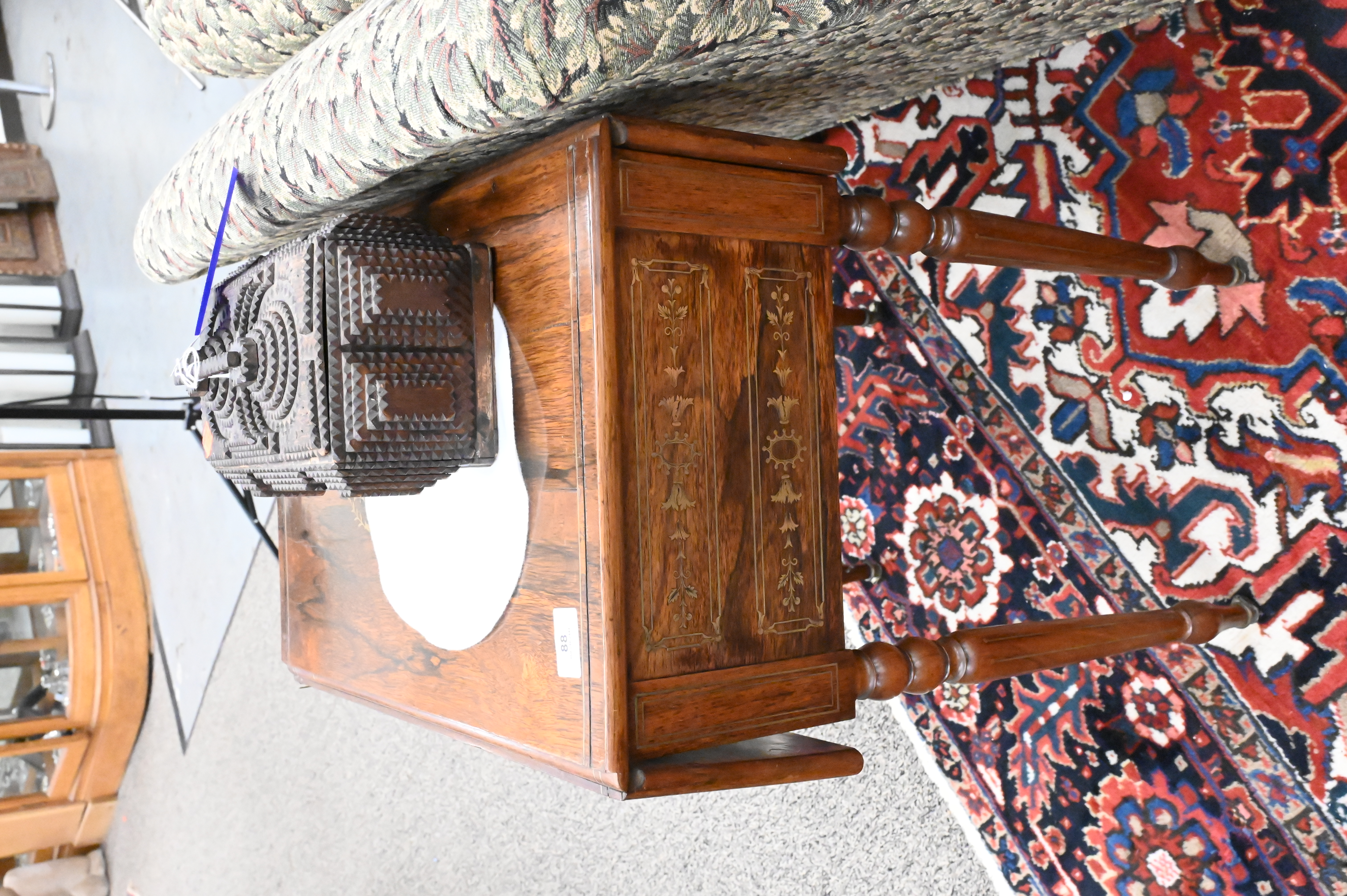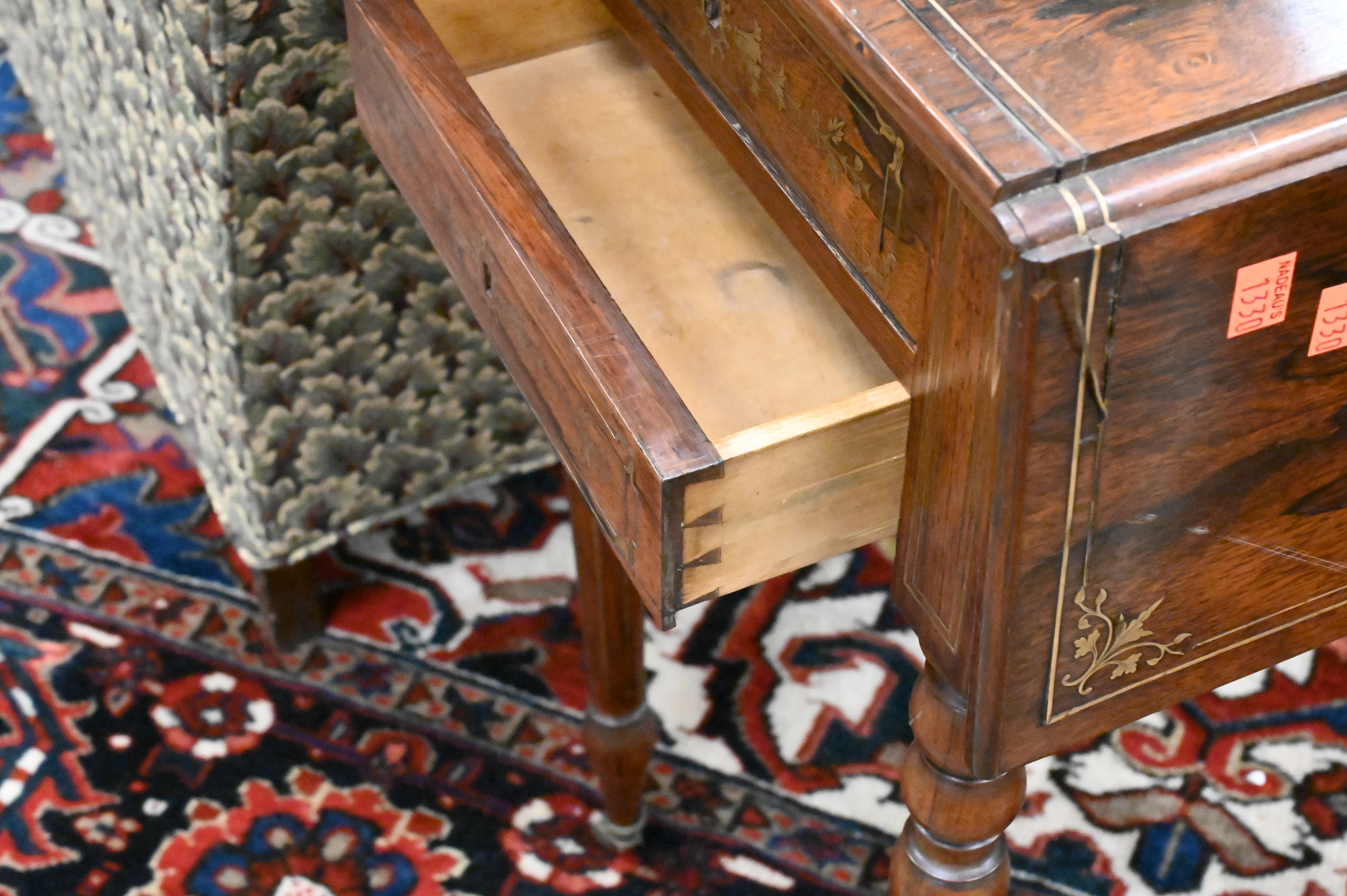 George III Rosewood Two Door Drop Leaf Table, on turned legs with brass inlaid design and brass inlaid legs, slight brass lines missing, height 27 inches, top 14 1/2″ x 21″.