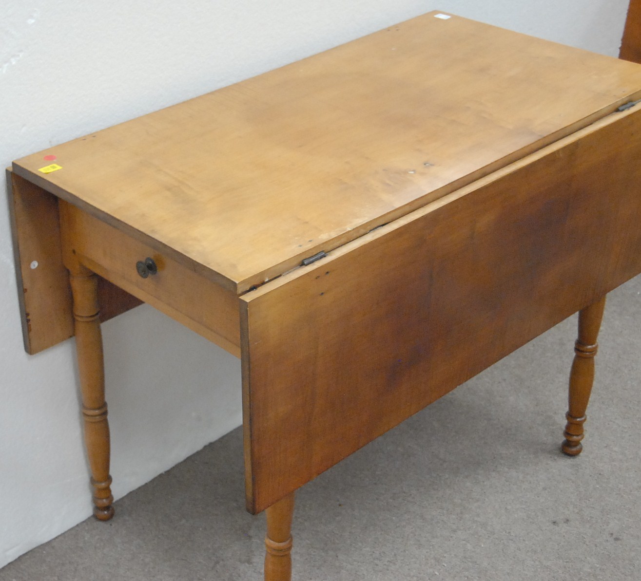 Maple and figured maple Sheraton drop leaf table with drawer.