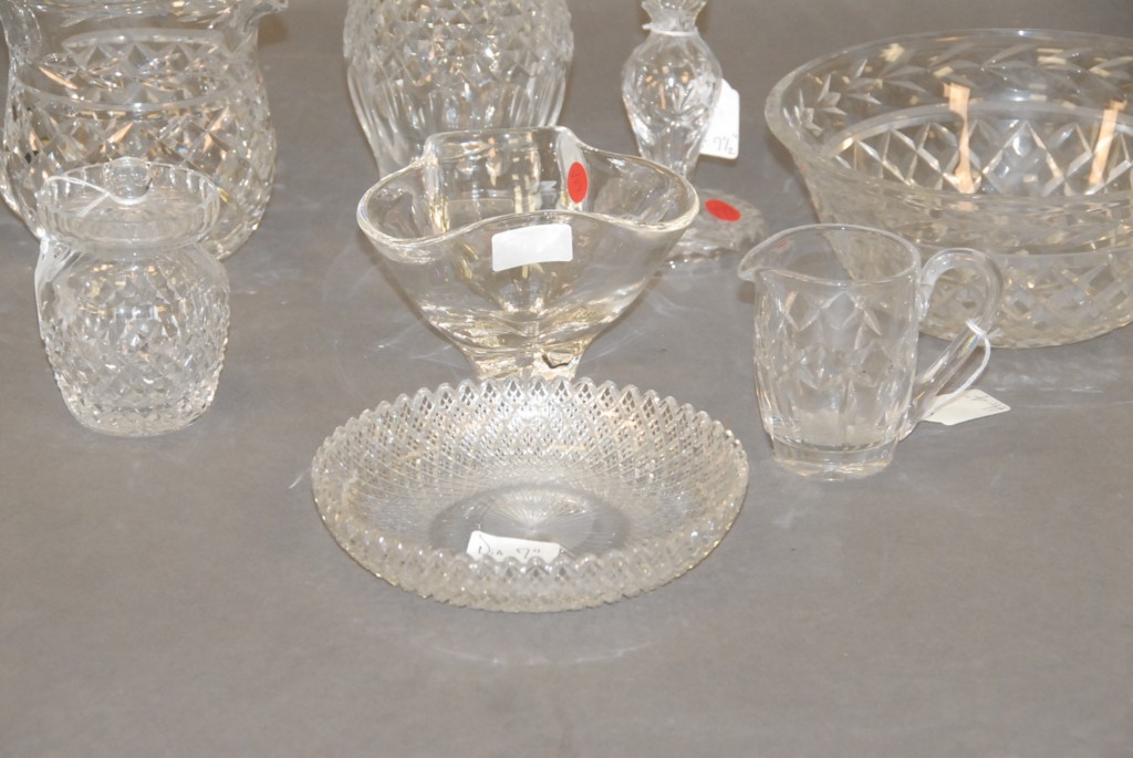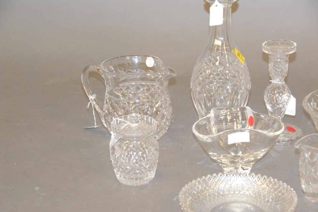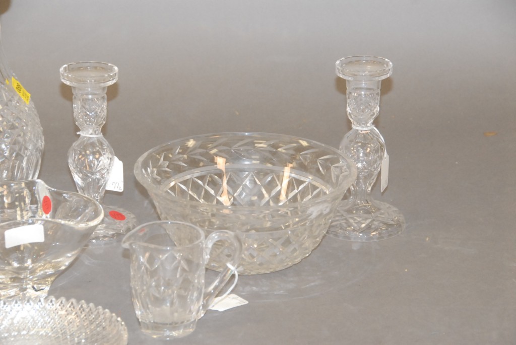 Lot 88: Nine piece lot Waterford bowl, Waterford decanter, Waterford pitcher, creamer, jelly, pair of crystal candlesticks, cut crystal sha…