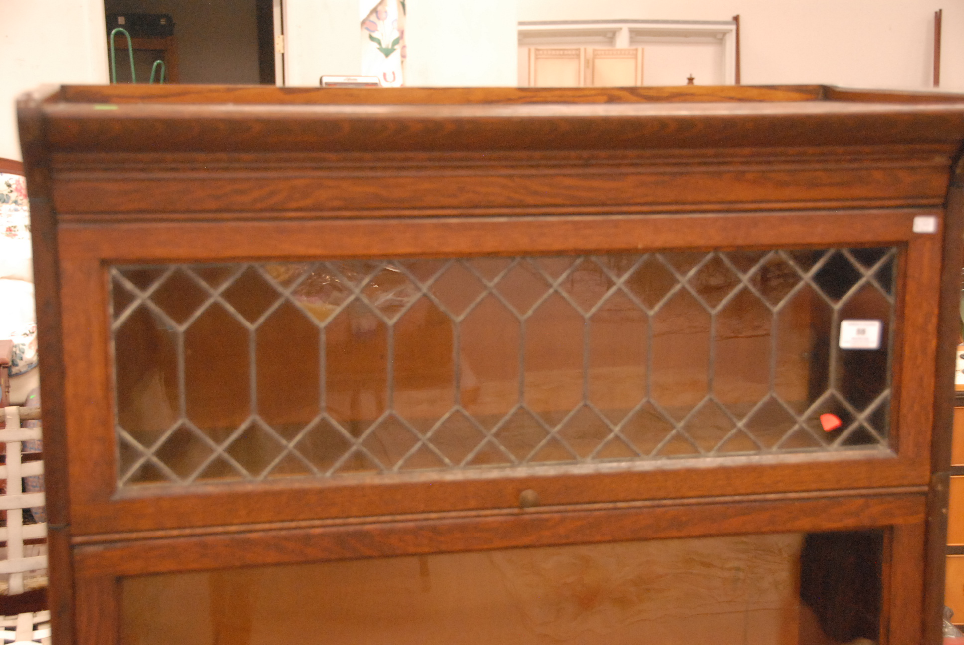 Oak four section stacking bookcase with leaded door in top.ht. 61 1/2 in. wd. 34 1/2 in.