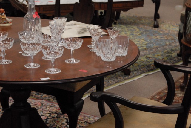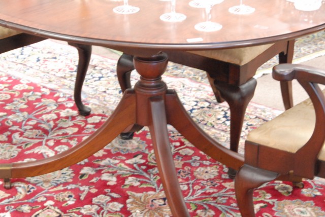 Oval mahogany single pedestal dining table with a banded inlaid top, two leaves.
