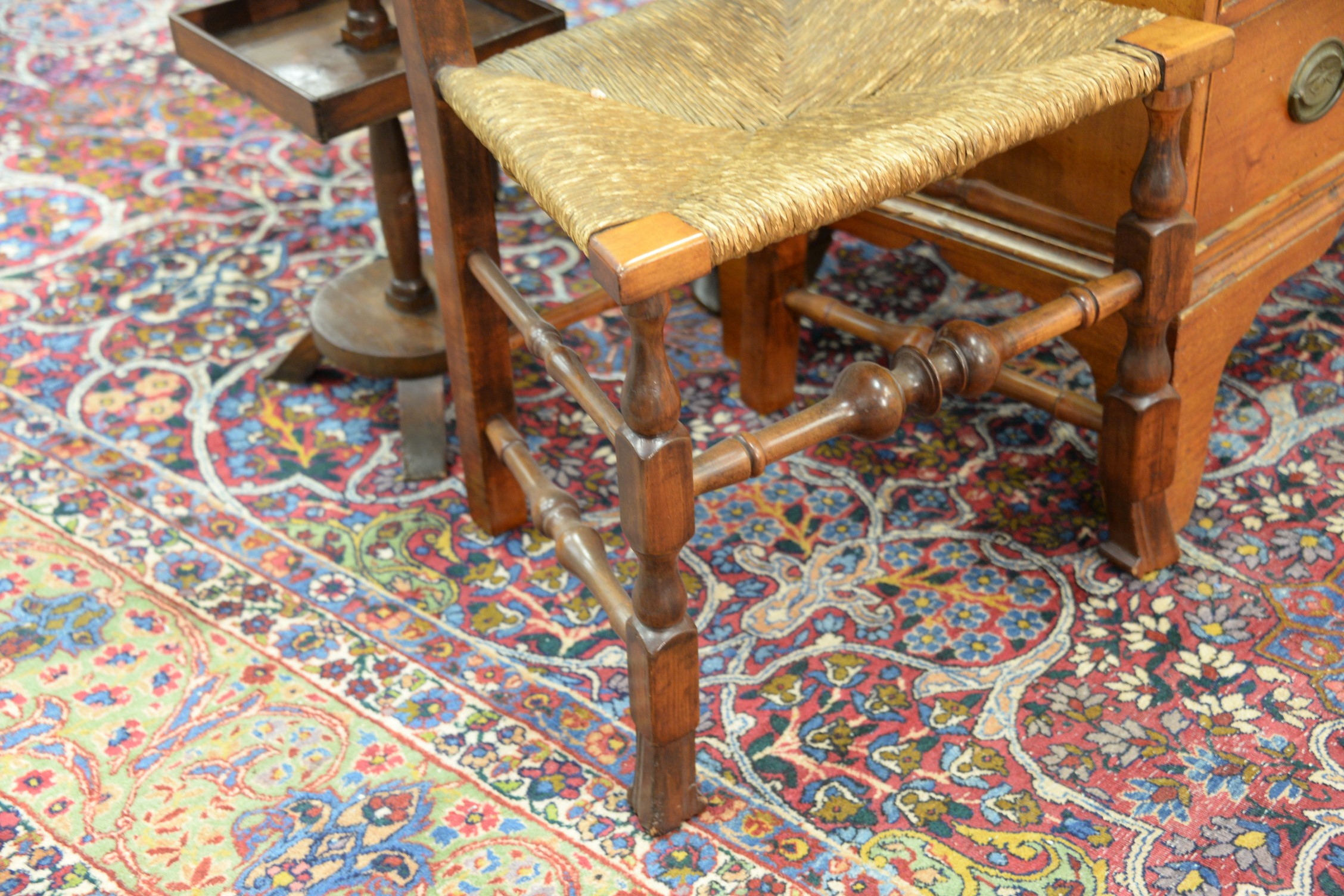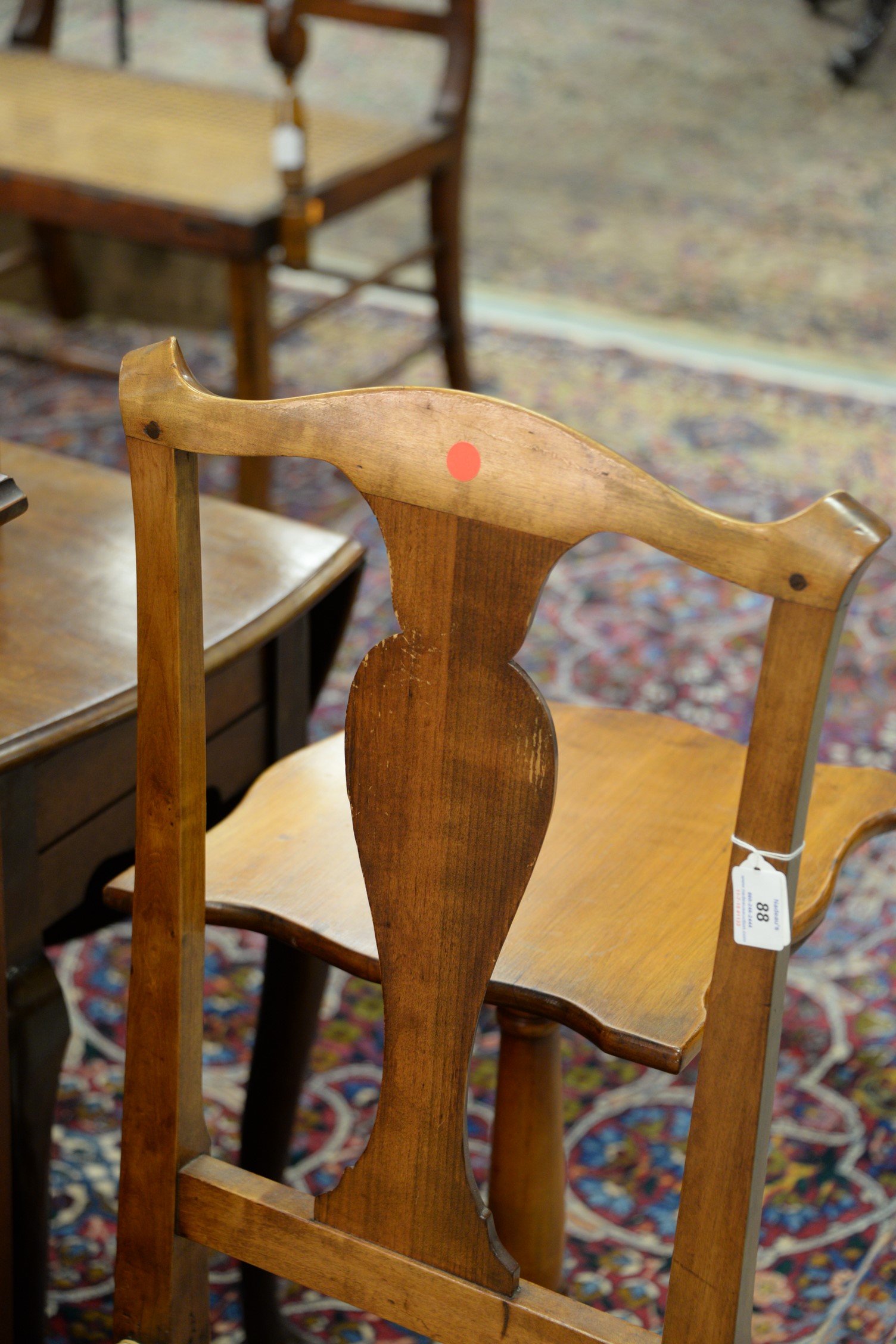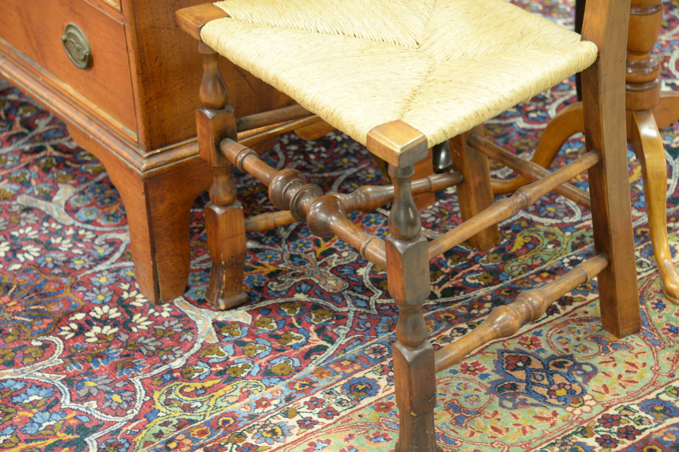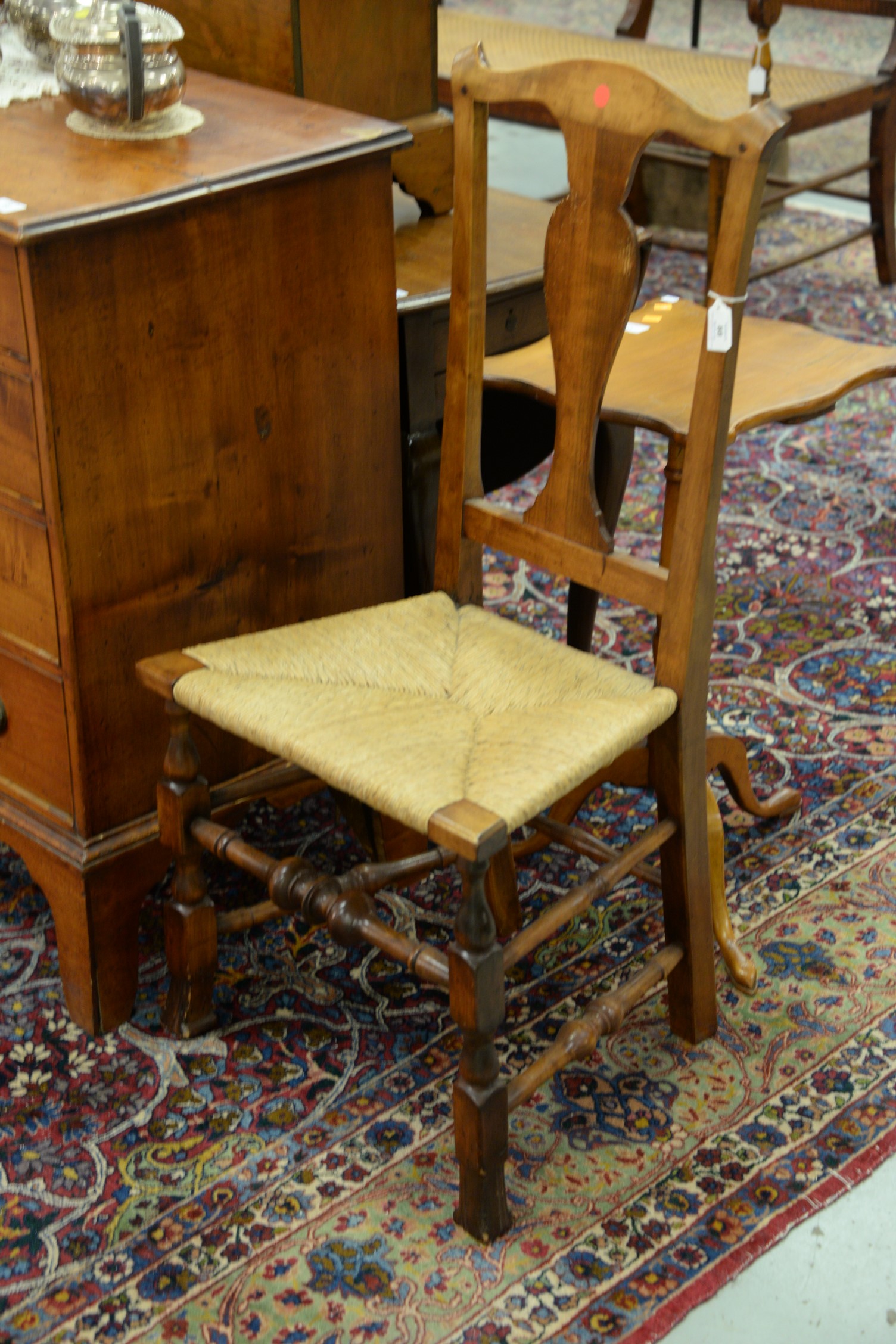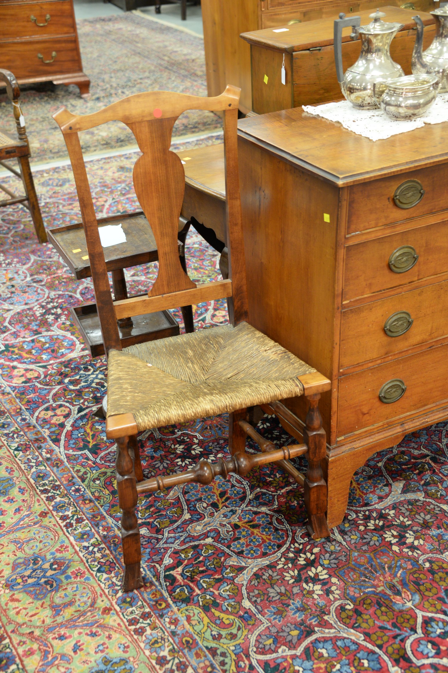 Pair of Queen Anne side chairs with rush seats on Spanish feet, 18th century.