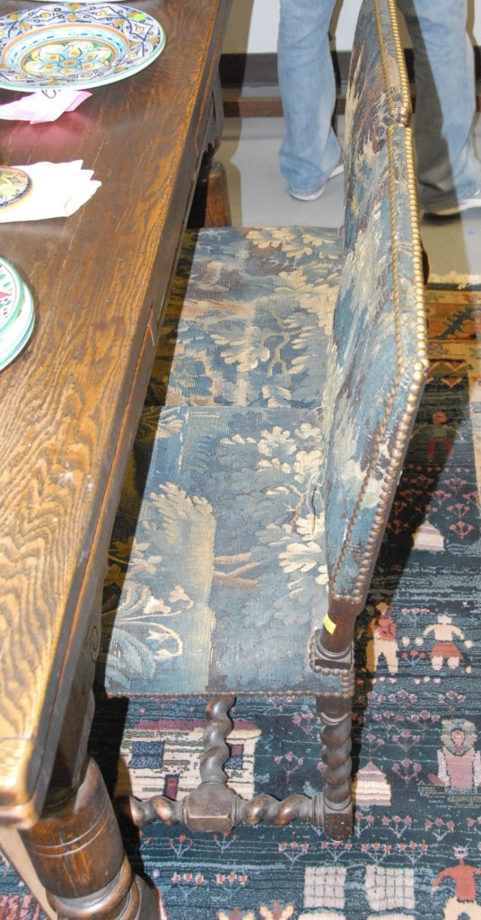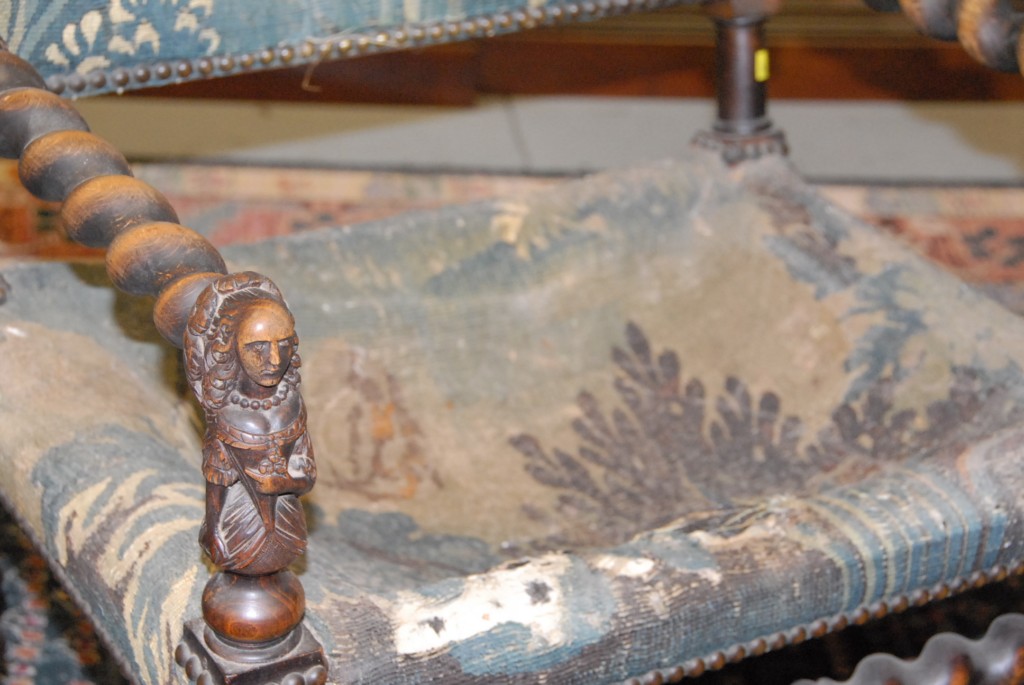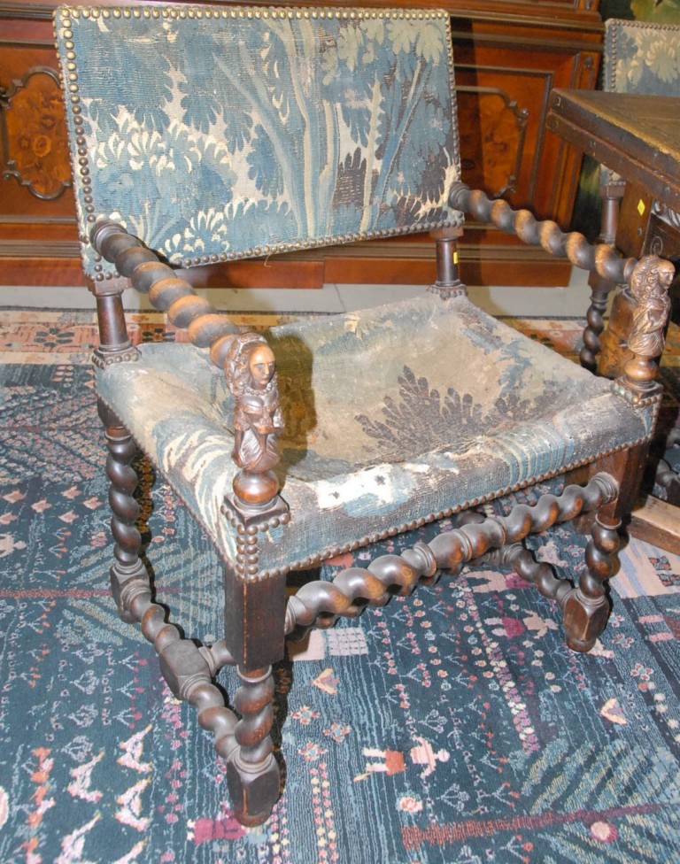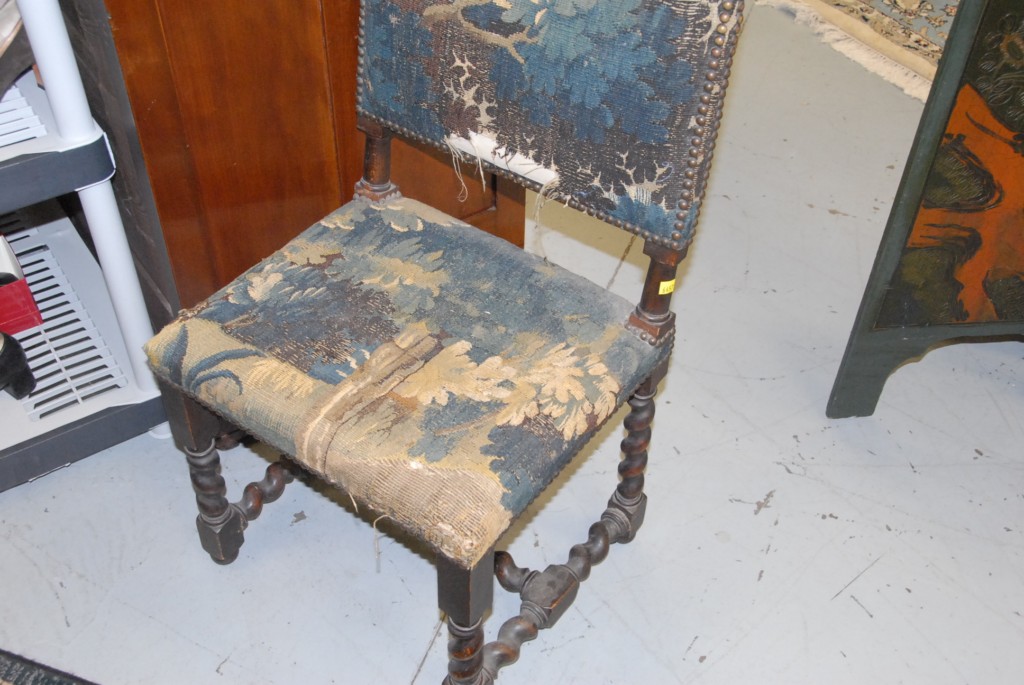 Set of eight Jacobean style dining chairs covered in 18th century Aubusson upholstery.