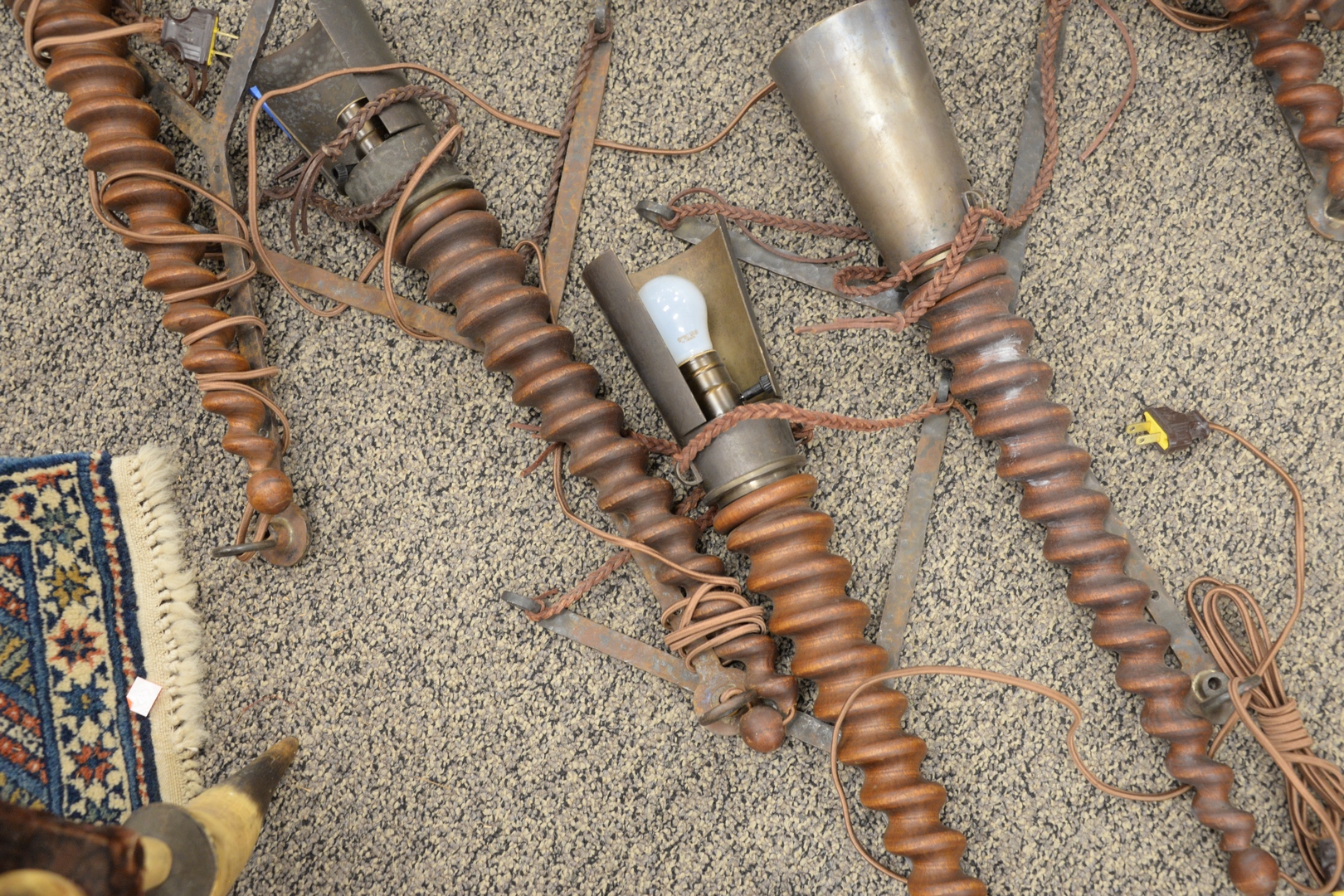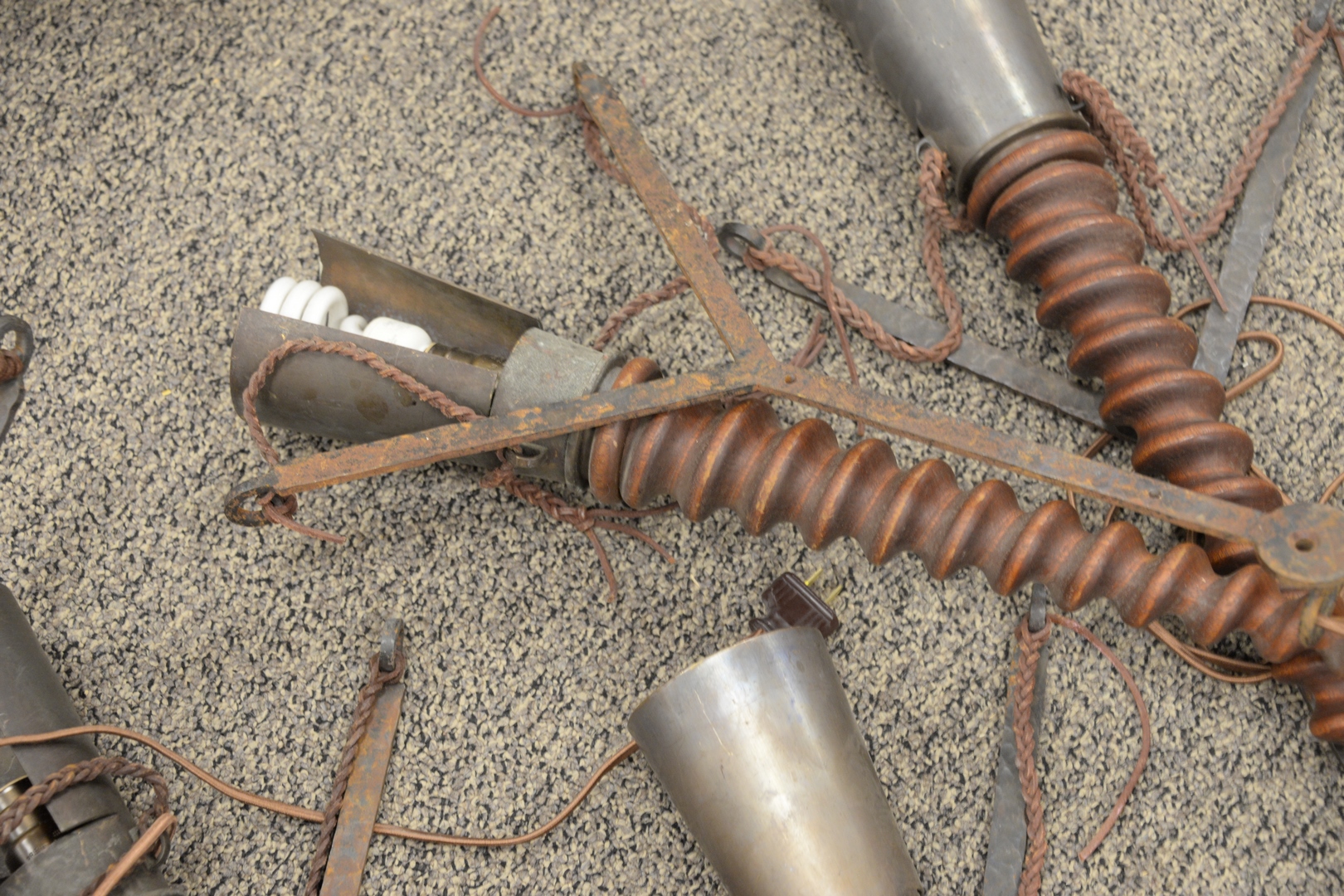 Lot 88: Set of Six Iron and Wood Brutalist Wall Sconces, torch form with carved spiral turned wood and brass shade, height 24 inches.