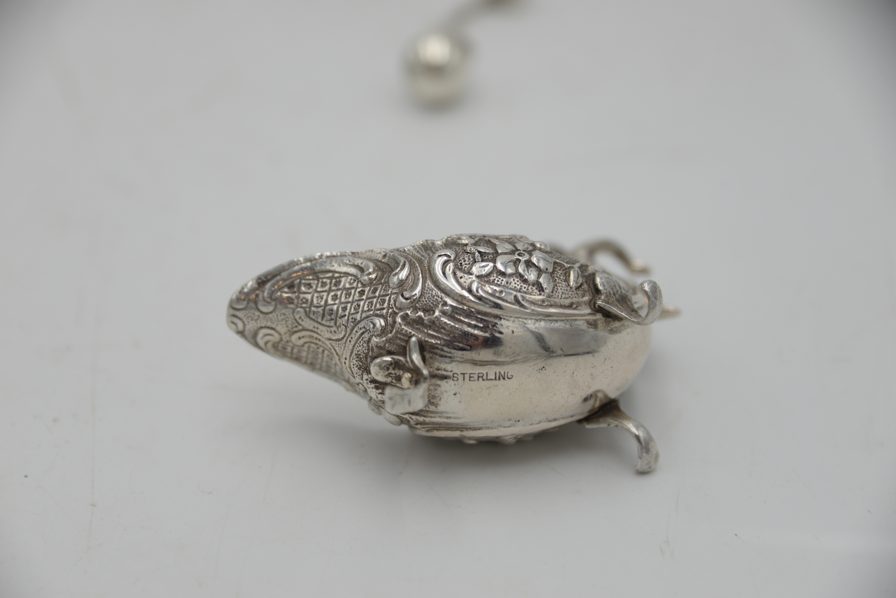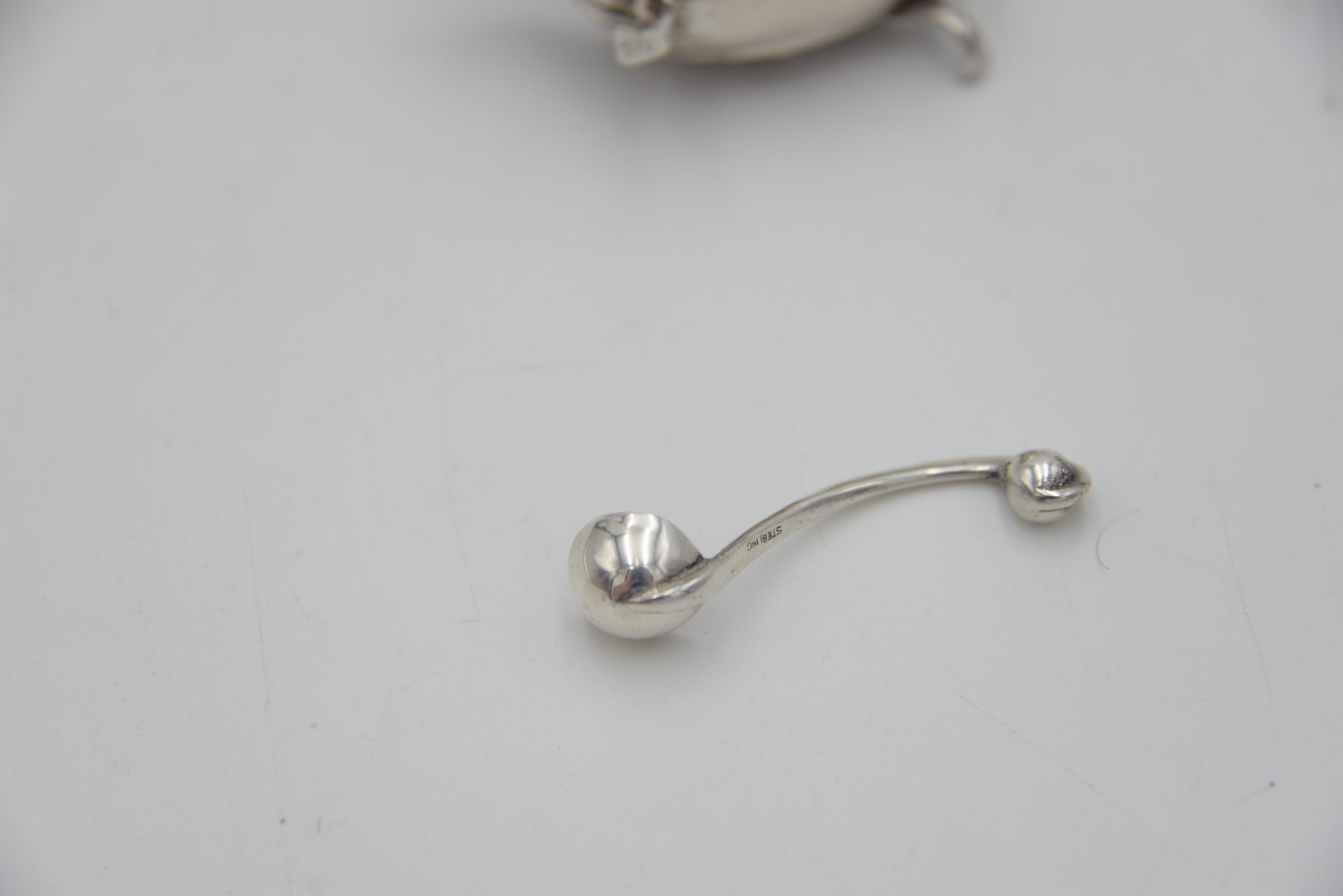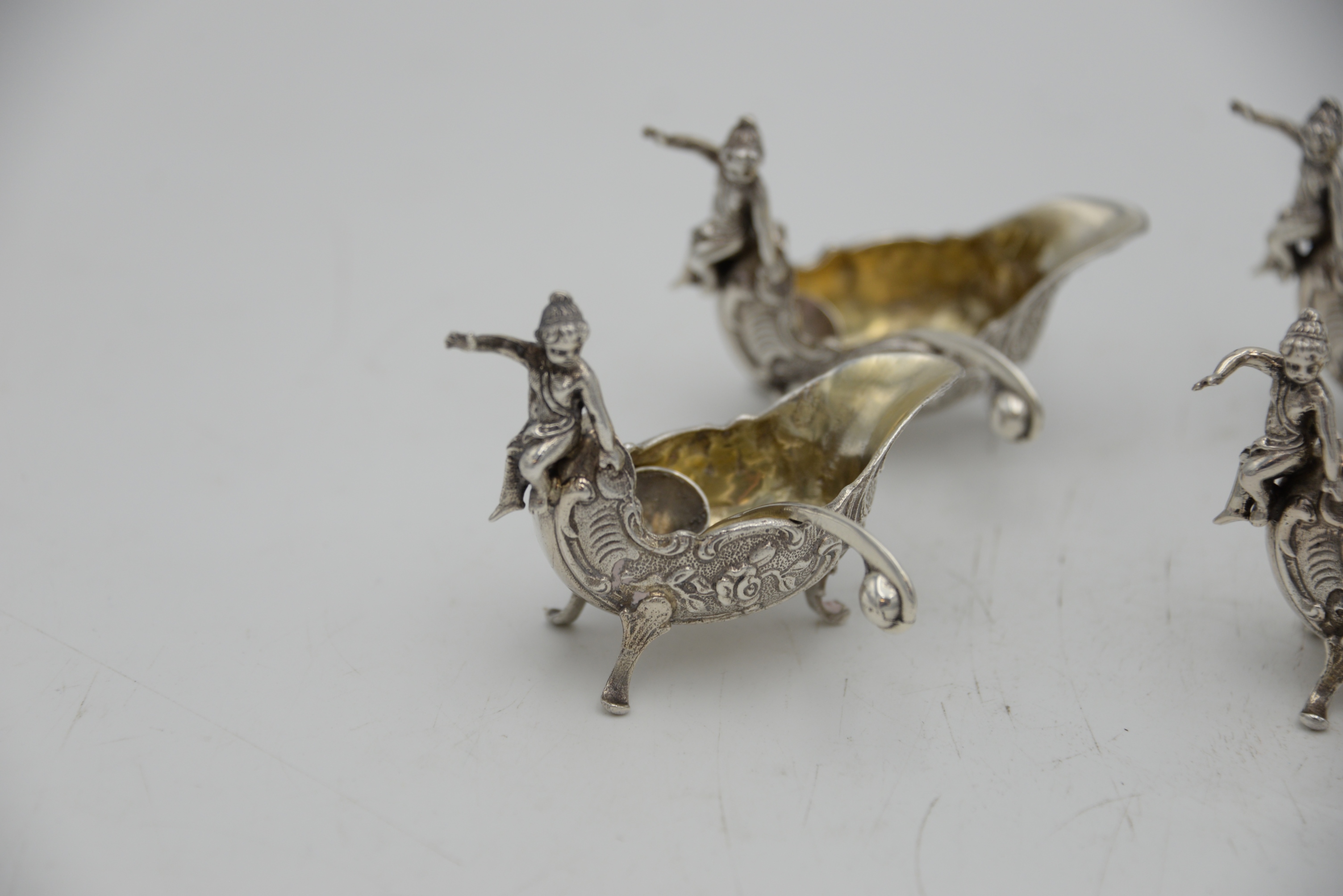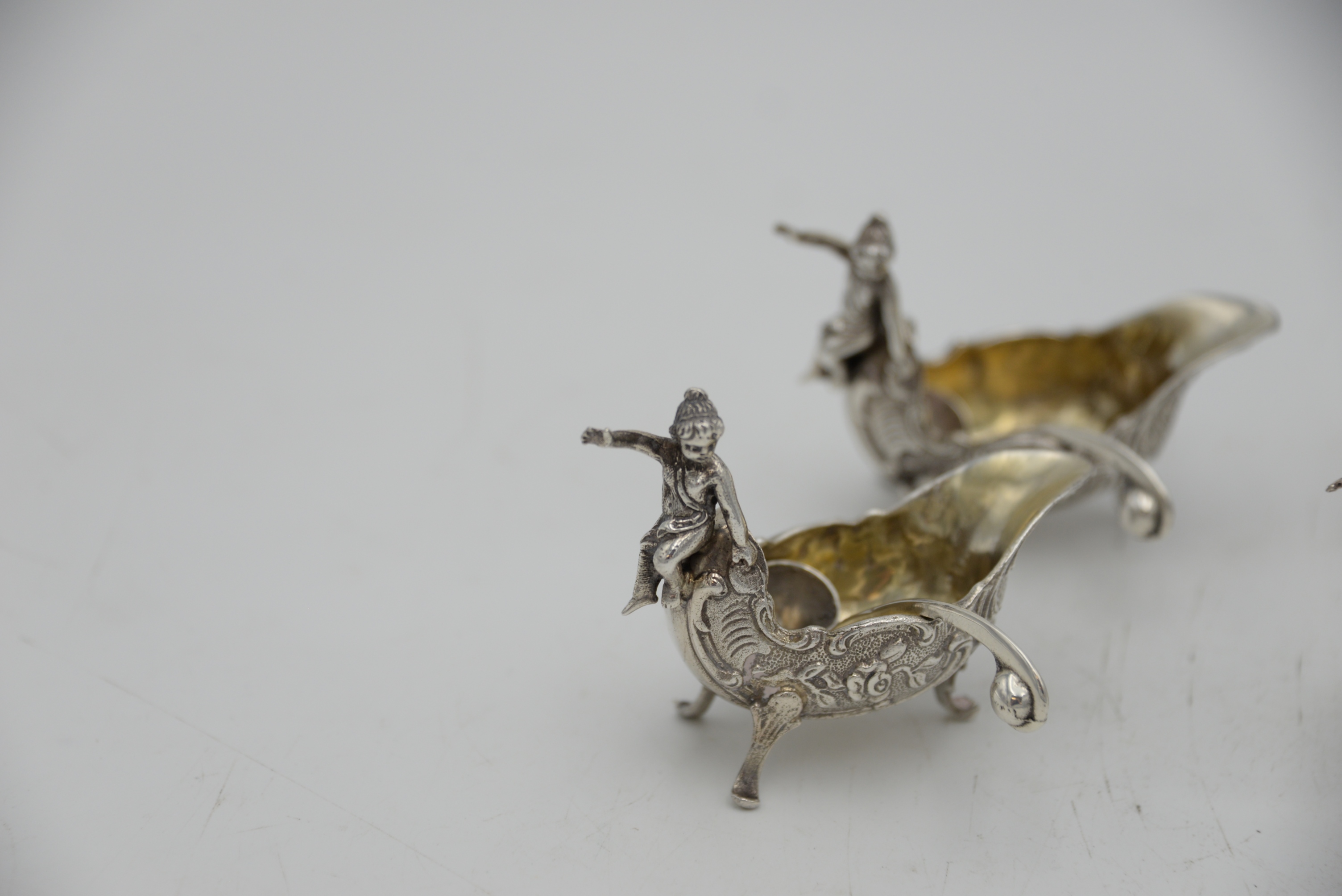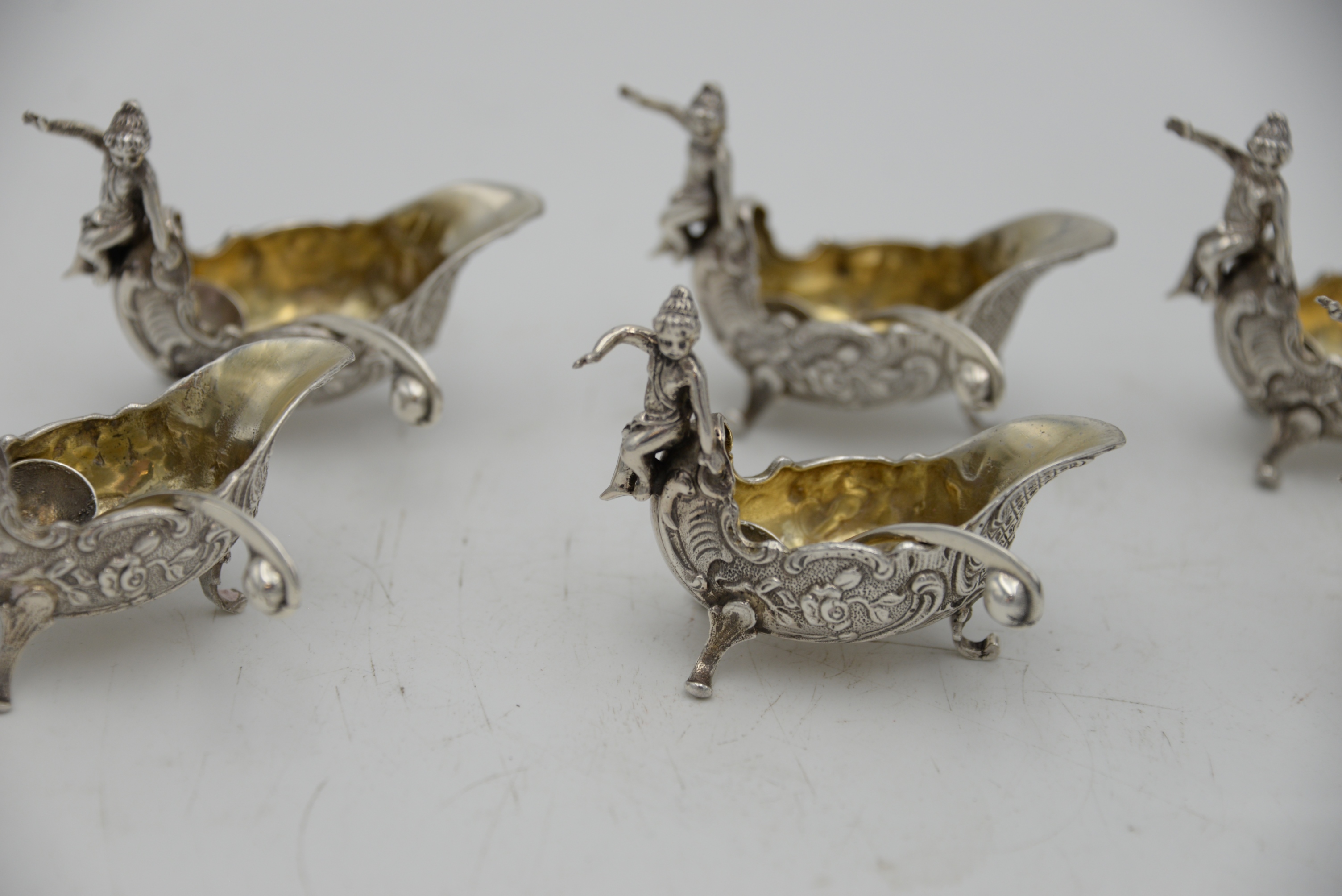 Set of Six Sterling Silver Open Salts, each having putti mounted shell design, bowl with small ladle style ball mounted spoons, height 2 inches, length 3 inches, 11.7 t.oz.