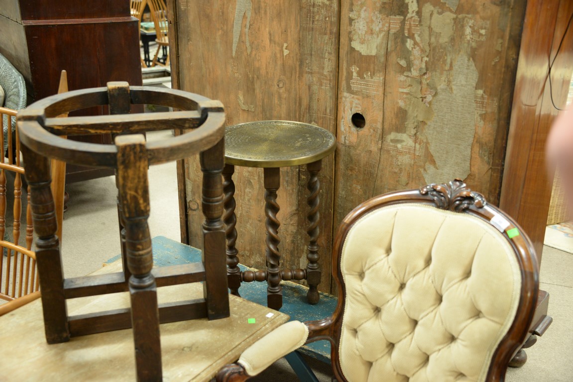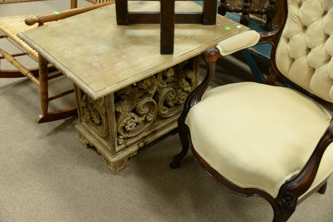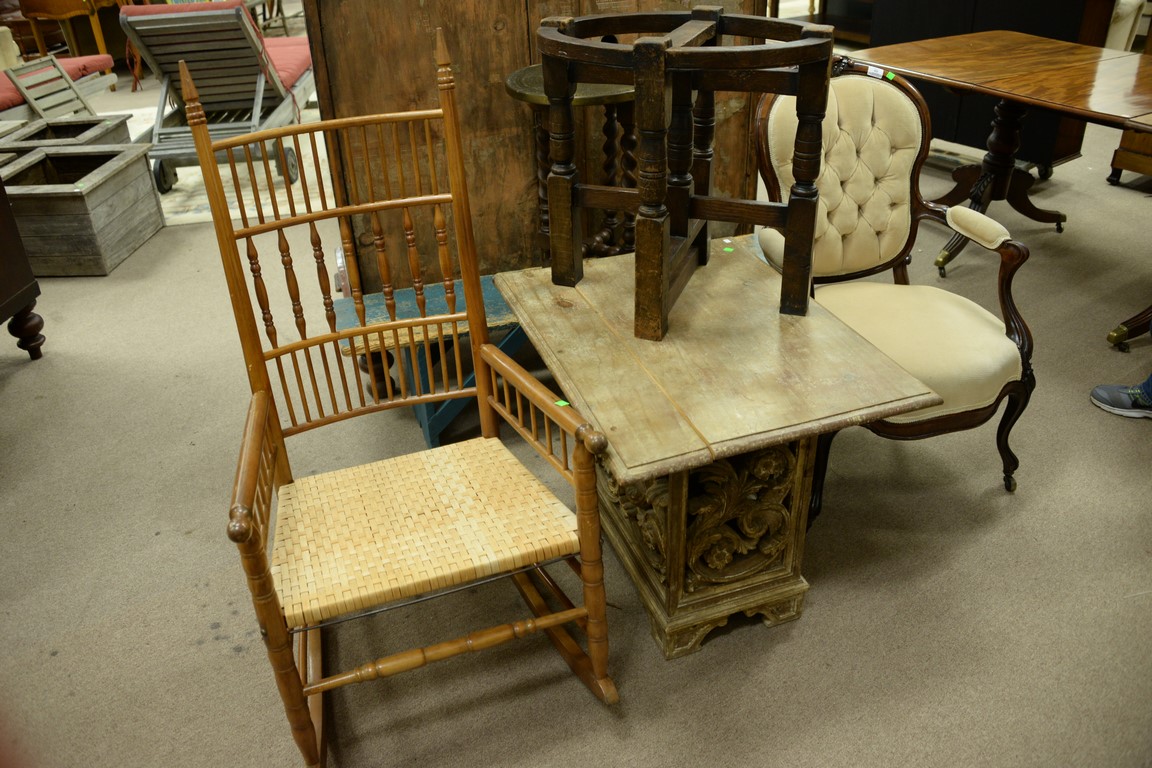 Lot 88: Six piece lot to include carved table, rocker, blue bench lg. 50in., two small stands, and Victorian gents chair.