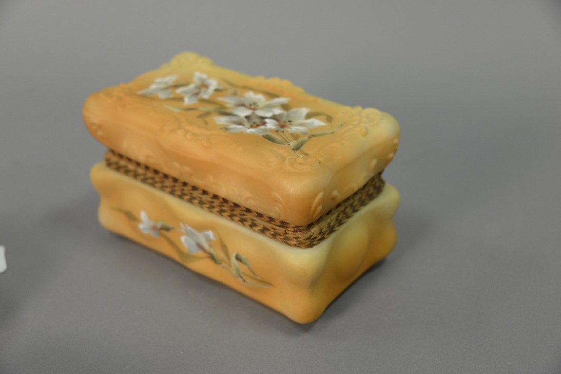 Lot 88: Three Nakara pieces including a glove or dresser box with painted flowers and two pin dishes or trays. box: ht. 3 1/4 in. wd. 3 1/2…