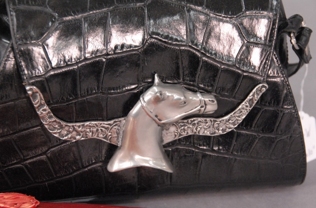 Three piece purse lot Bottega purse black silk height 5 1/2in. width 8in., Bottega purse rose color leather height 6 1/2in. width 9 1/2in., and Glen Miller Ann Turk with a horse snap.