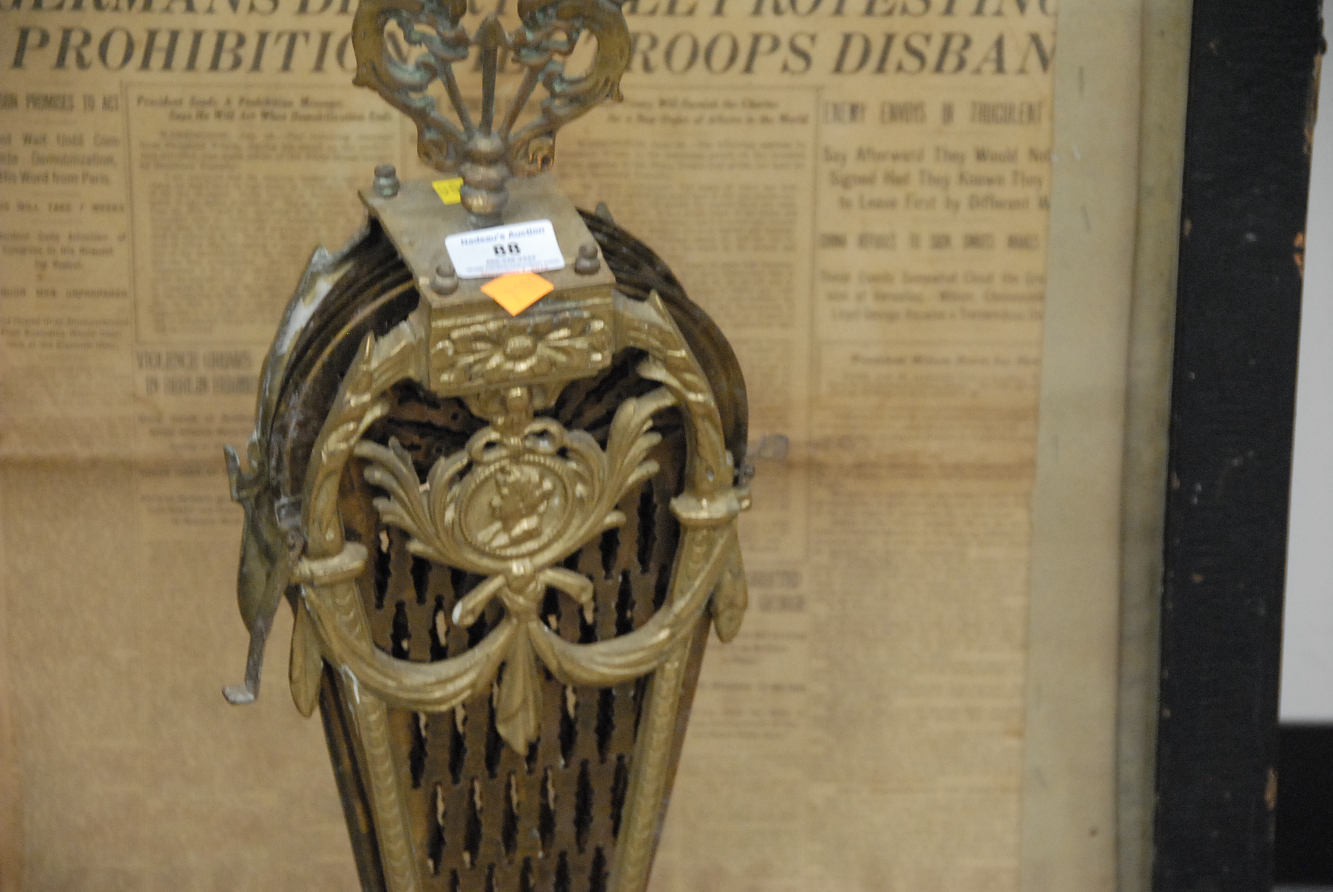 Lot 88: Two piece lot including Victorian shadow box with 1919 & 1948 newspaper headlines inside glass as is and a brass fire fan.