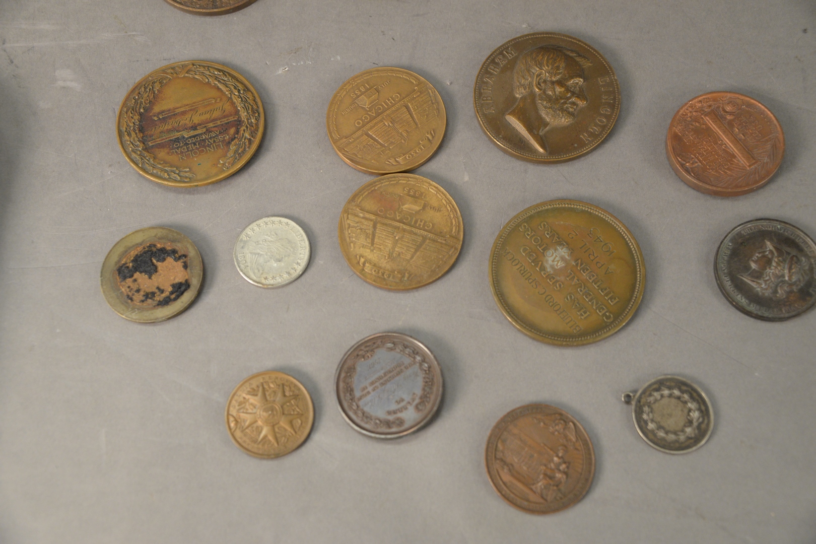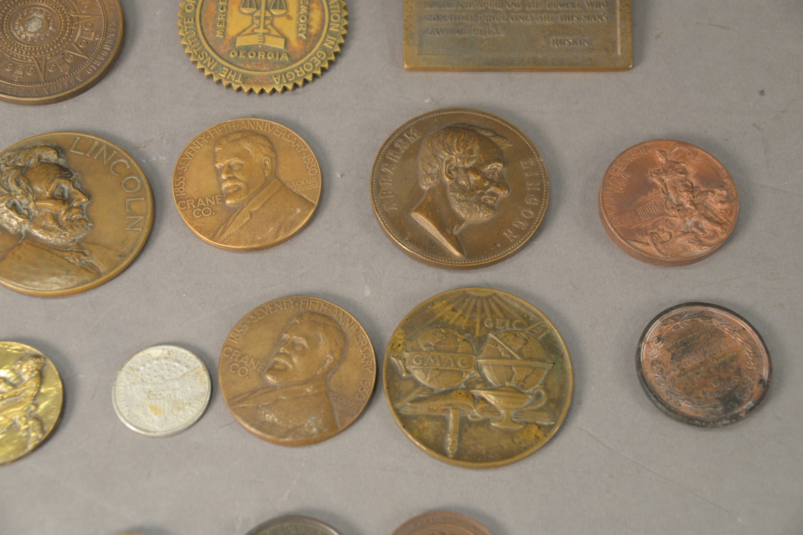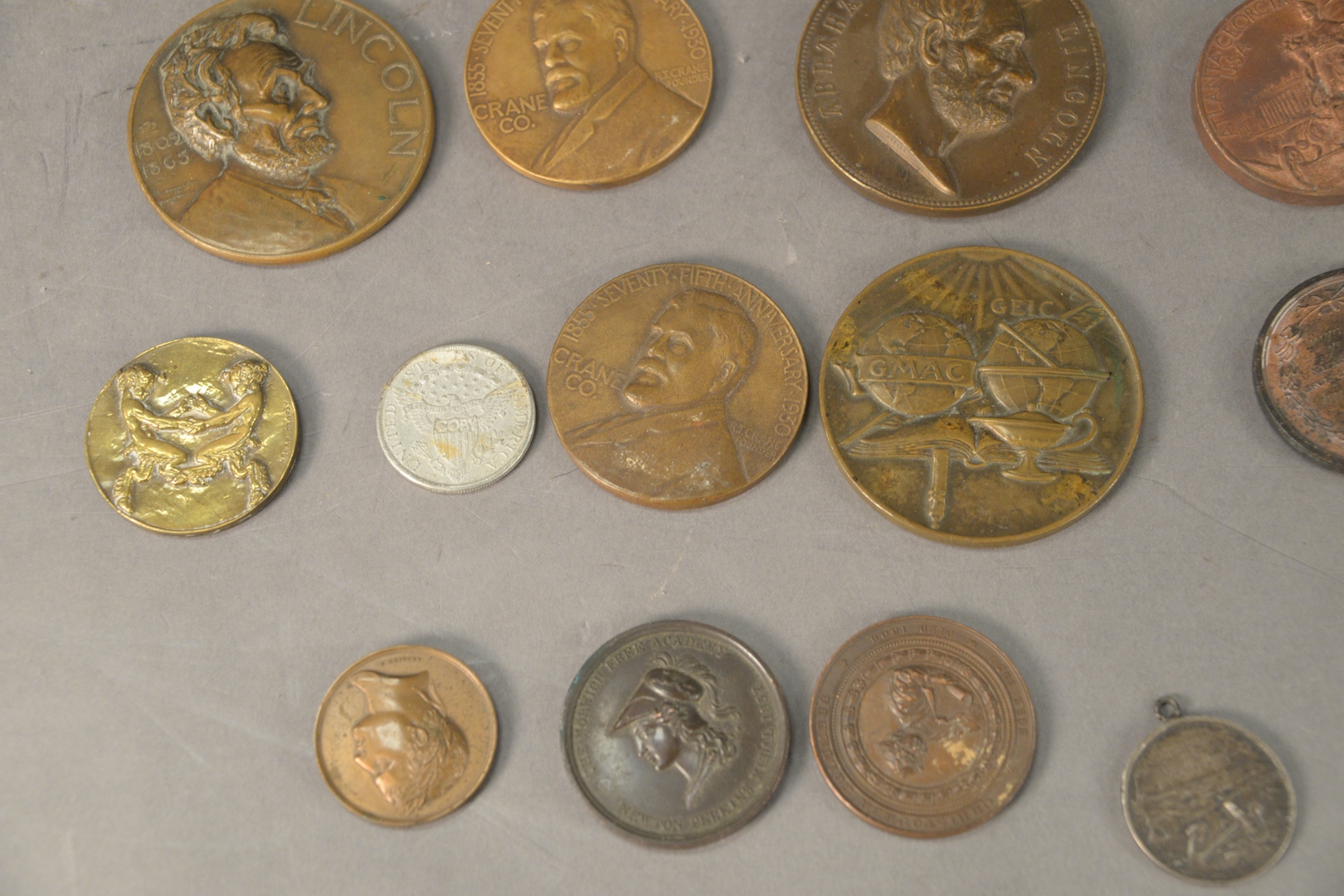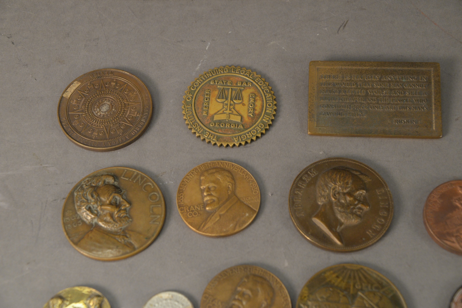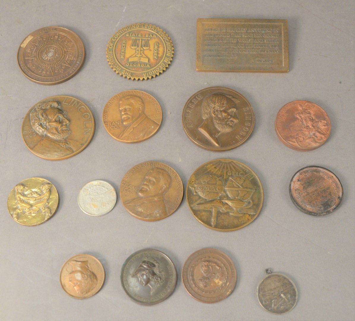 Lot 881: Group of Sixteen Plaques and Medals, to include Lincoln, Crane Company, Mexico, etc., 1 1/2 – 3 inches.