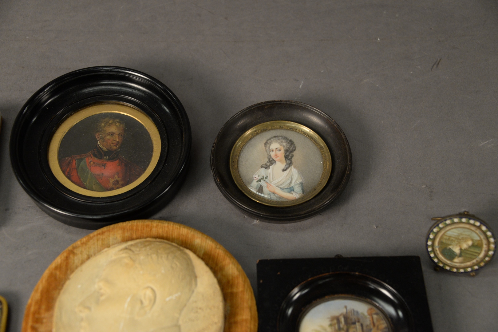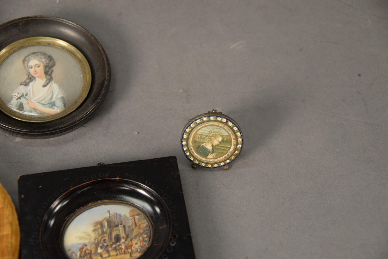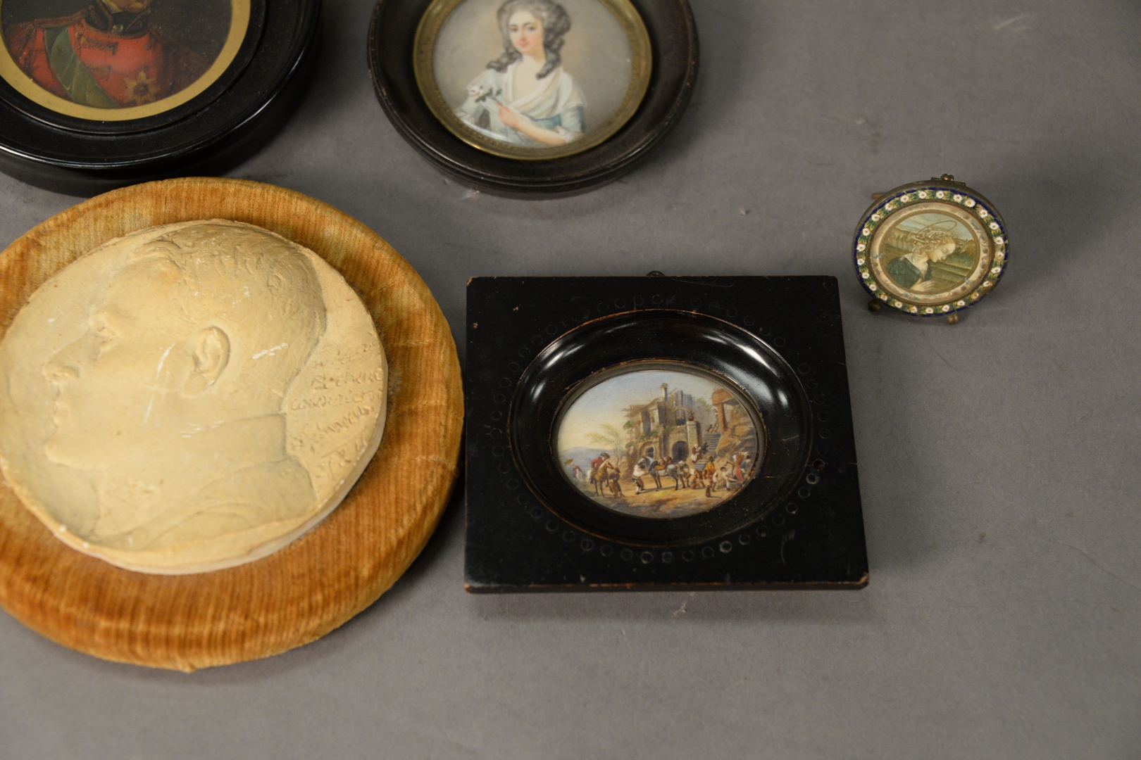 Lot 883: Group of Seven Framed Miniature Paintings, largest diameter 6 inches.