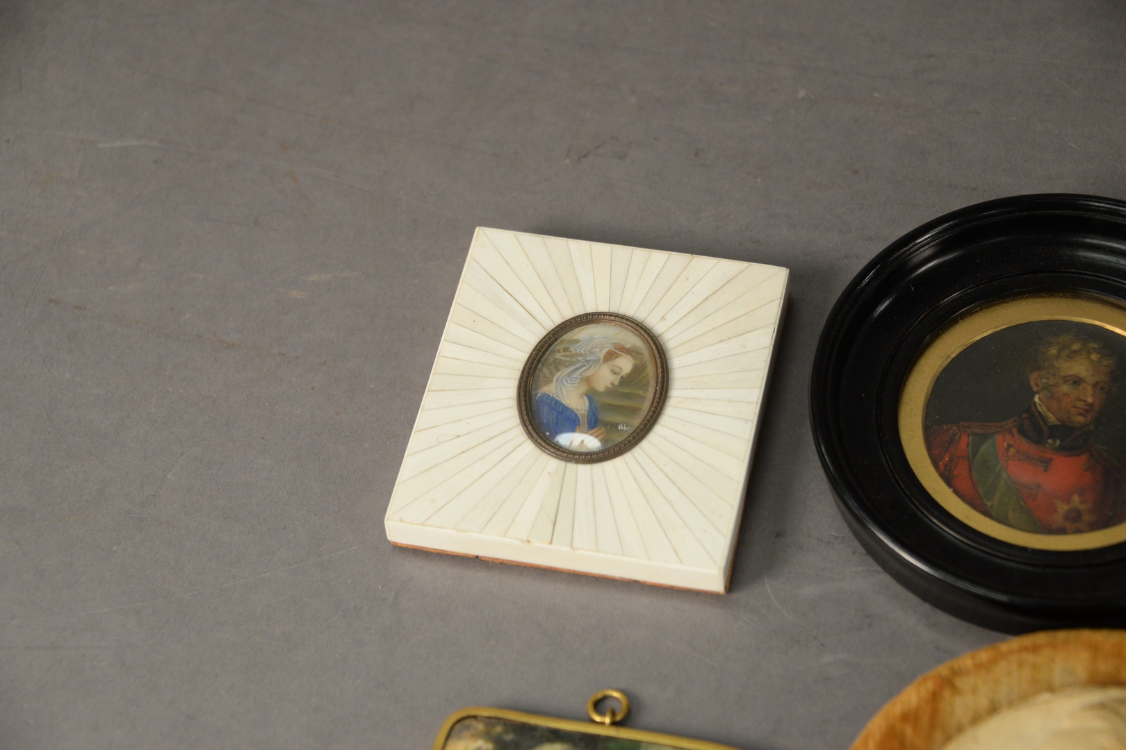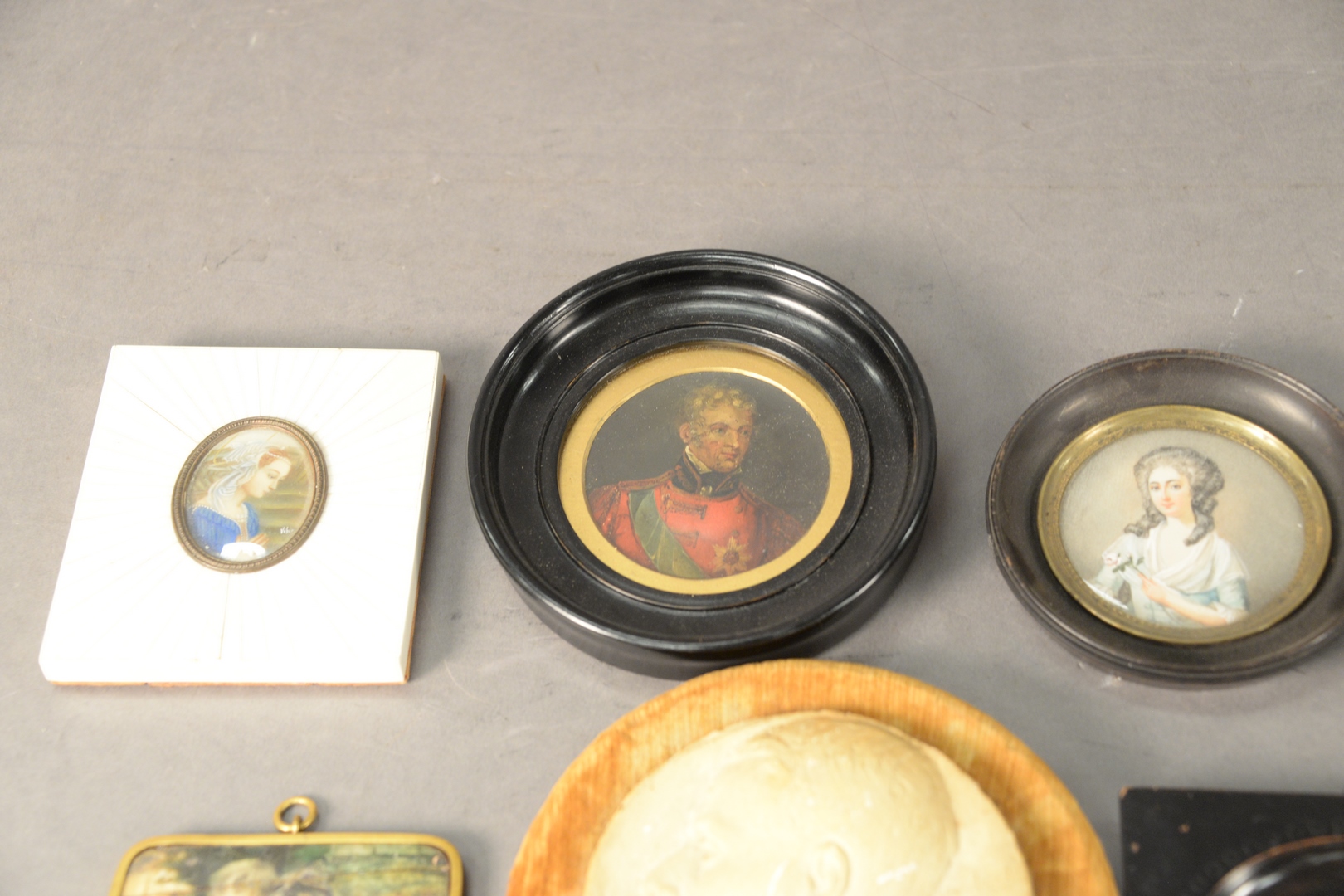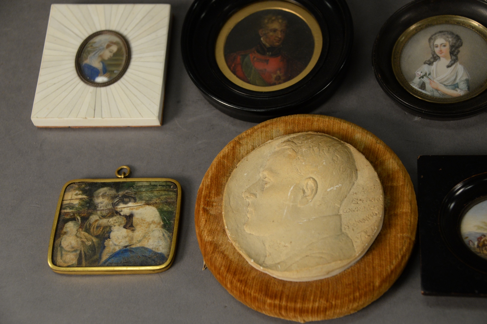 Lot 883: Group of Seven Framed Miniature Paintings, largest diameter 6 inches.