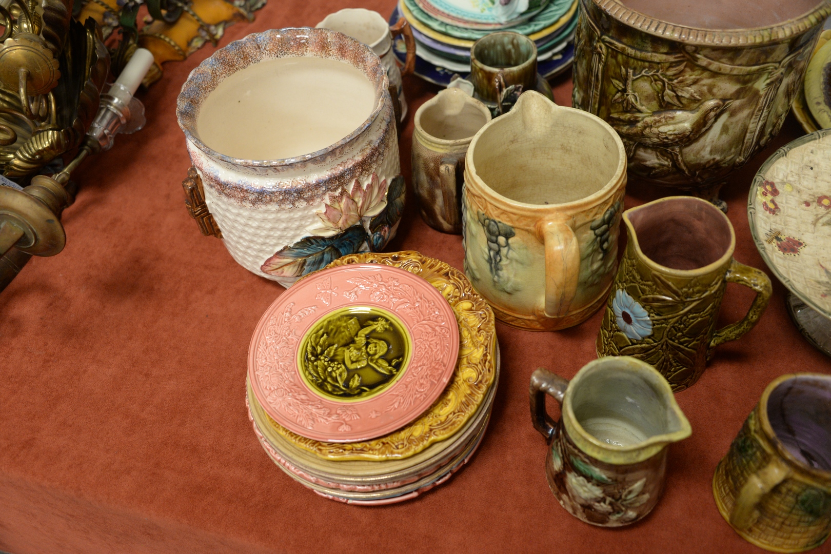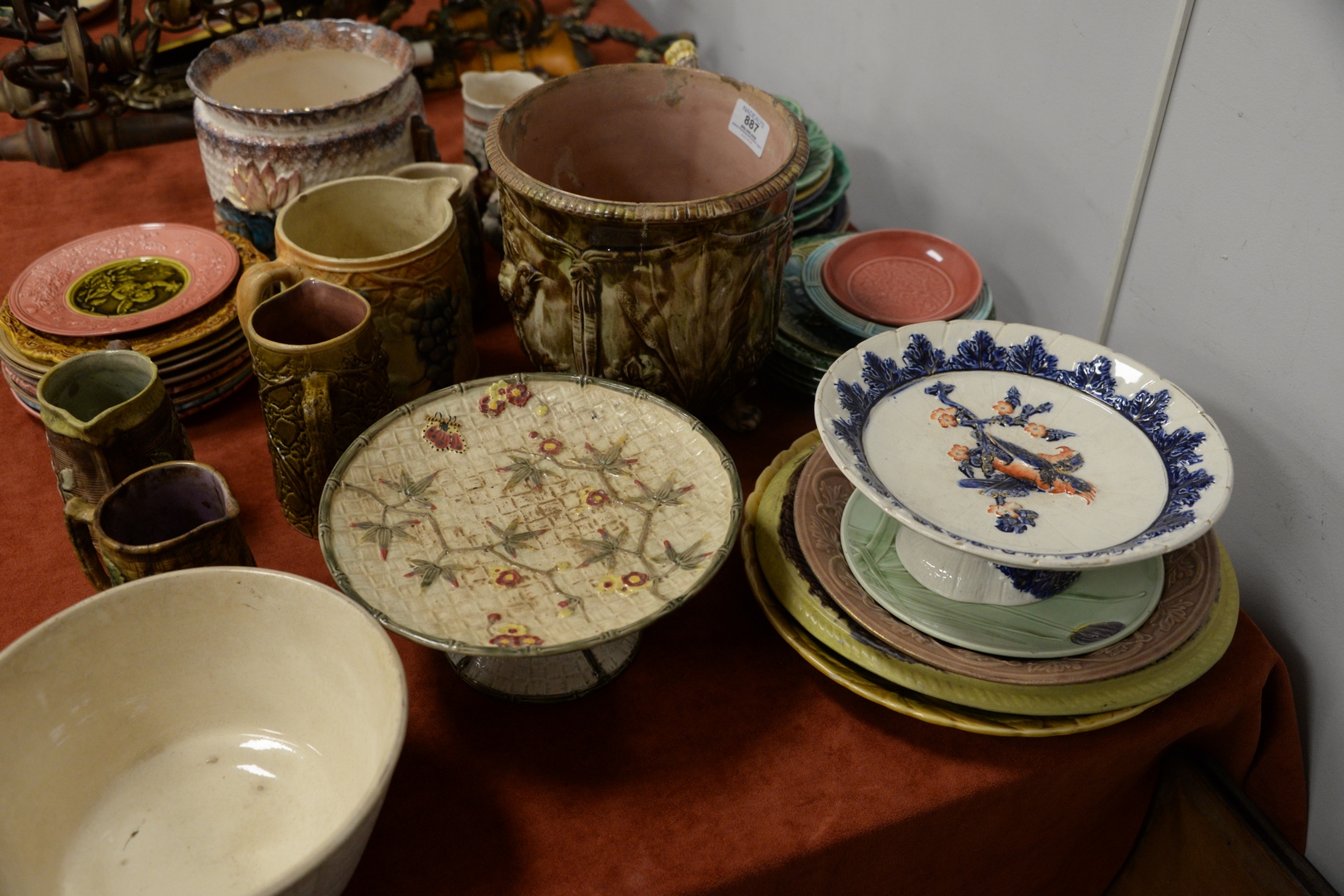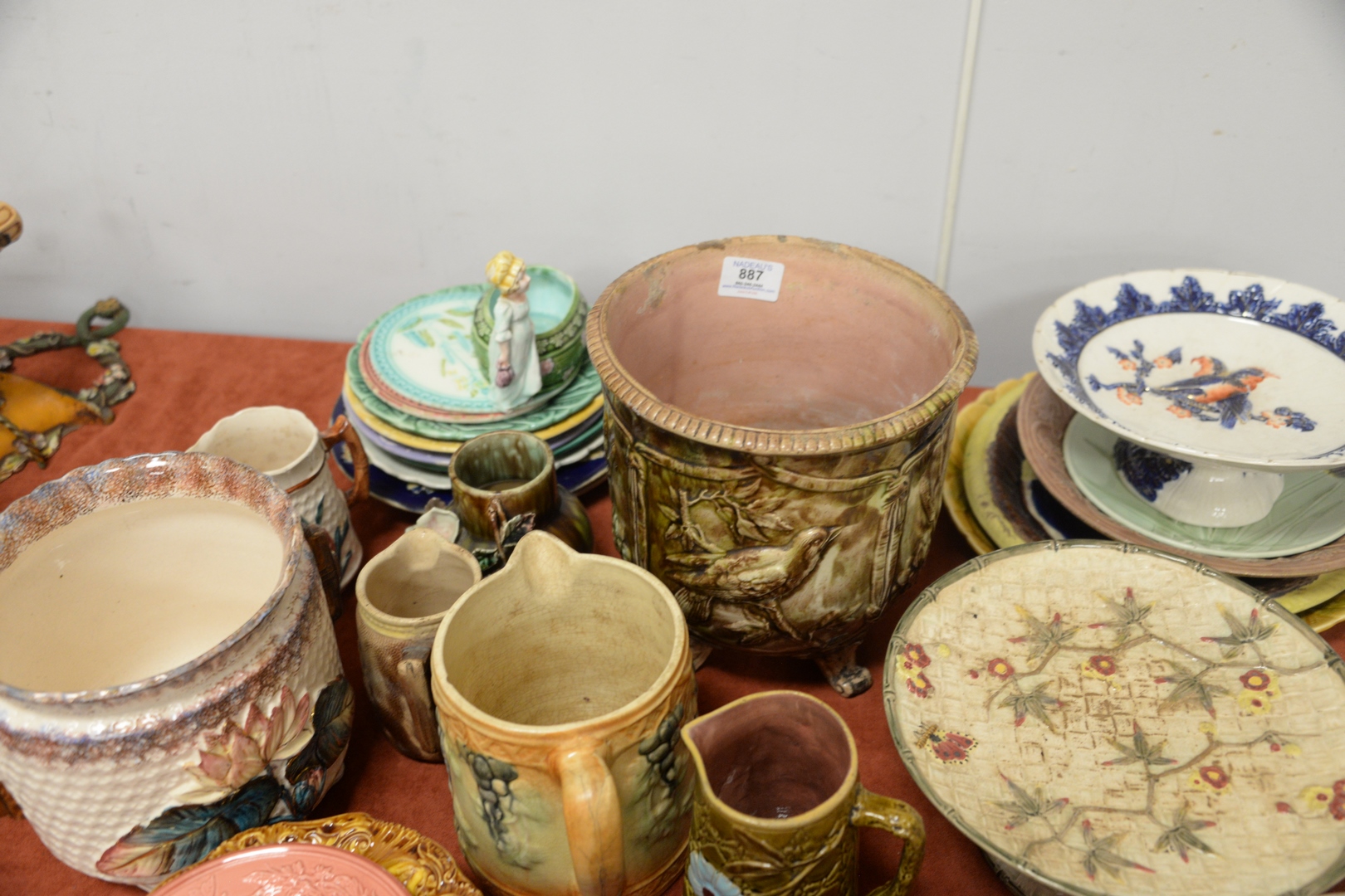 Lot 887: Large Group of Majolica, to include three small brown pitchers one serving platter with butterflies a platter with fruit motif a …