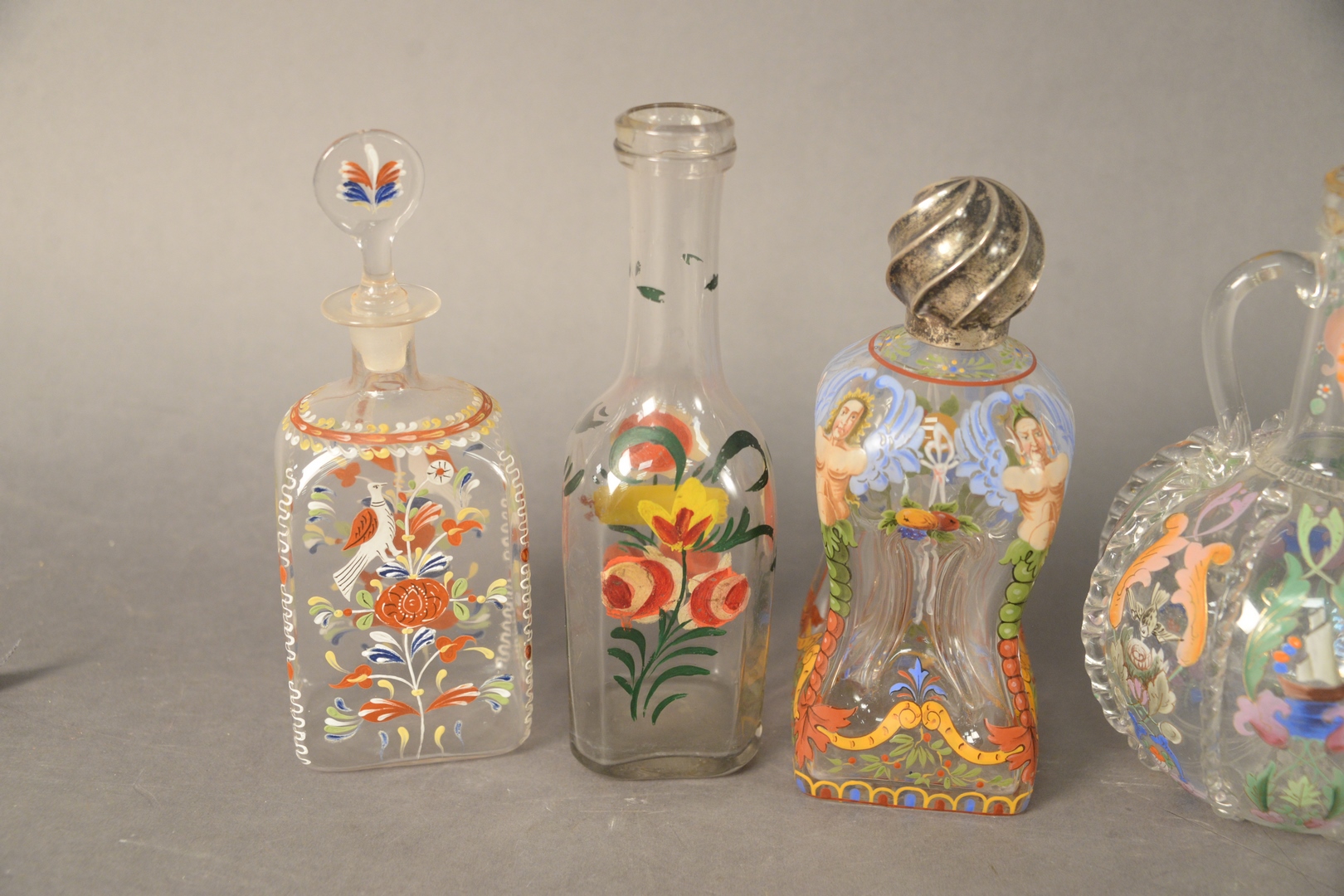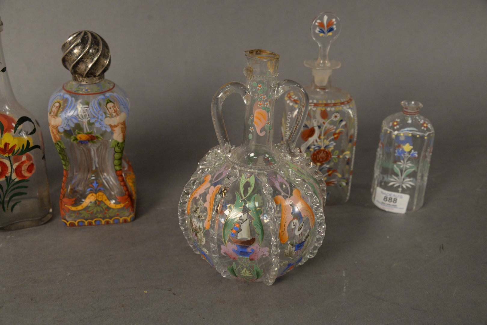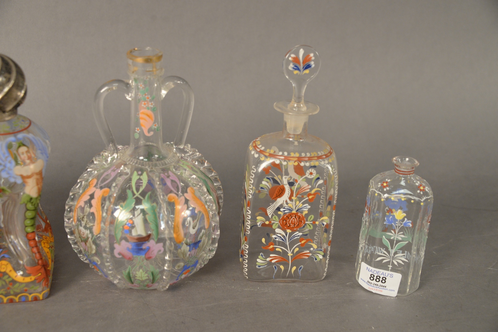 Group of Six Enameled Glass Bottles, tallest 9 inches.