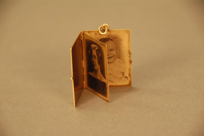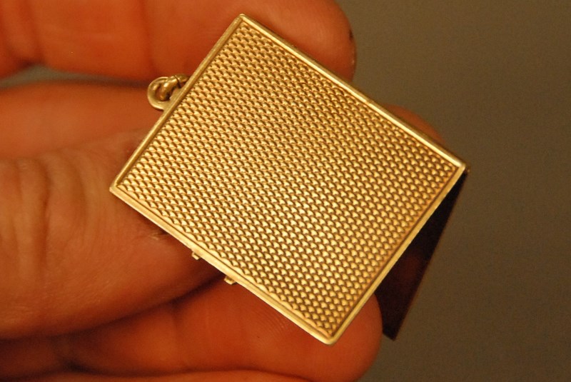 14k gold locket with three photos on gold pages. 1 1/4 x 1 20.5 grams