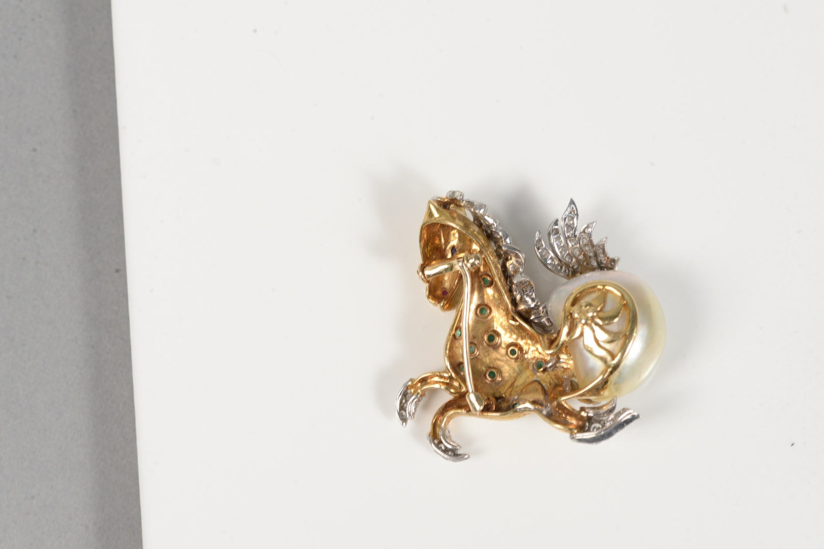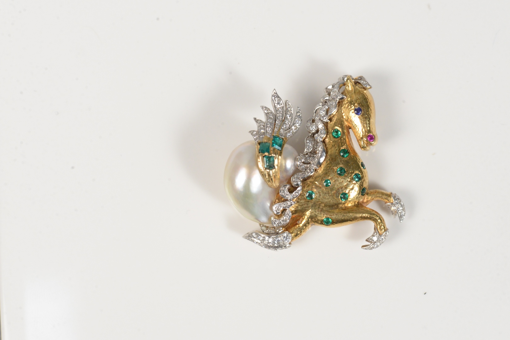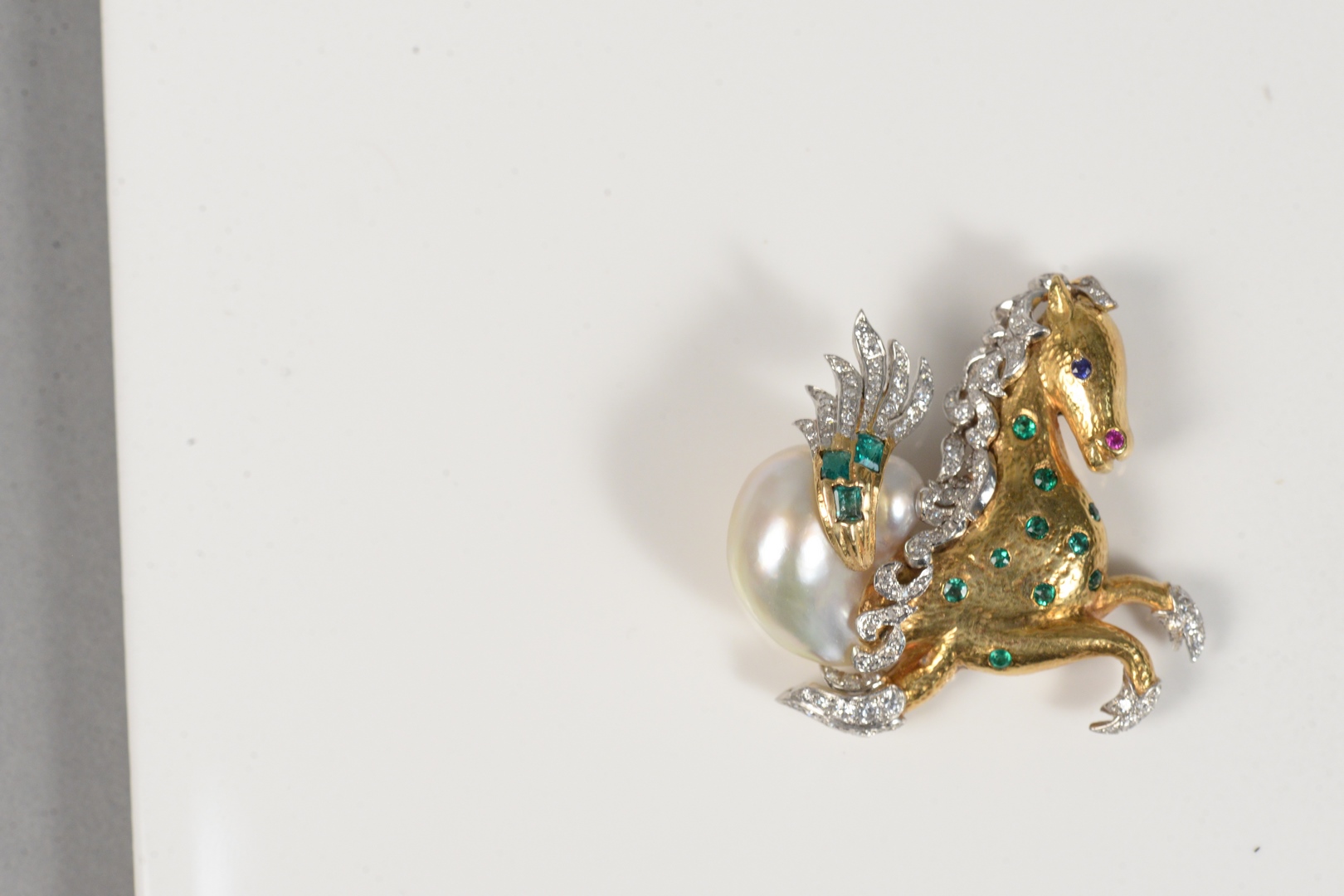 Lot 89: 18 Karat Gold and White Horse Brooch set with emeralds, diamonds, ruby and pearl height 1 1/2 inches 22.3 grams Provenance: Estate o…