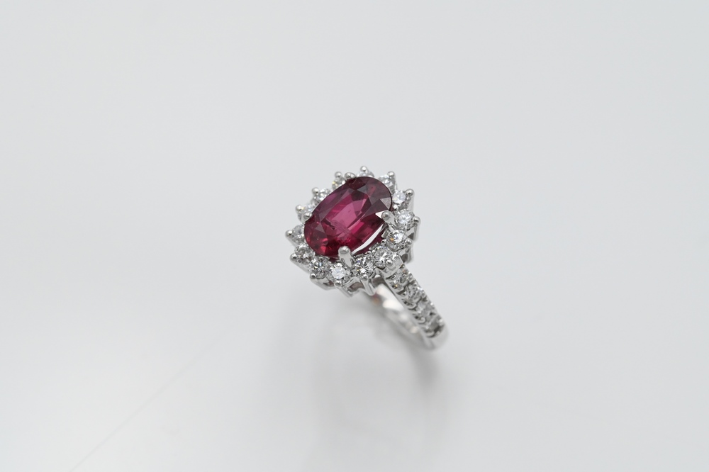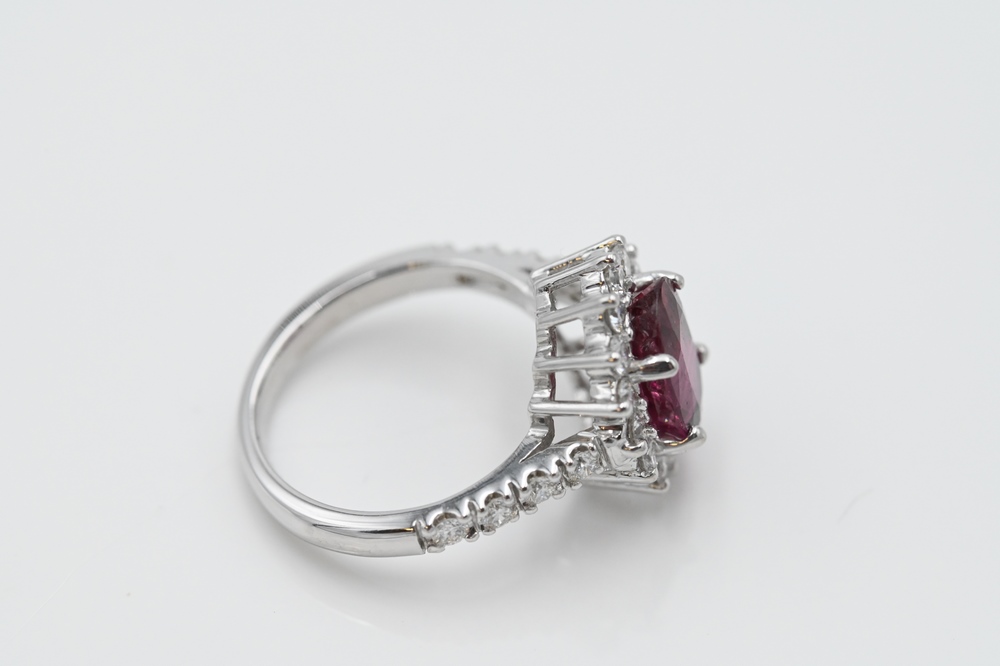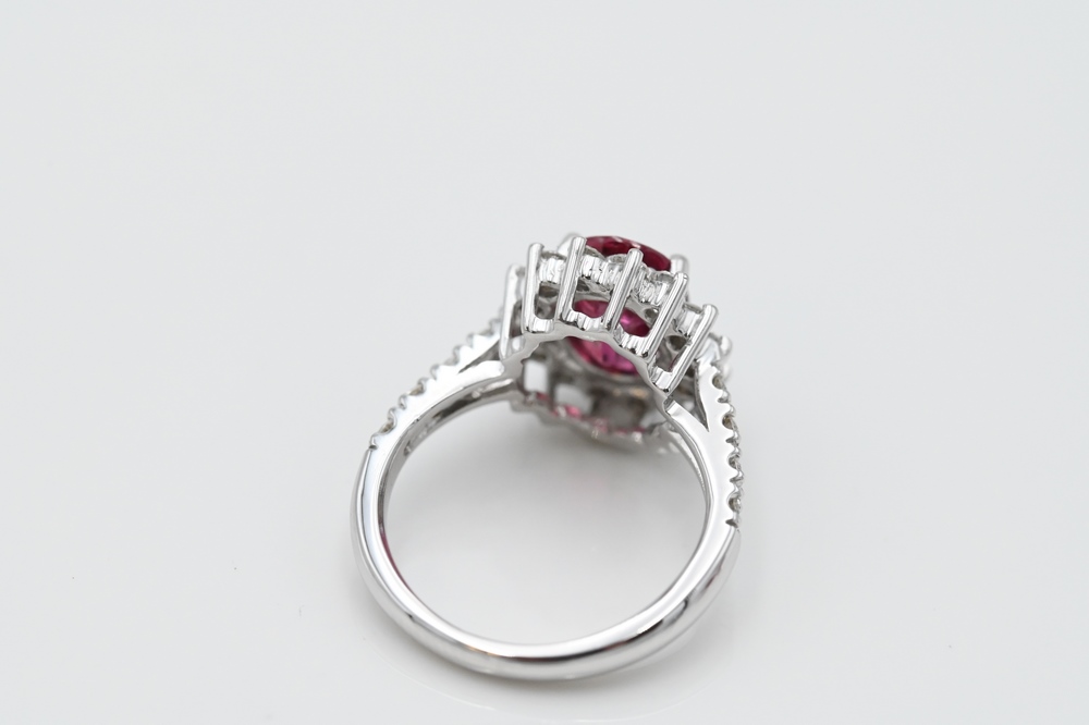 18 Karat White Gold Ring, set with oval brilliant cut ruby, 2.42 carats; surrounded by 14 diamonds; 8 diamonds on ring; along with G.I.A. report and an appraisal, size 4 1/3.