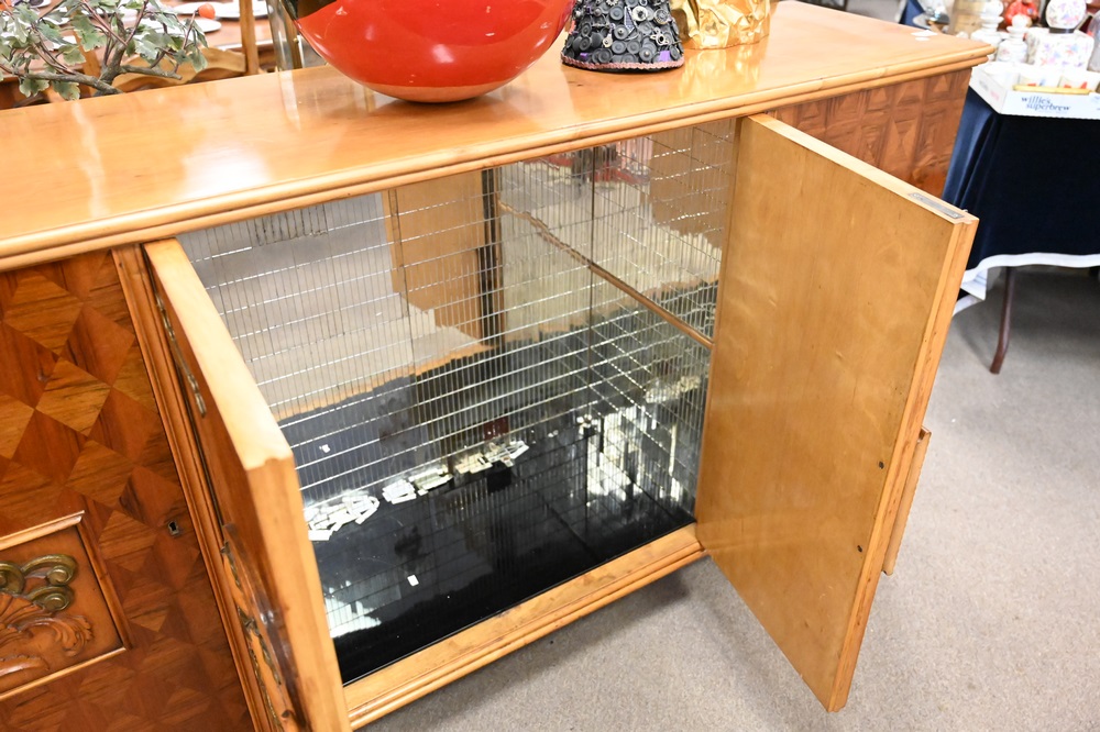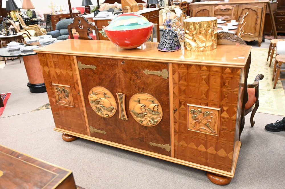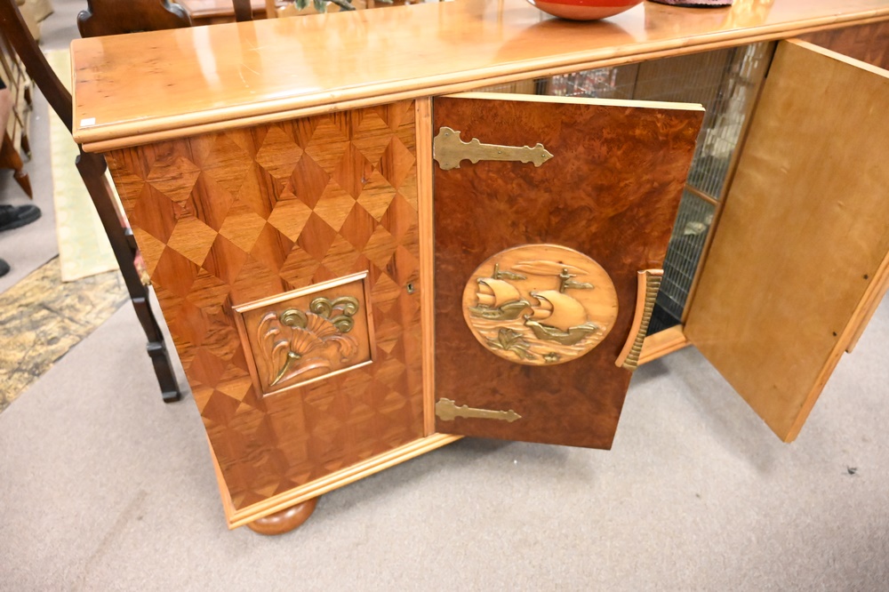 Lot 89: Art Deco Server, having two center burl doors flanked by two Parquet doors, all with carved designs opening to mirrored interior (as is), height 40 1/2 inches, top 18″ x 73″.