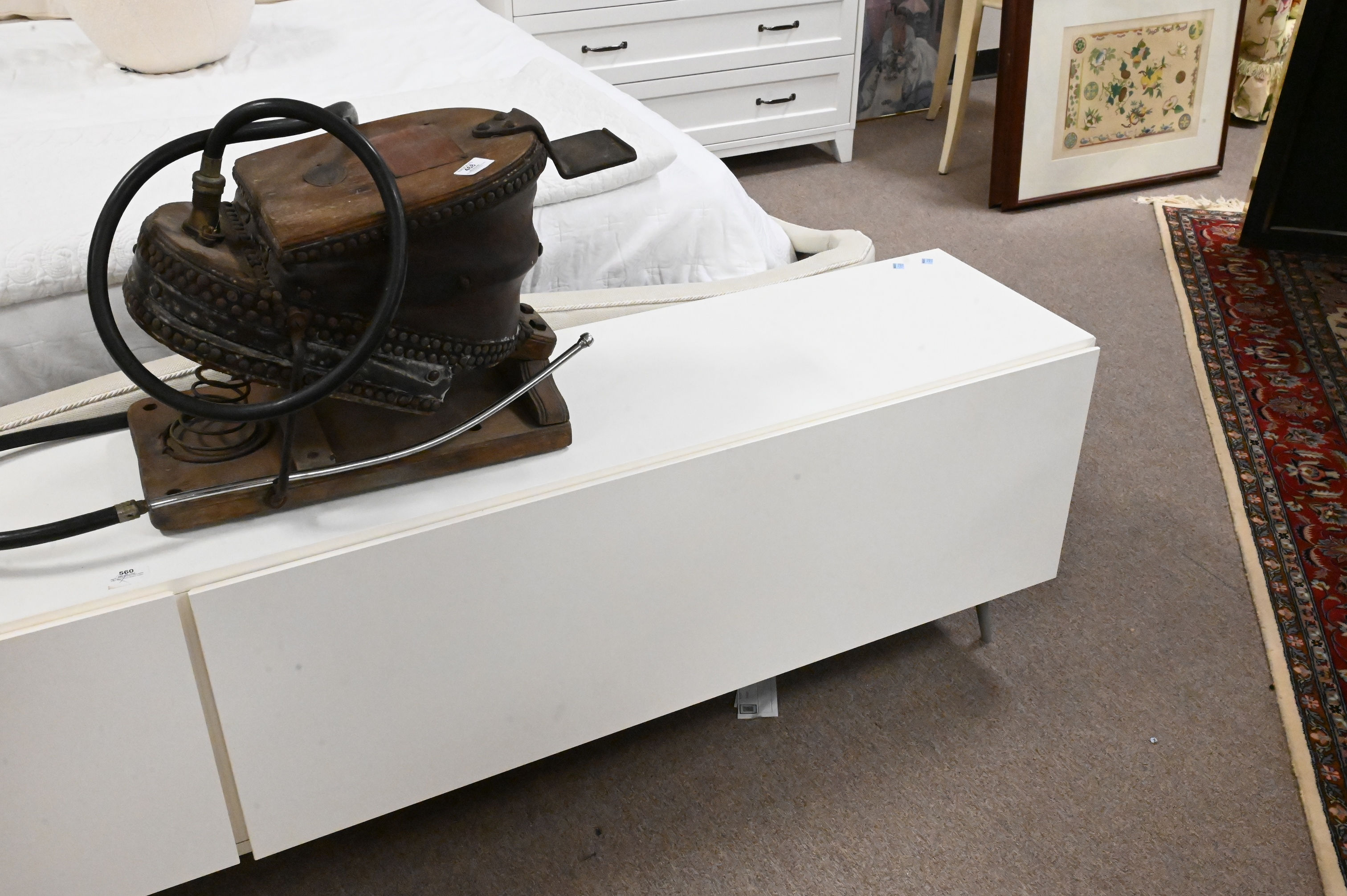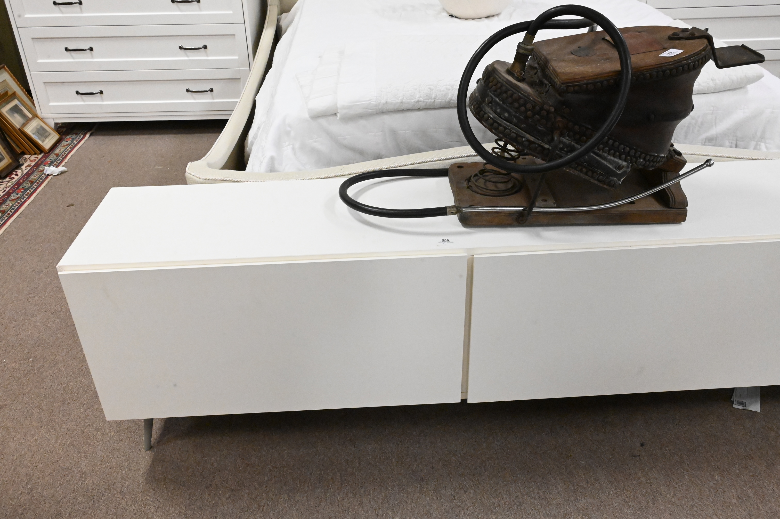 entertainment unit having two drop down drawers set on four metal feet, retails for $2,000,