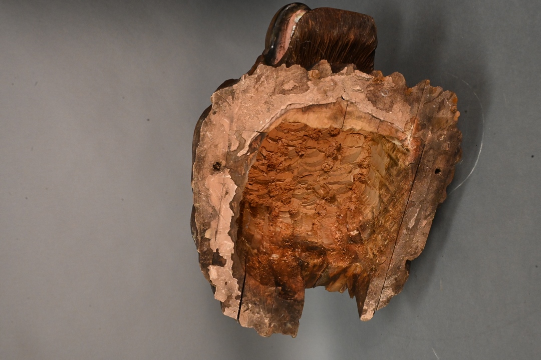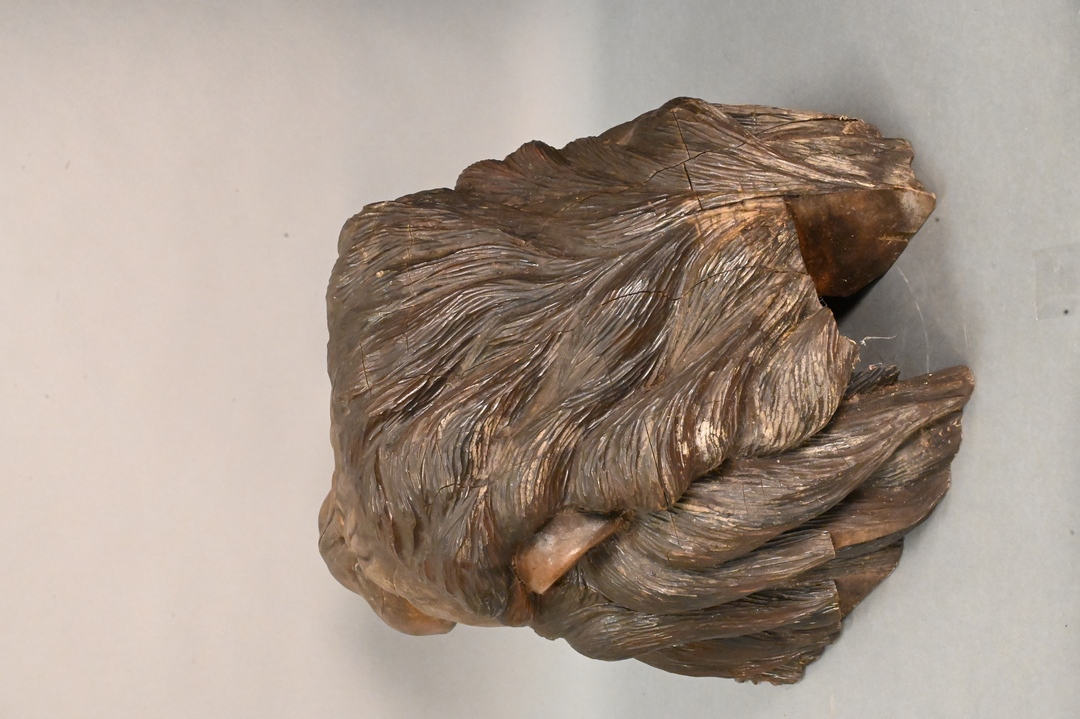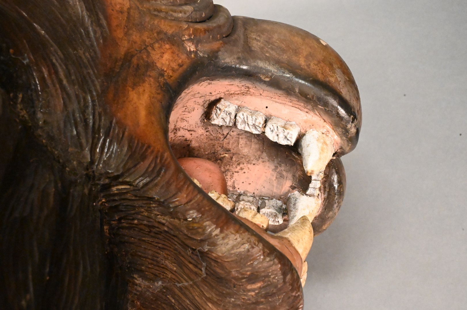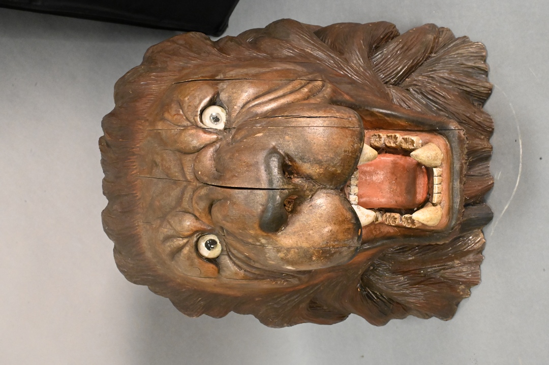 Carved Carousel Type Lion Head, having glass eyes, height 17 inches, width 17 inches.