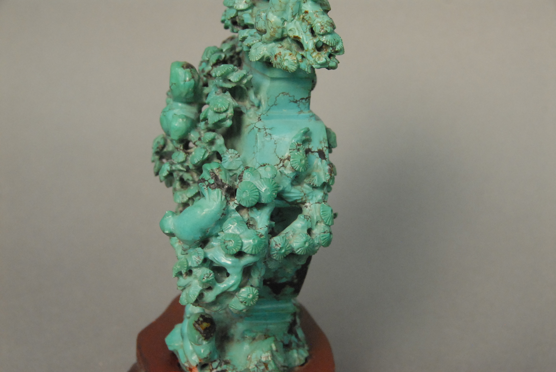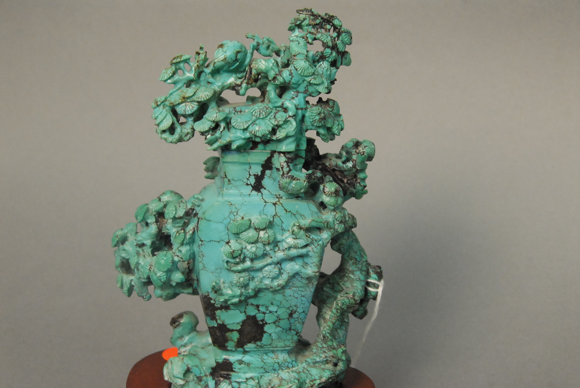 Lot 89: Carved turquois covered vase having large scrolling pine with carved squirrels, ht. 5, wd. 5 1/4.