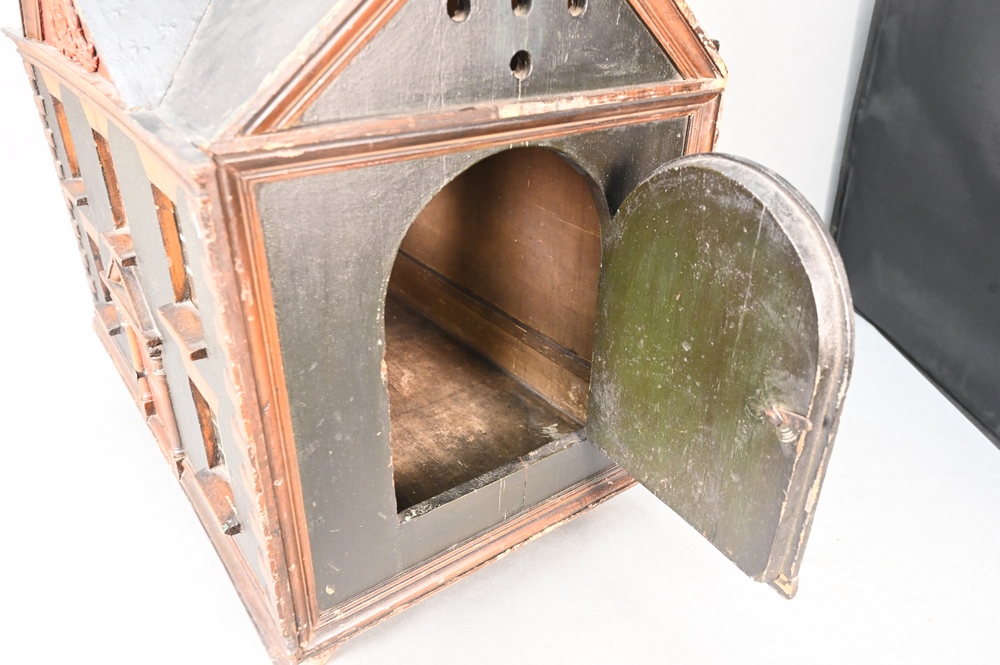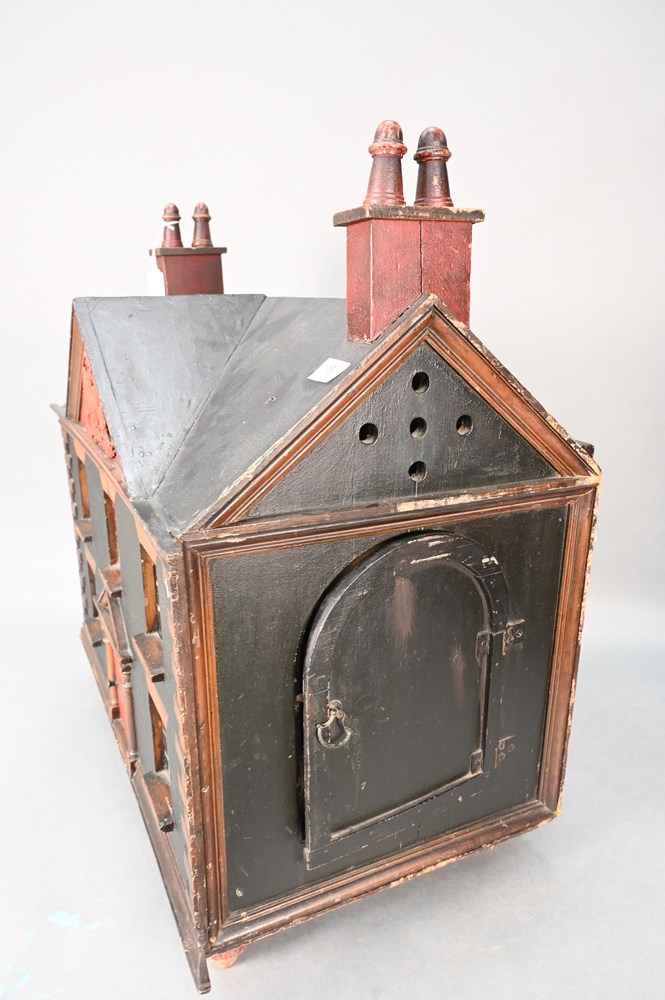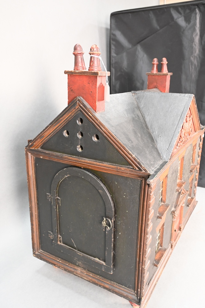Lot 89: Cat or Small Dog House, in form of an English house, on turned legs, height 29 inches, length 29 inches, depth 17 inches.