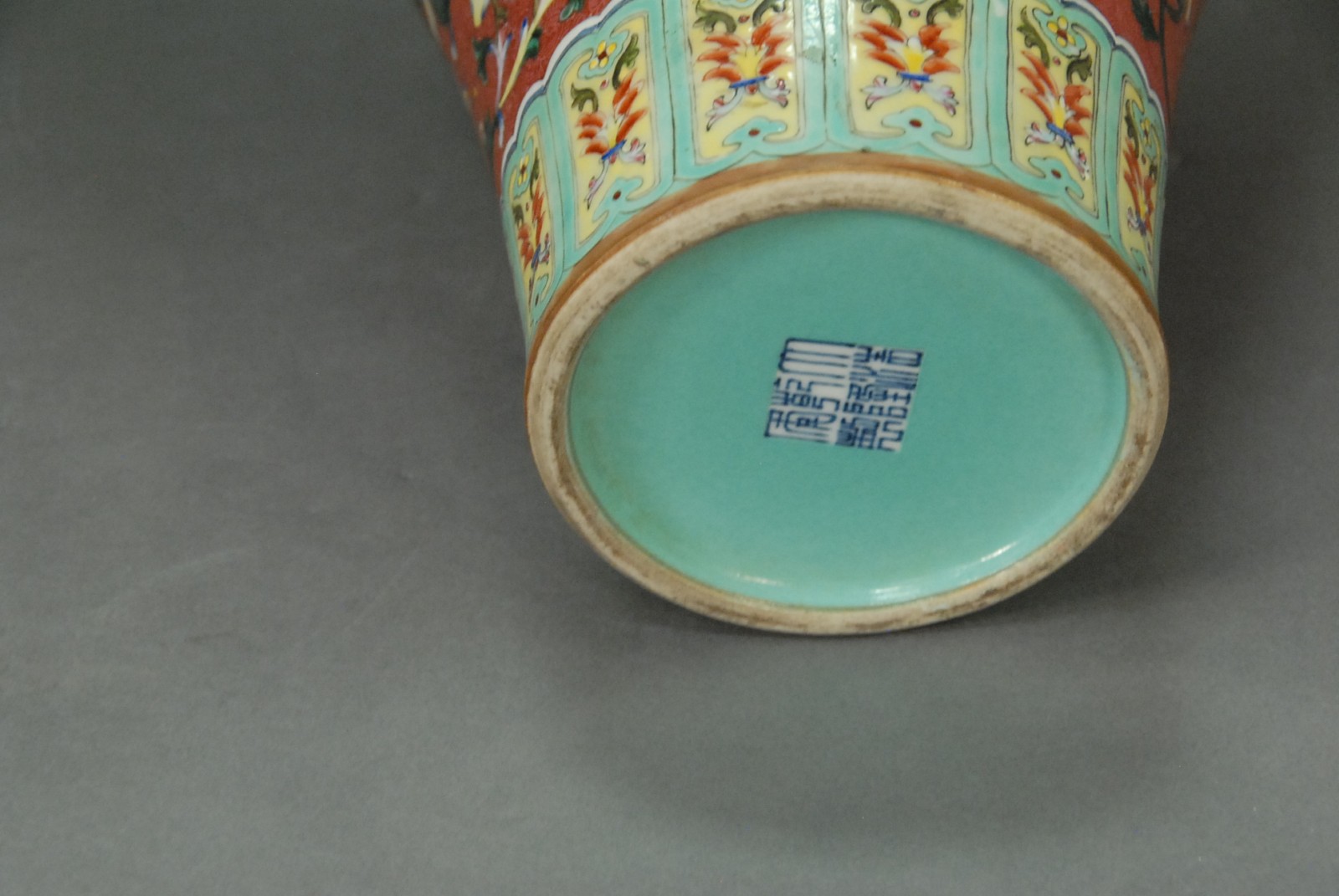 Famille rose Meiping form vase having mauve base color and overall, multi-colored vines and wild flower decoration.