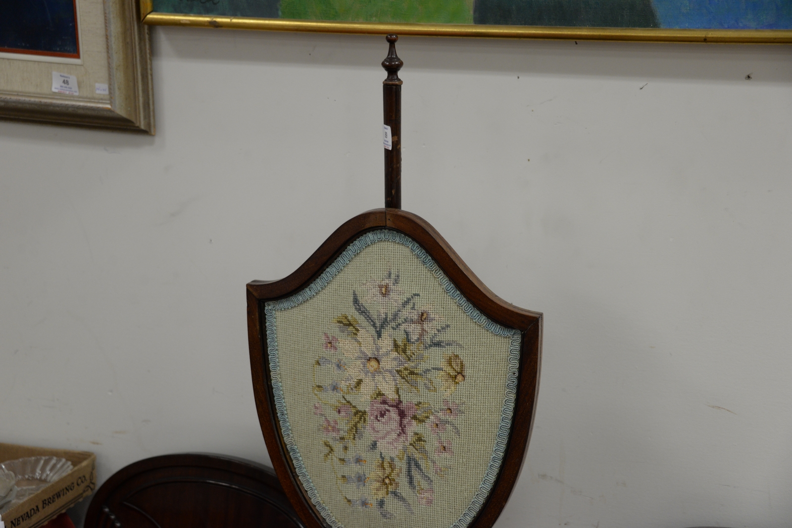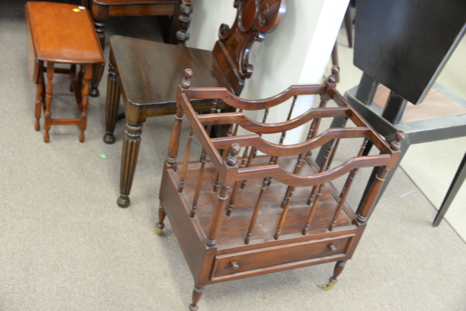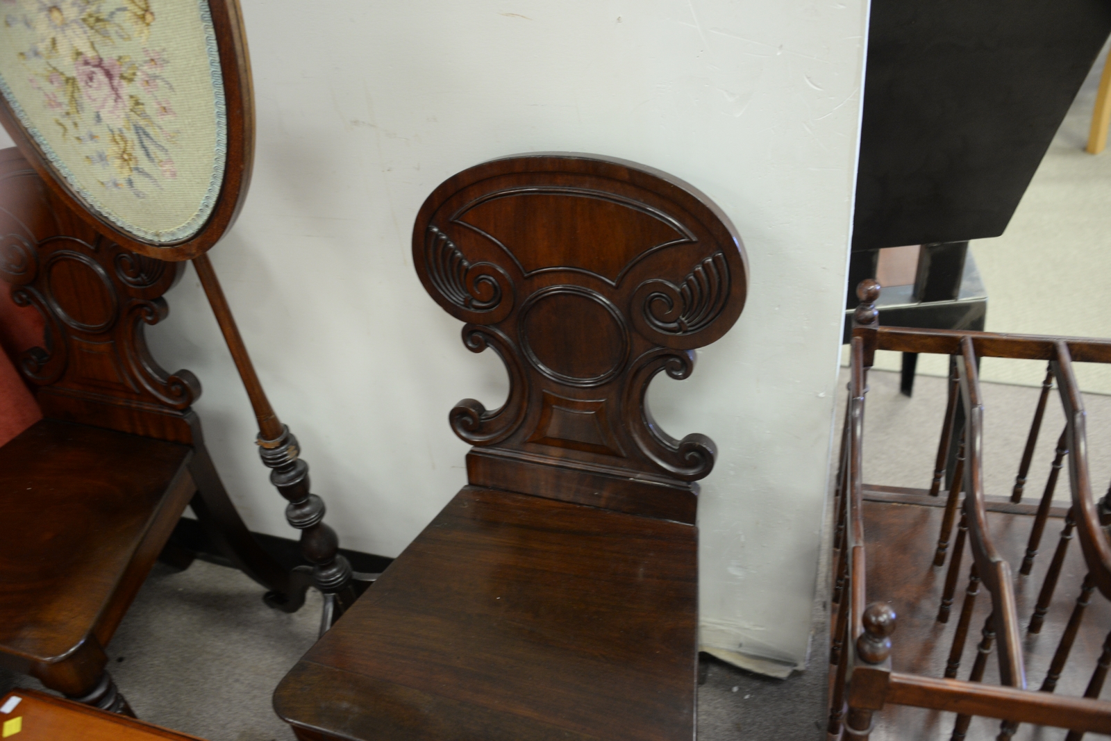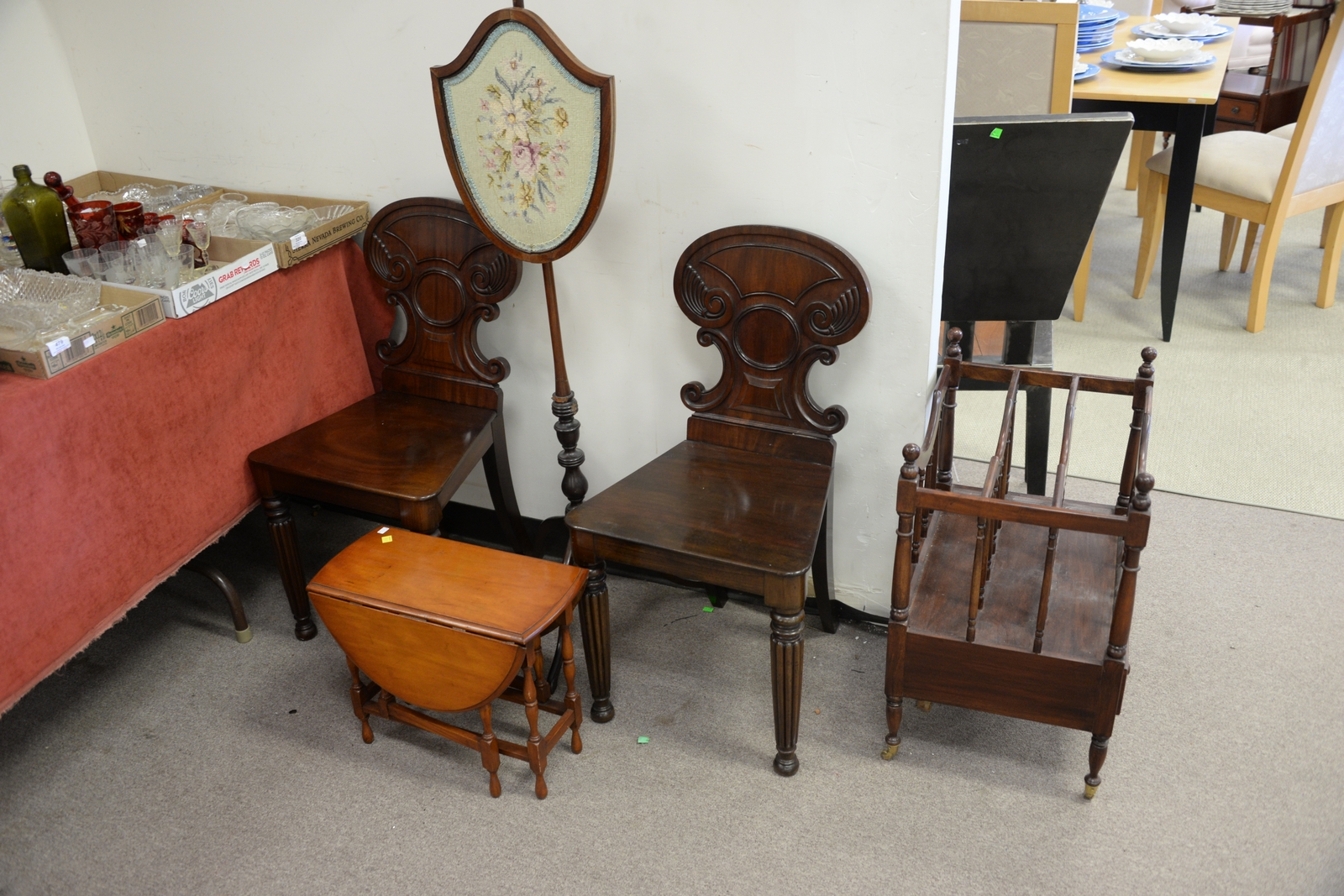 Lot 89: Five piece lot to include a pair of carved side chairs, a canterbury, miniature gateleg table, and pole screen ht. 55in.