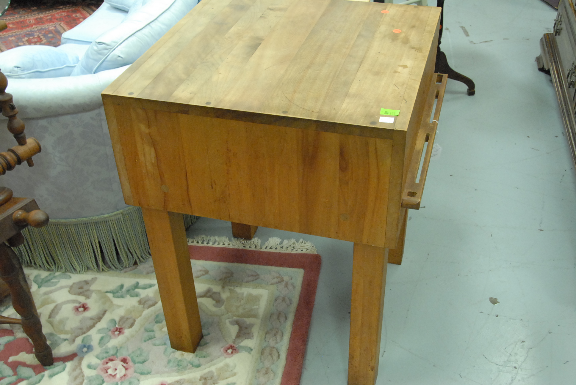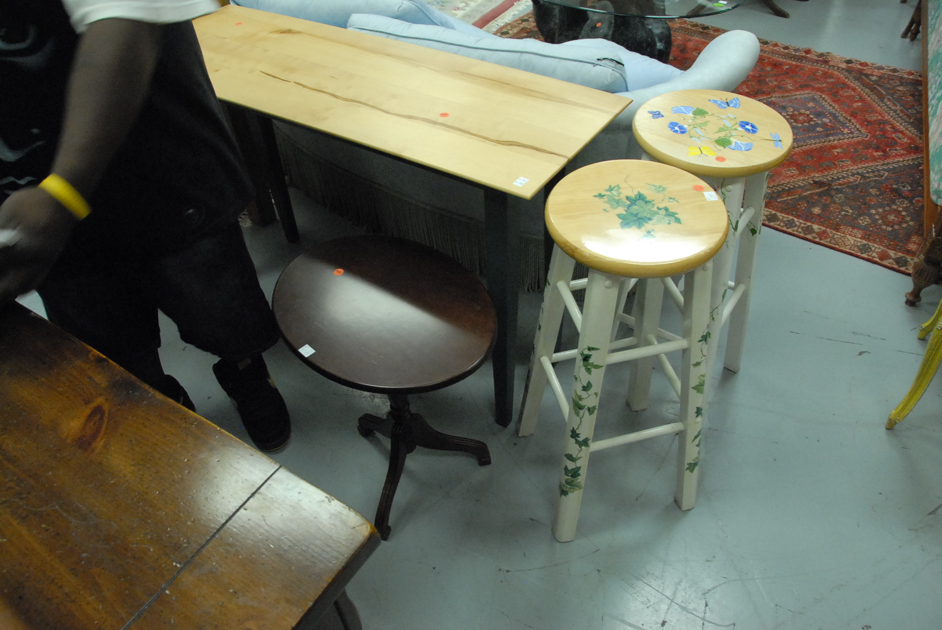 Five piece lot to include two stools, a table, chopping block, and a small oval stand.