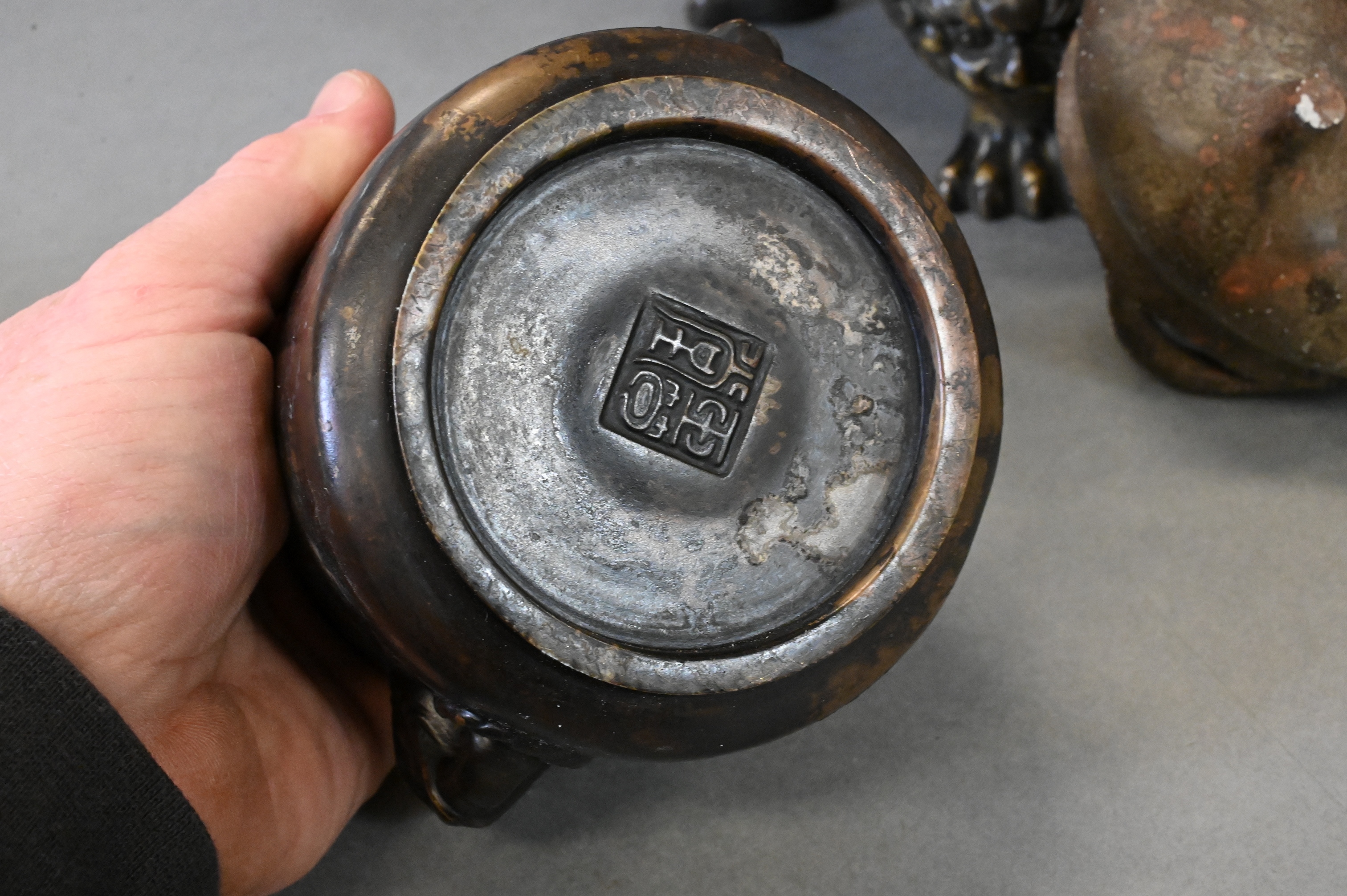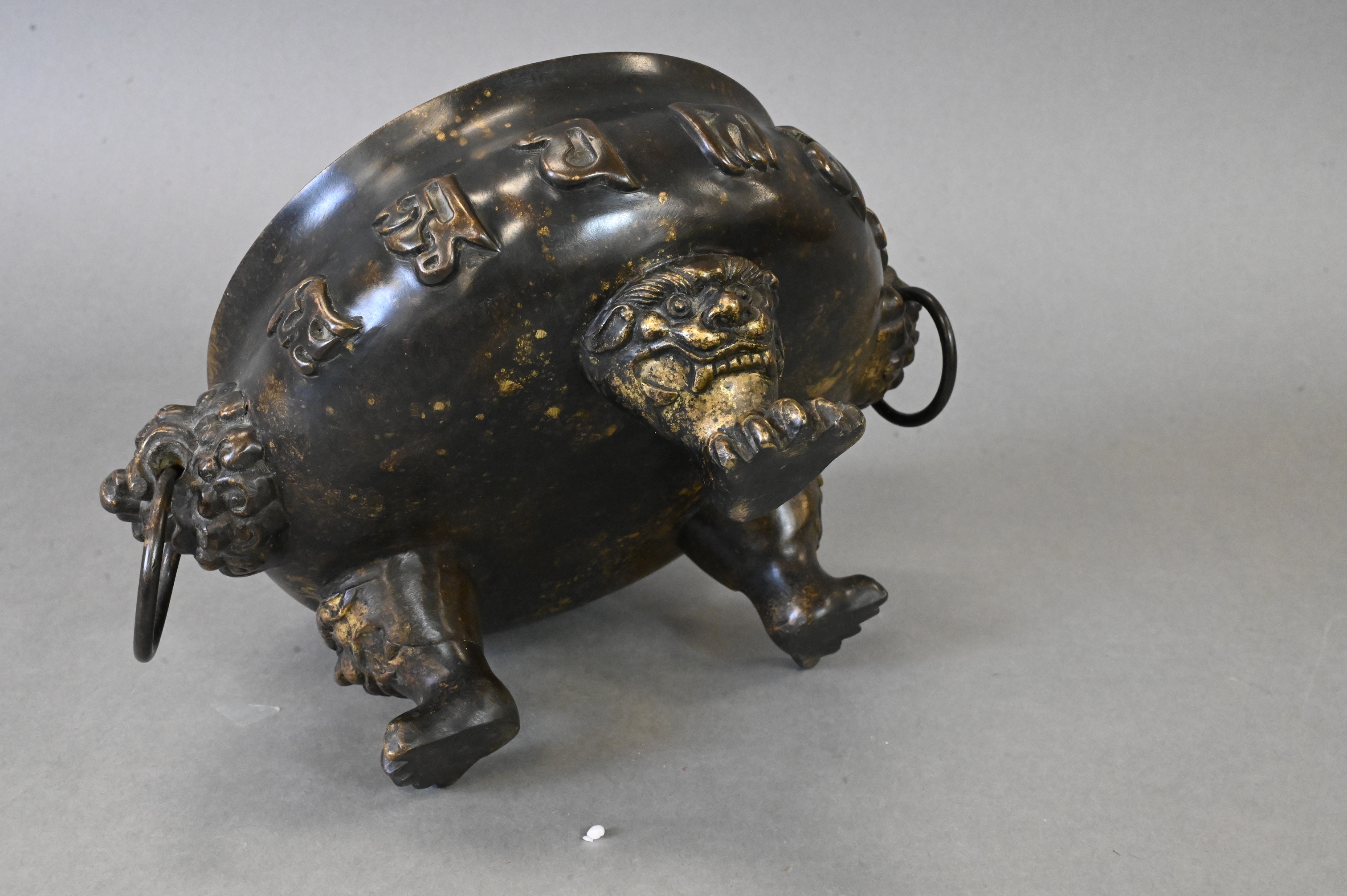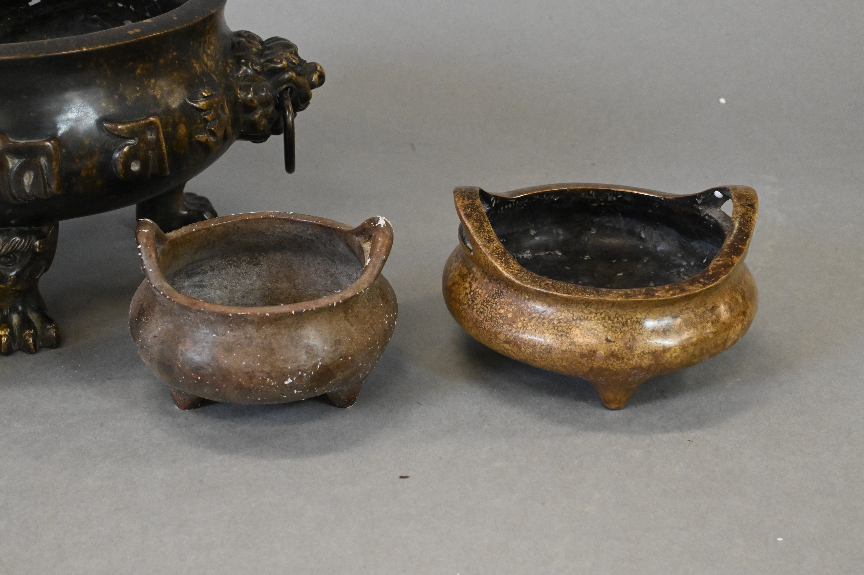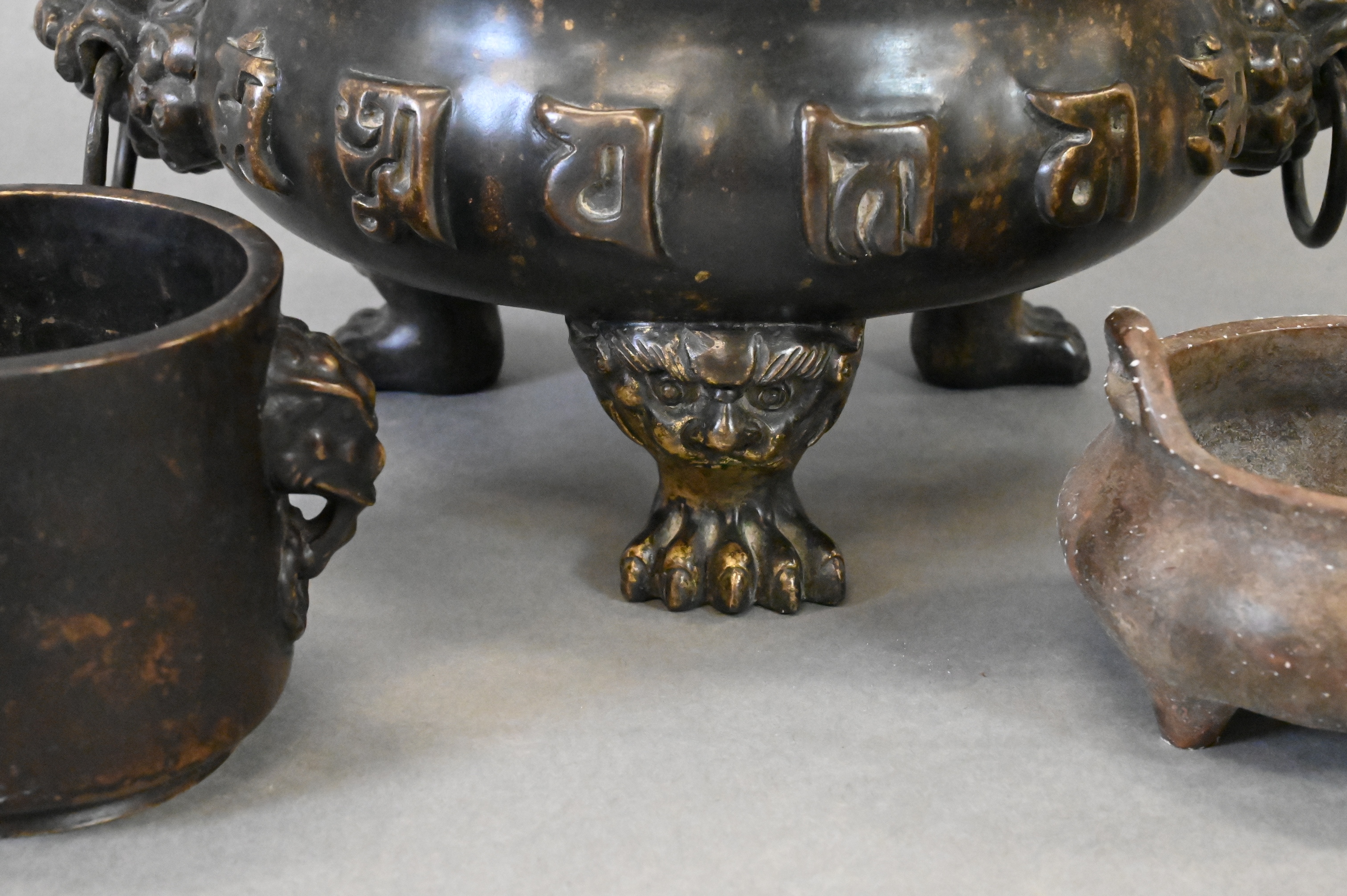 to include patinated bronze censer raised on three paw feet with lion mask handles, smaller vessel having elephant mask handles, pair of smaller gilt vessels along with additional smaller vessel
