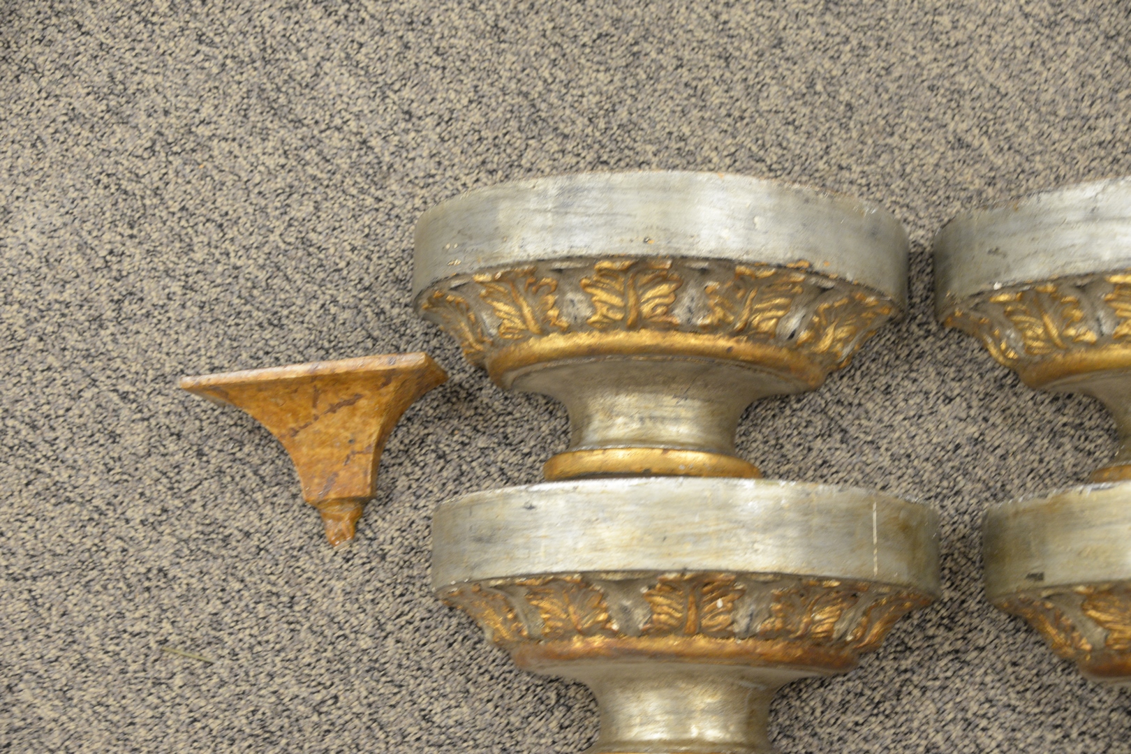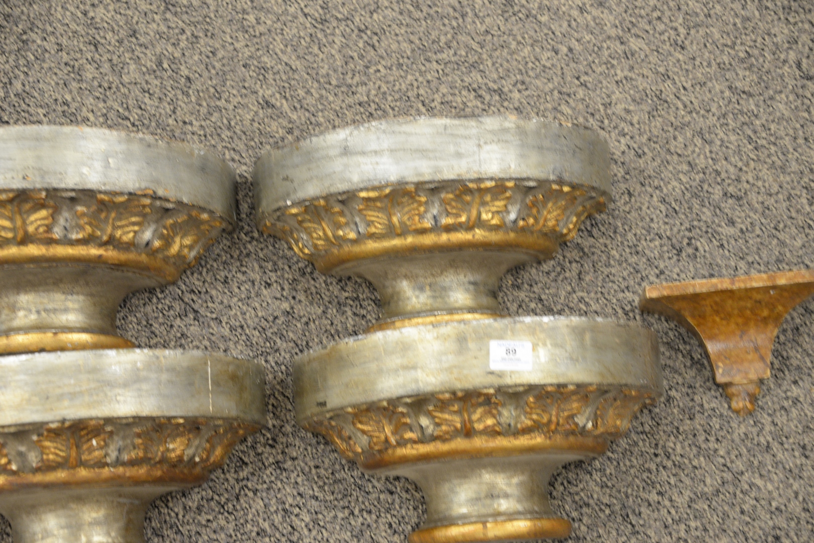 Lot 89: Group of Six Italian Carved Wood Brackets, to include a set of four demilune brackets along with a pair of small rectangular brackets, largest height 7 1/2 inches, width 14 1/2 inches.