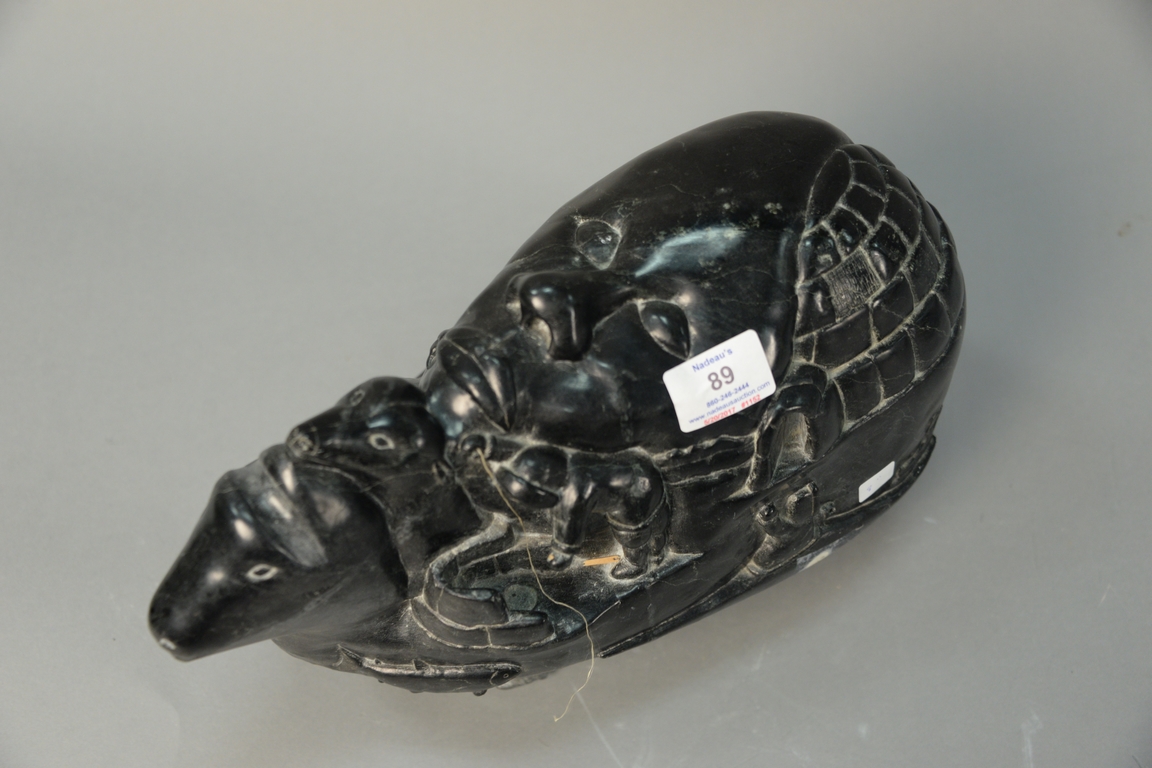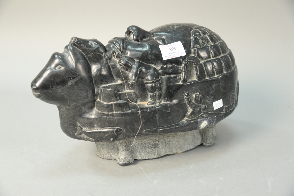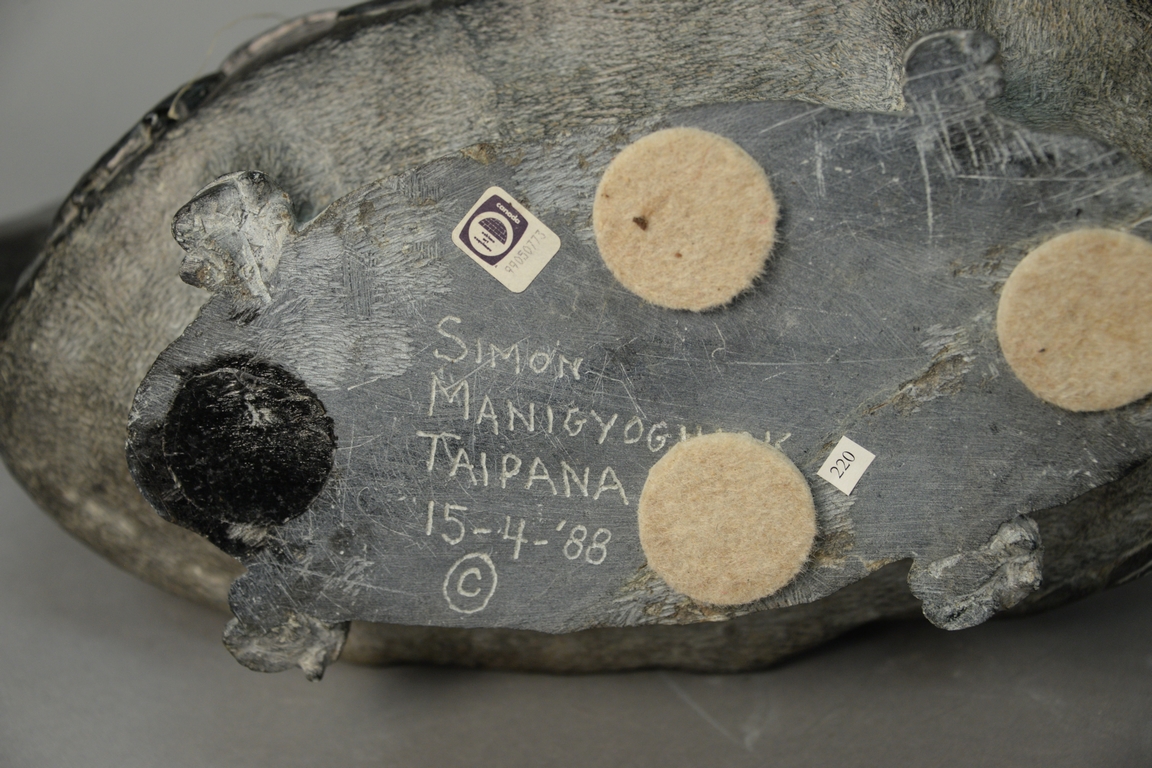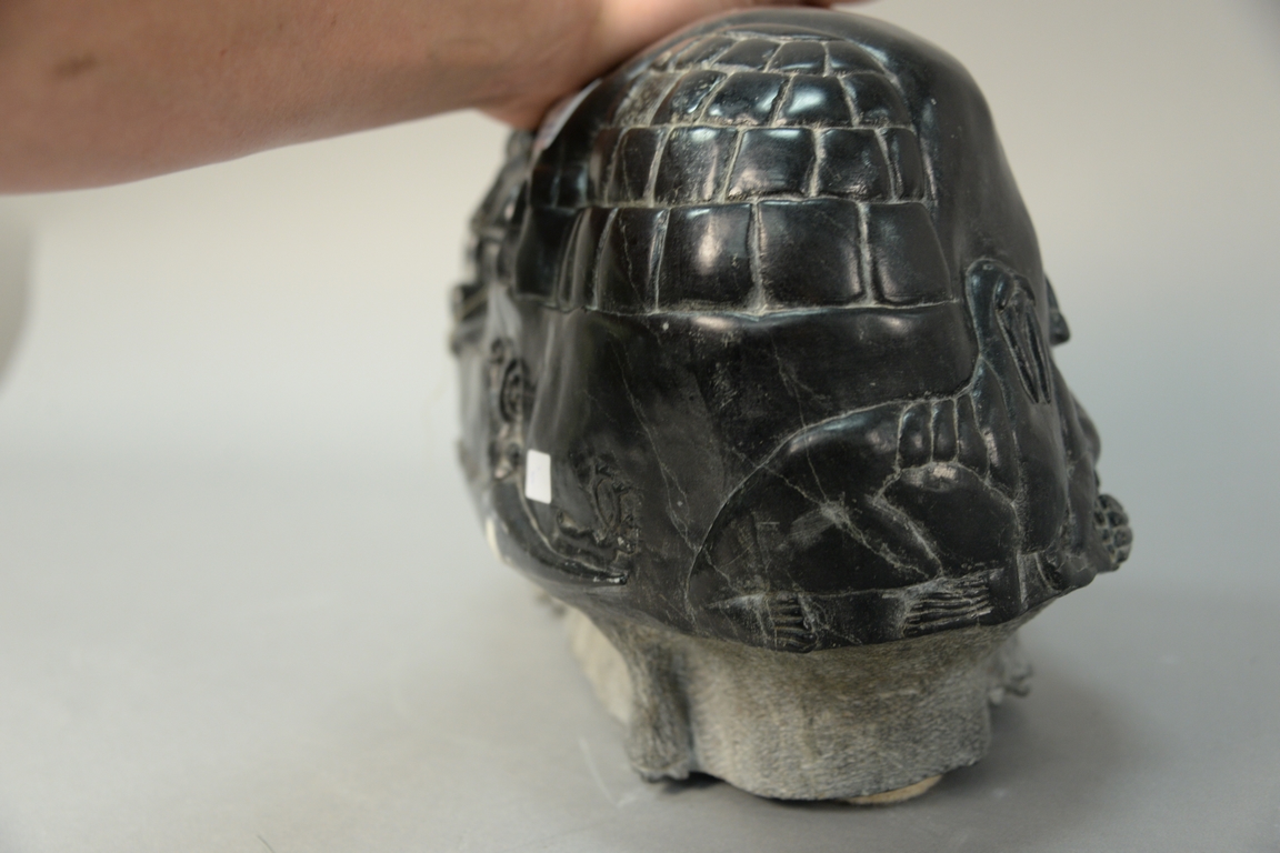 Inuit Eskimo carving, Simon Taipana Baker Lake, Musk Ox green serpentine, lg. 15in.