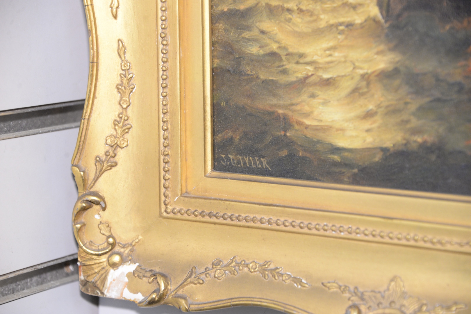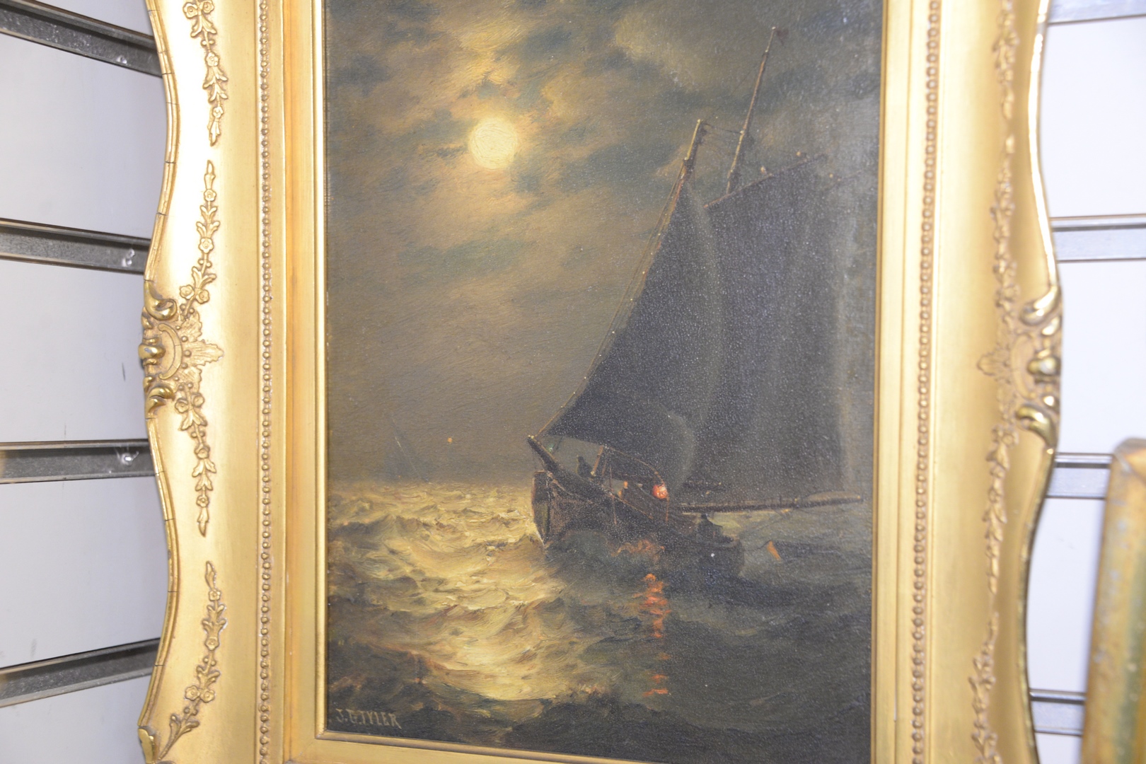 Lot 89: James Gale Tyler 1855 – 1931 ship in moonlight oil on board signed lower left: J.G. Tyler 11 1/2 x 8 1/2