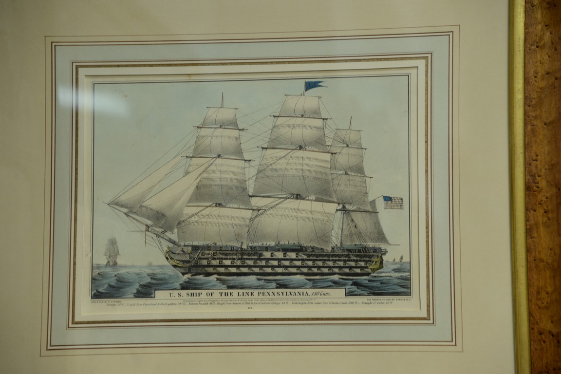 Lot 89: Nathaniel Currier pair of hand colored lithographs U.S. Ship of the Line Pennsylvania, 140 Guns entered in Congress 1846 marke…