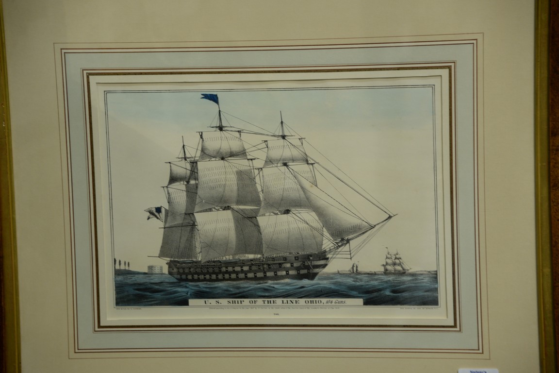 Nathaniel Currier pair of hand colored lithographs U.S. Ship of the Line Pennsylvania, 140 Guns entered in Congress 1846 marked lower left: Lith & Pub by N. Currier sight size 9 1/2 x 13 1/4 and U.S. Ship of the Line Ohio, 104 Guns Entered in Congress 1847 marked lower left: Lith & Pub by N. Currier sight size 9 1/4 x 13 1/2 Provenance: Property from Credit Suisse’s Americana Collection