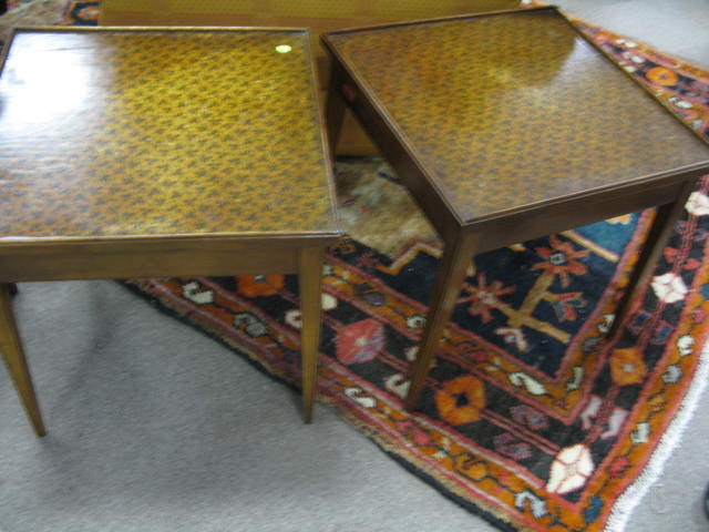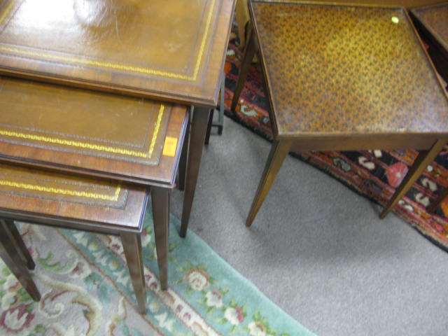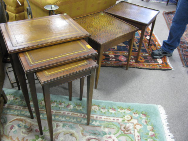 Nest of three leather top tables and two paint decorated occasional tables and a green folding table.