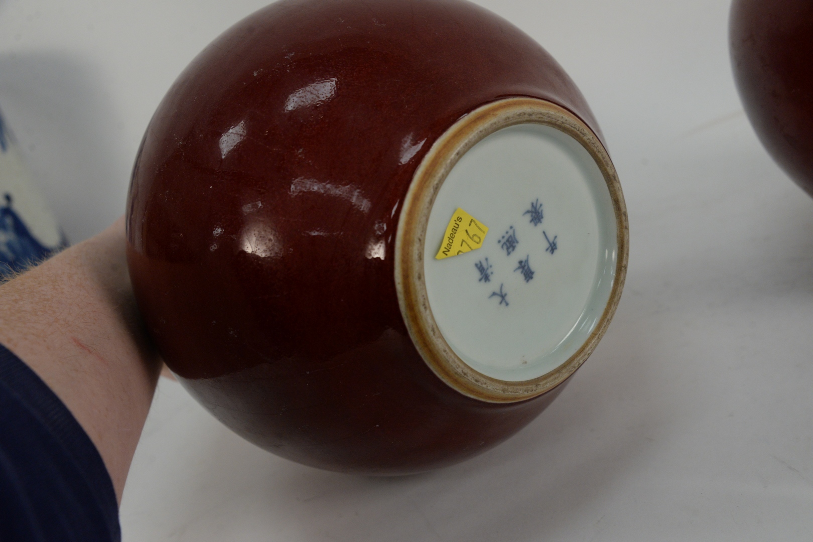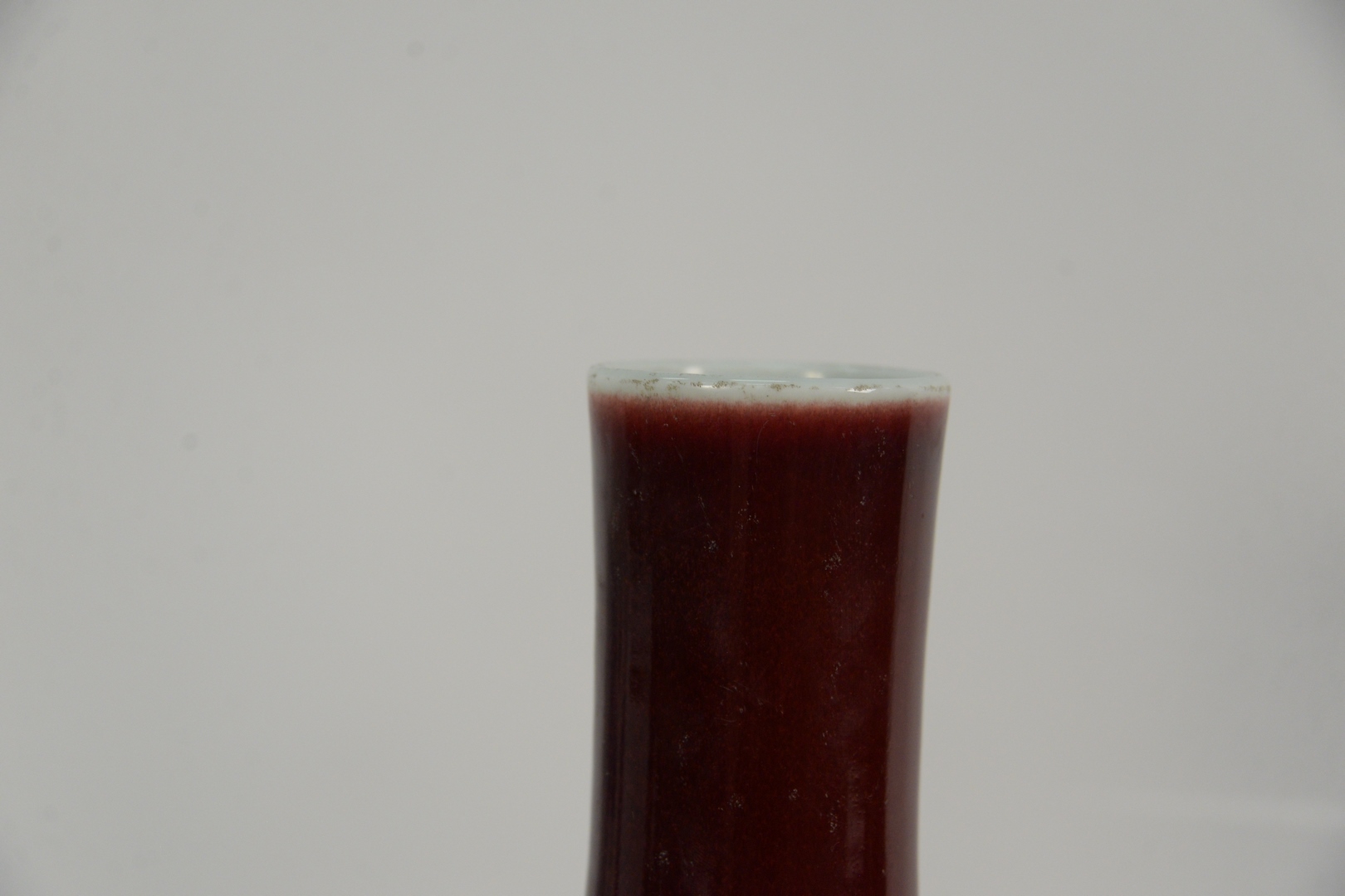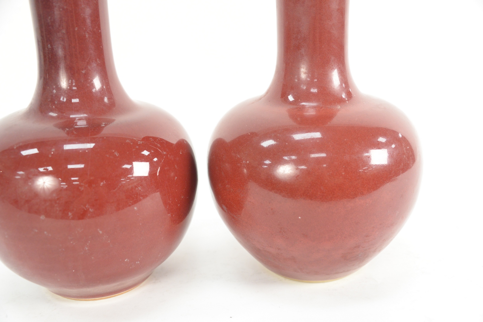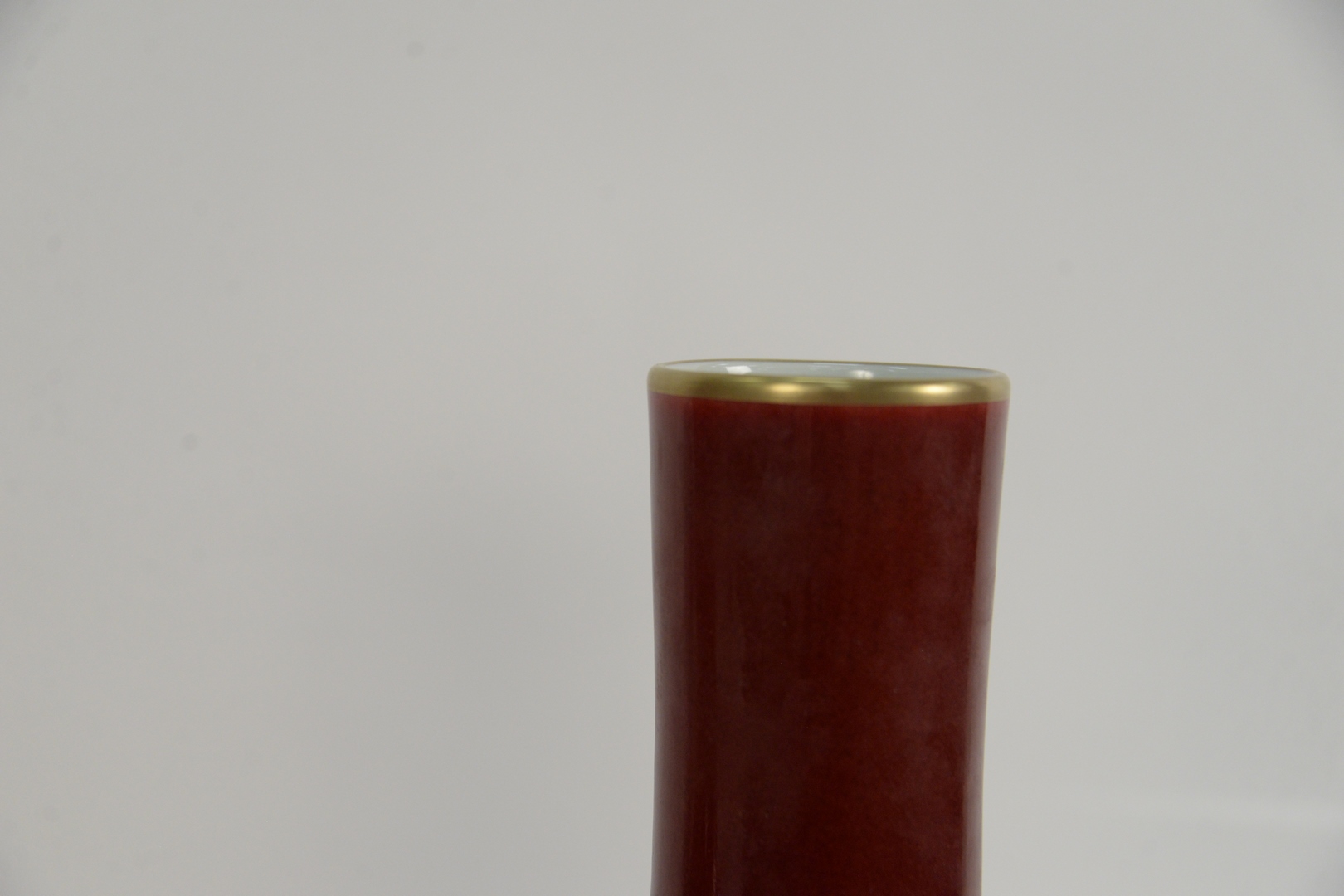 Lot 89: Pair of Chinese Bottle Form Oxblood Langyao Vases, one with a gilt rim and base, both marked with 6 character Kangxi Reign mark character to underside, both 19th/20th Century, height 13 inches.