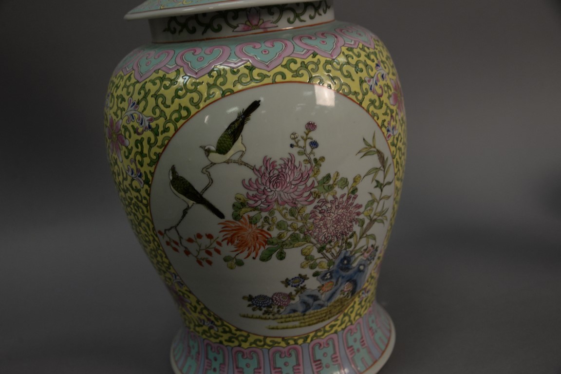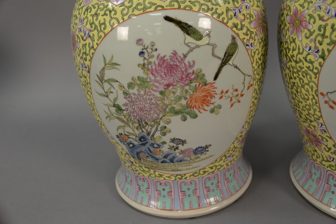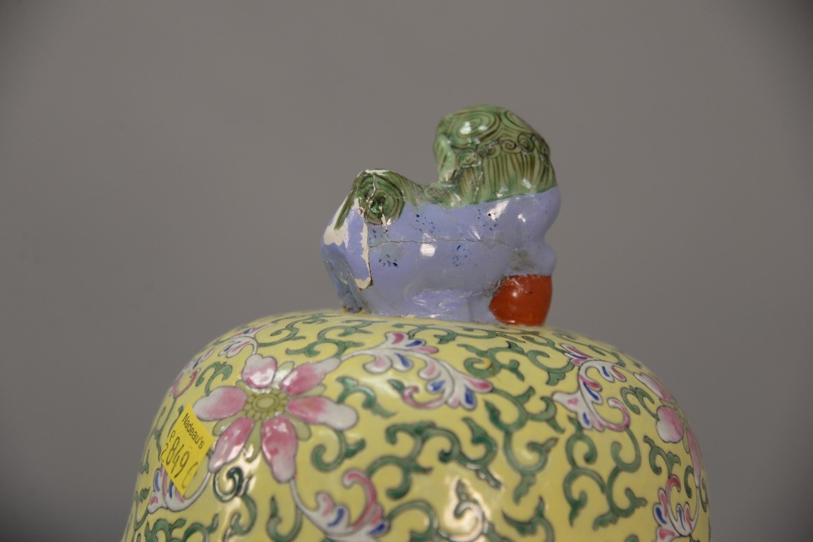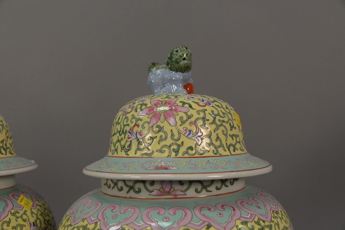 Lot 89: Pair of Chinese porcelain covered jars, late 20th century 1 top finial as is. ht. 18 1/2in.