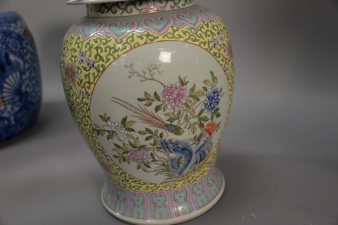 Pair of Chinese porcelain covered jars, late 20th century 1 top finial as is. ht. 18 1/2in.