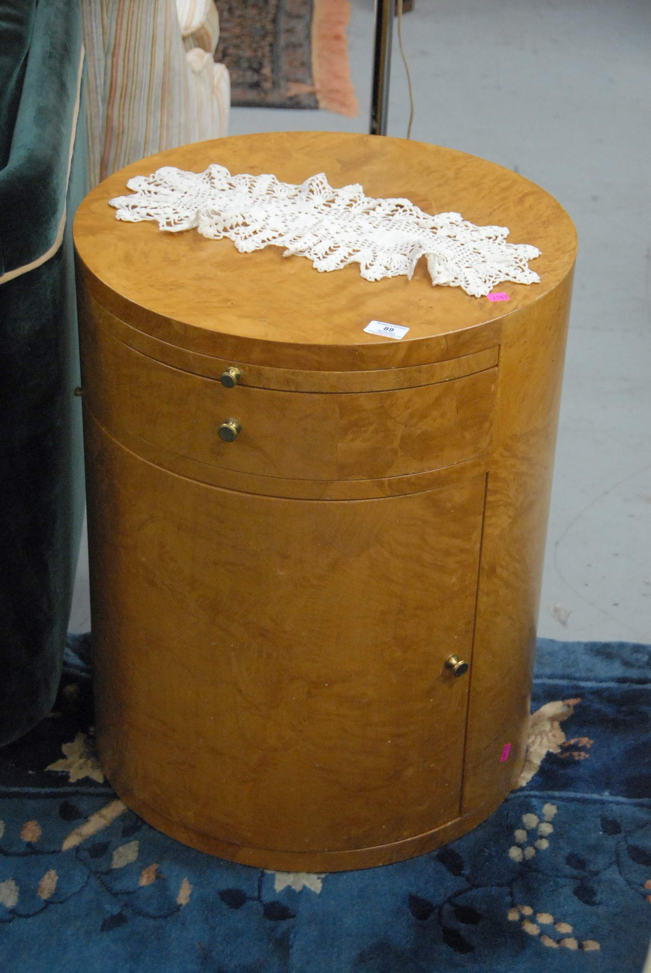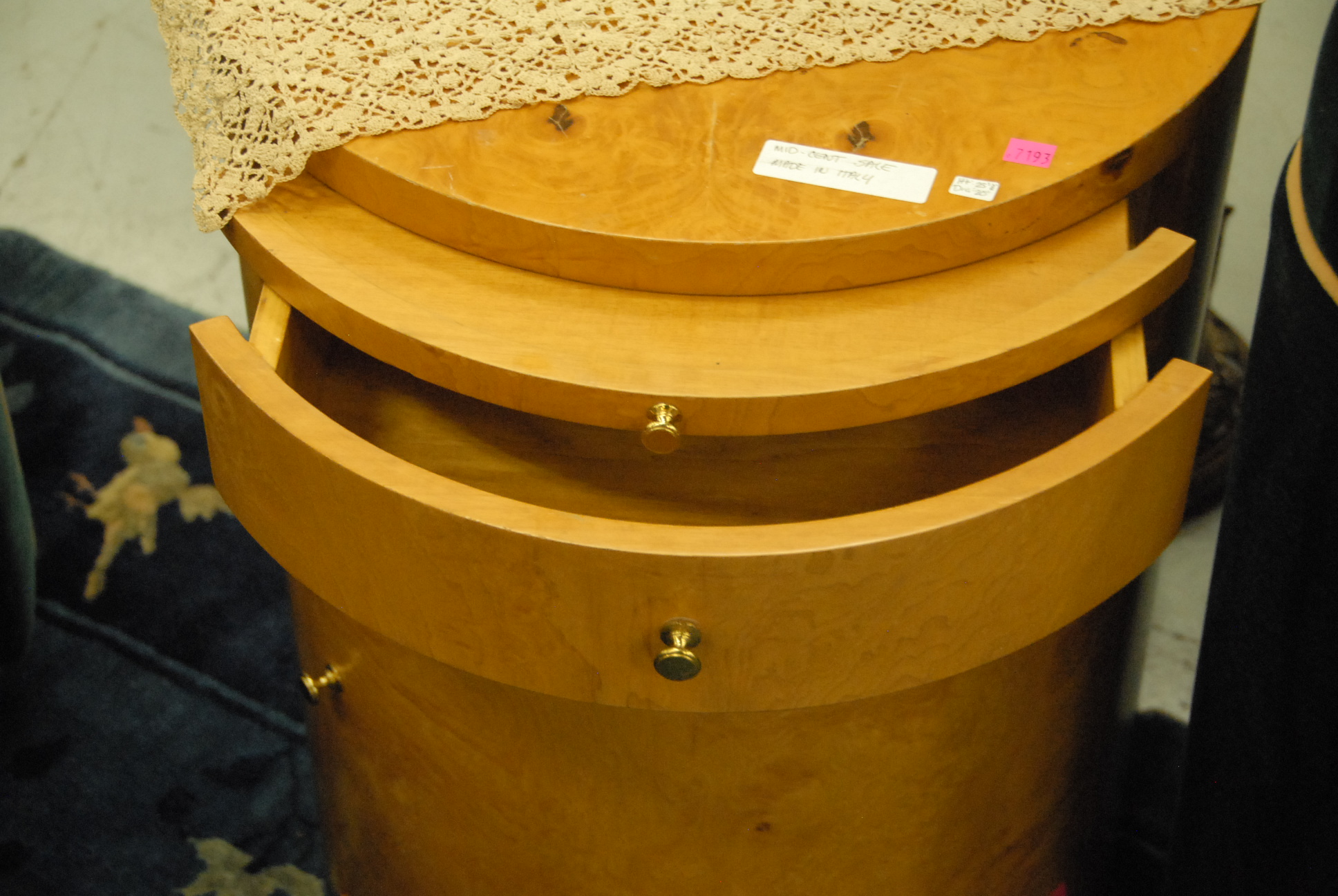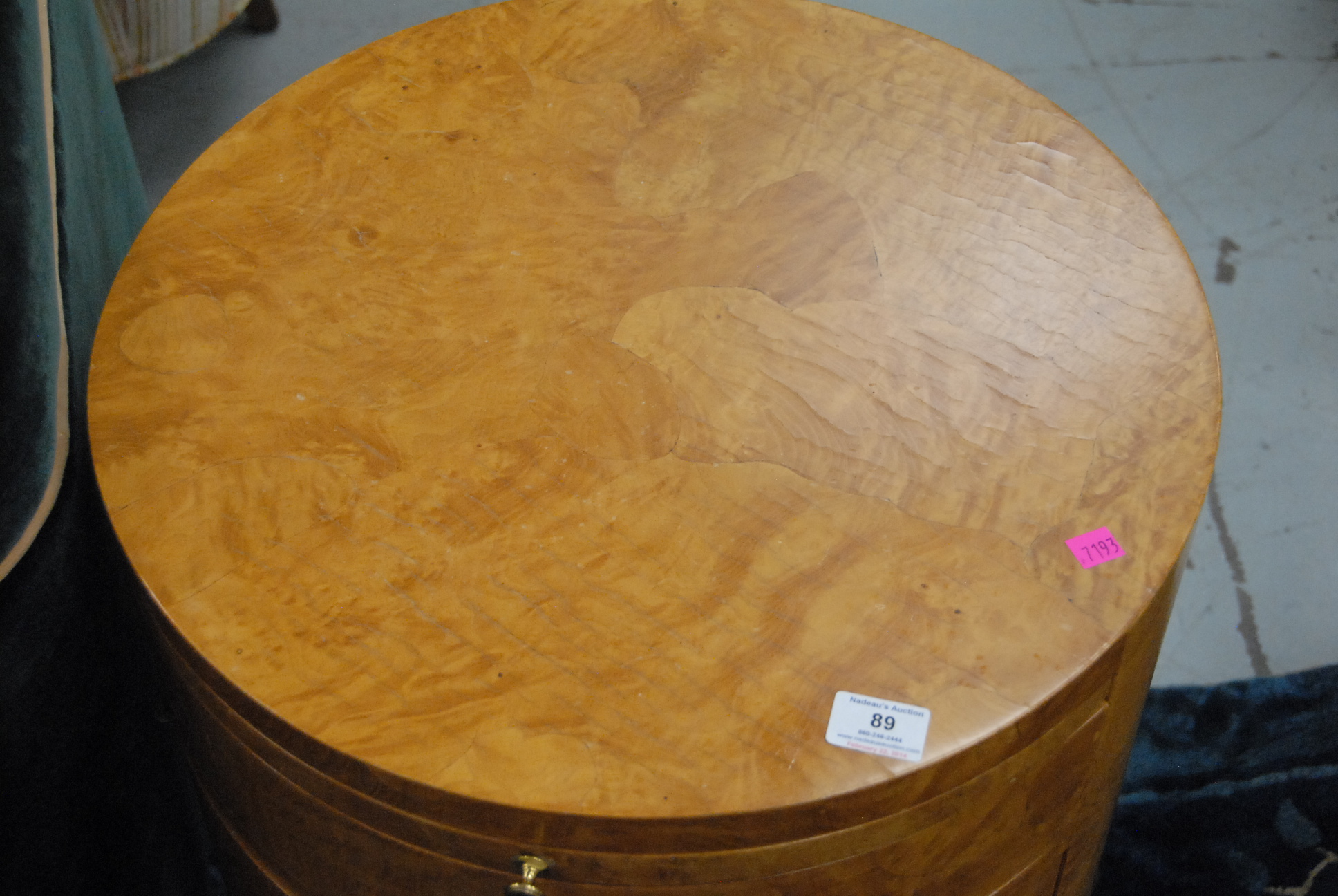 Lot 89: Pair of Italian burl drum top end tables with cubby, drawer, and writing slide in very good condition with cracked veneer, ht. 25 1/…