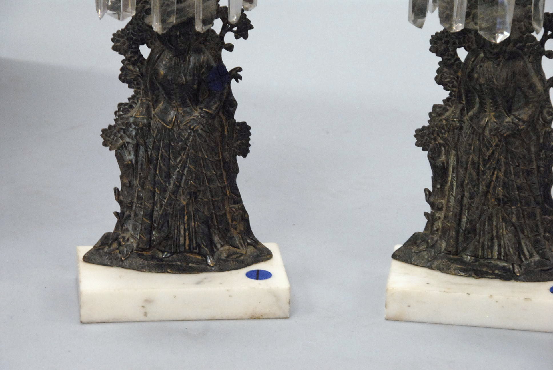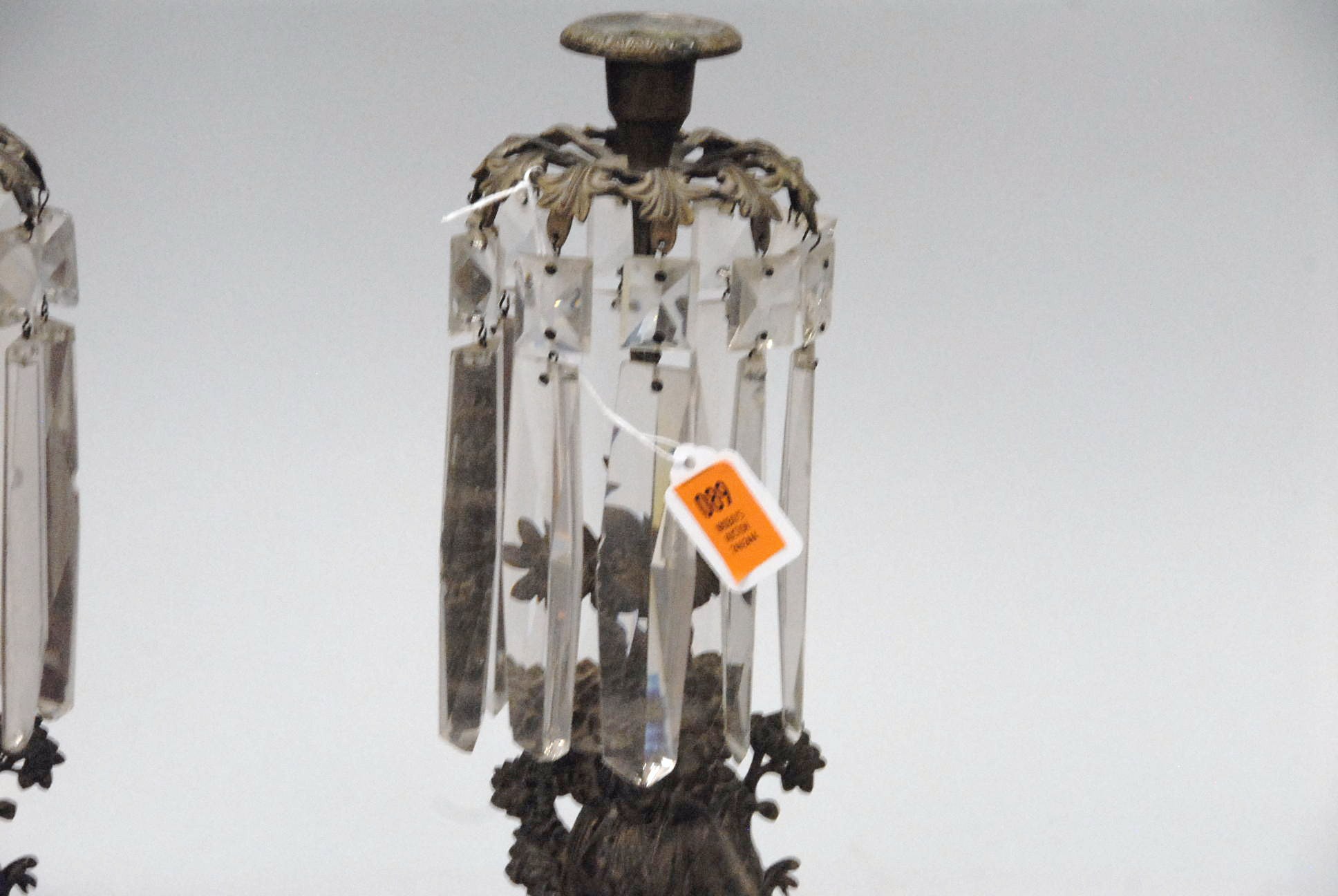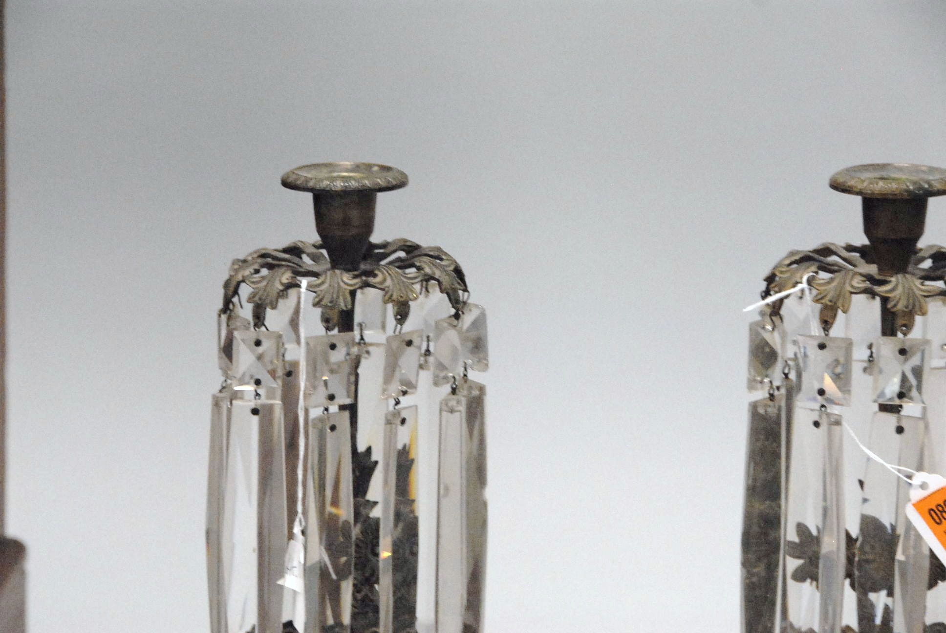 Pair of Victorian candle holders with figural bases and prisms marked Cornelius & Co.
