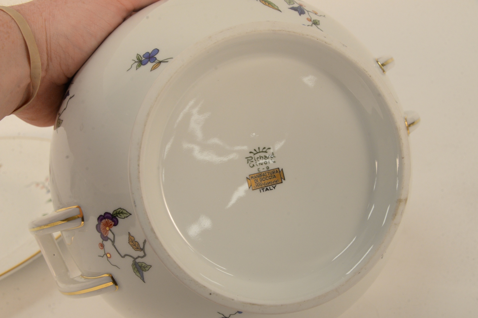 Richard Ginori Italian Porcelain Covered Tureen, with underplate, having painted flowers with gilt gold center, marked Manifattura Di Docia, Florence, height 9 1/2 inches. Provenance: The Estate of Alina Roisen, Park Avenue, New York.