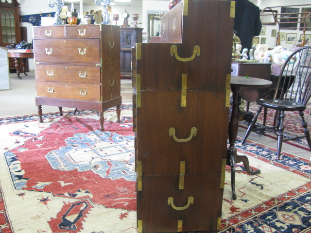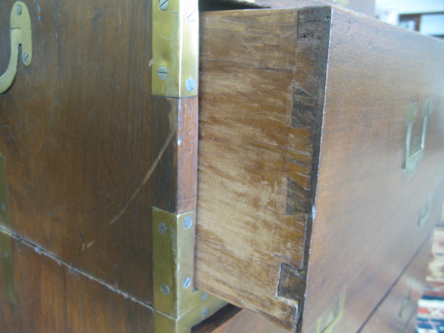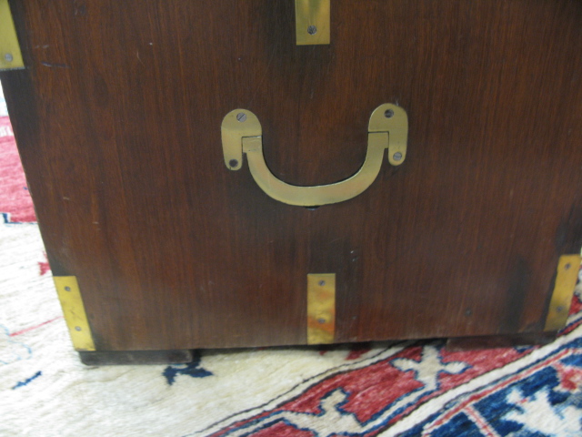 Three section campaign chest with small drawers at top, each has inset brass handles and brass carrying handles