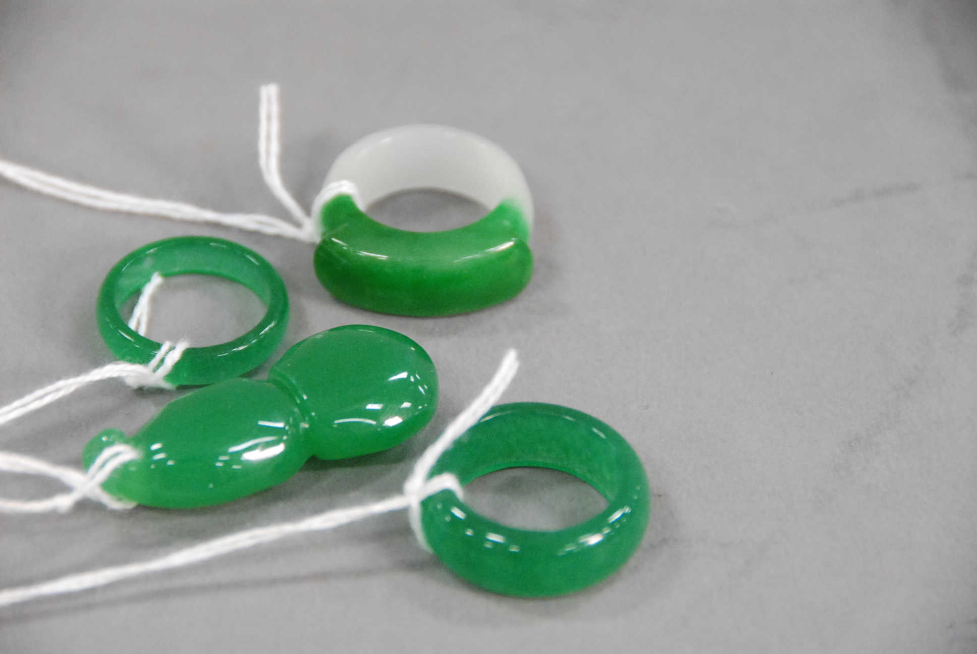 Three small jadeite rings and an eggplant form jadeite pendant.