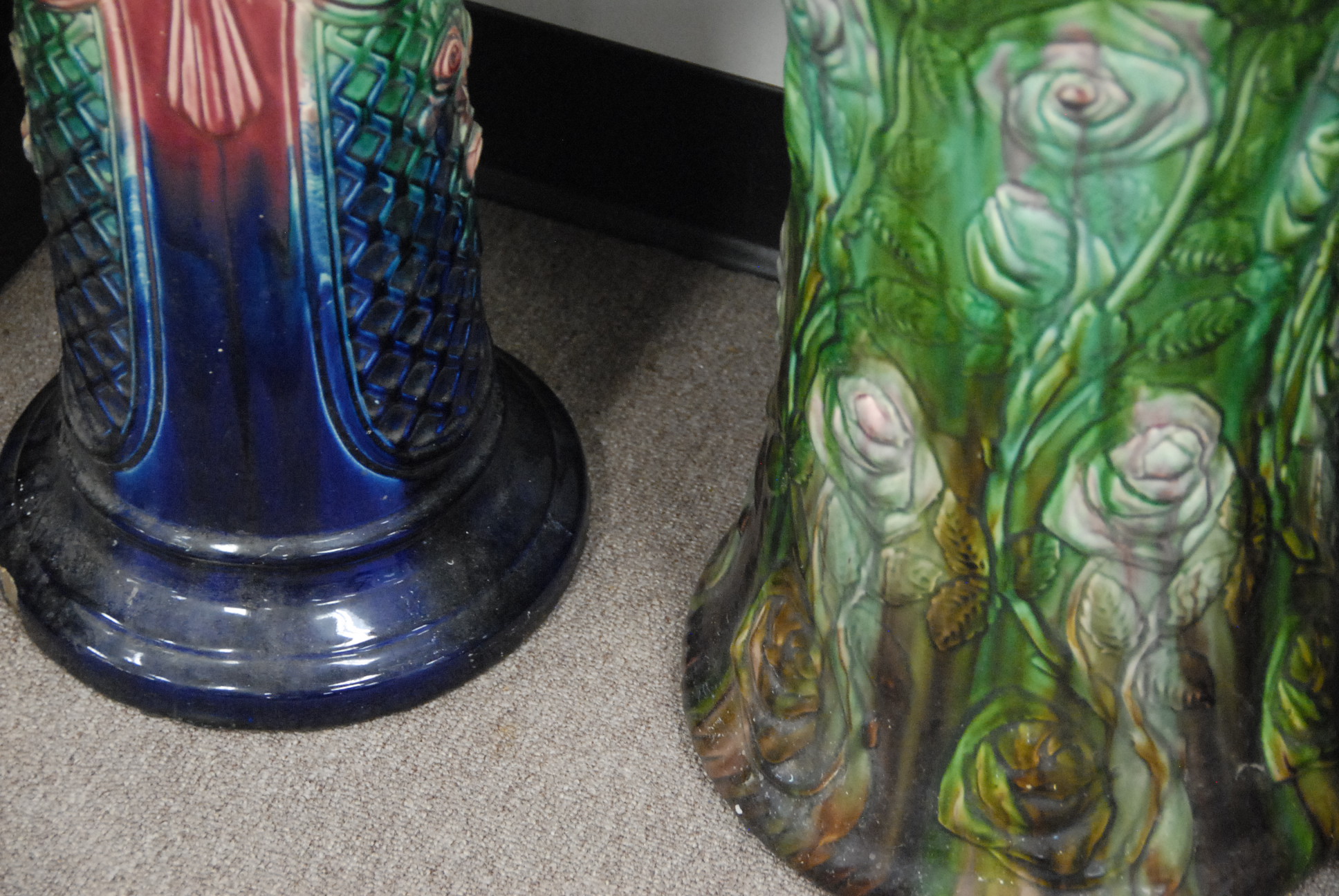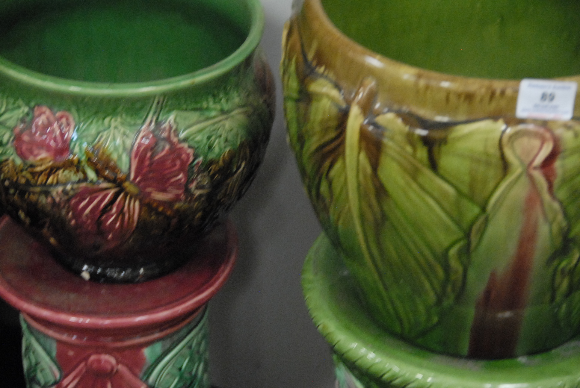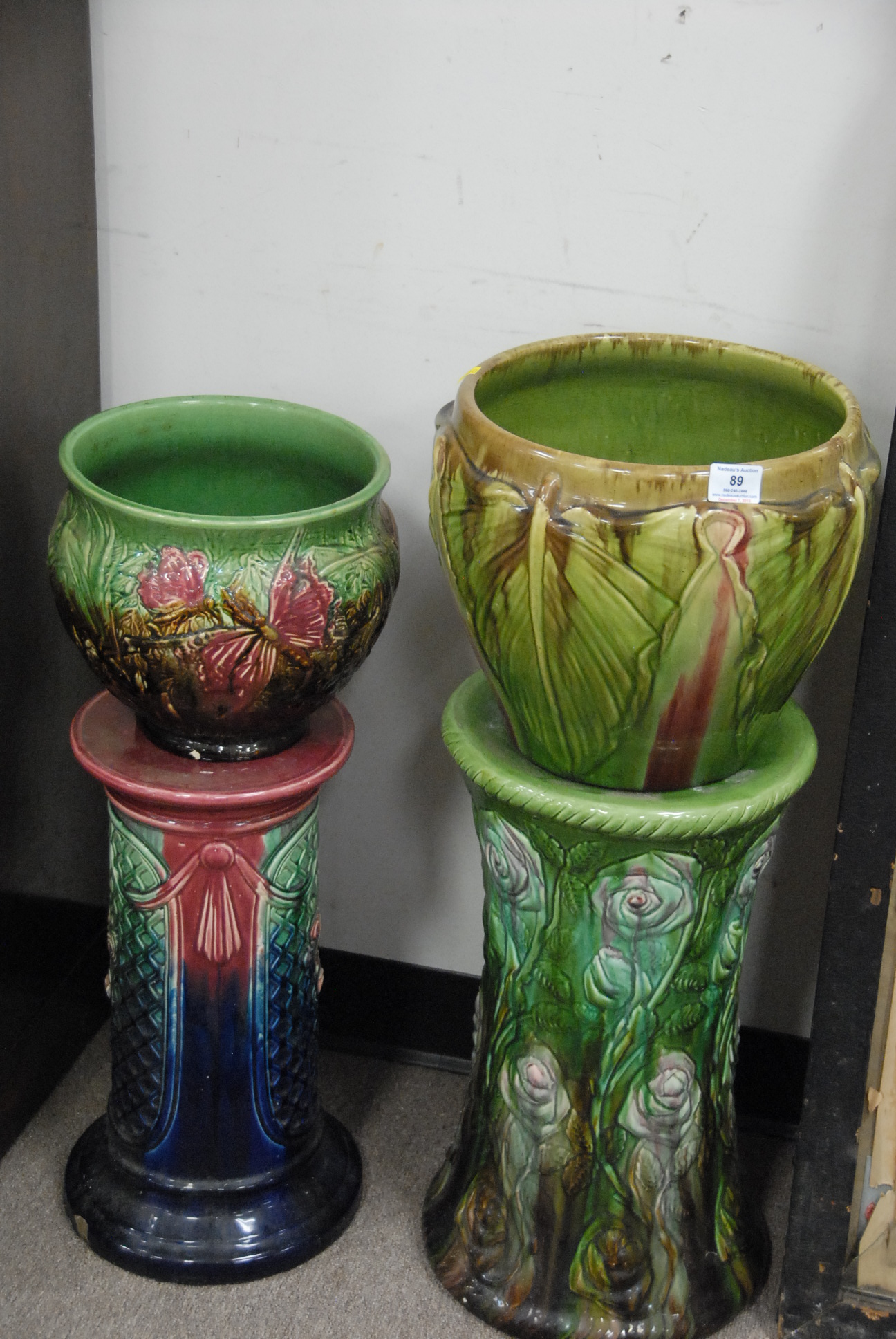 Two Majolica jardinires and pedestals non matching, ht. 26 1/2in. & 30in.