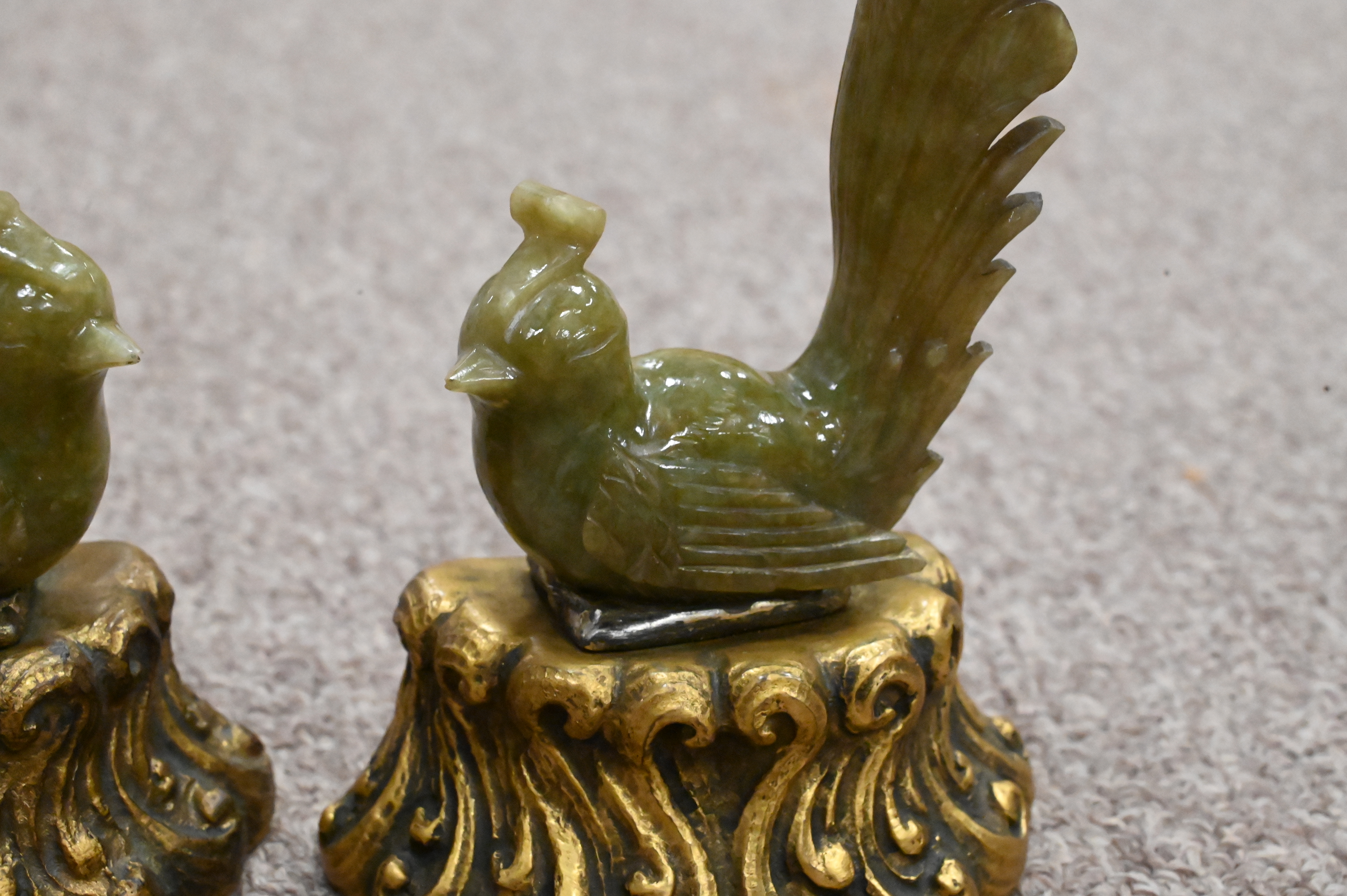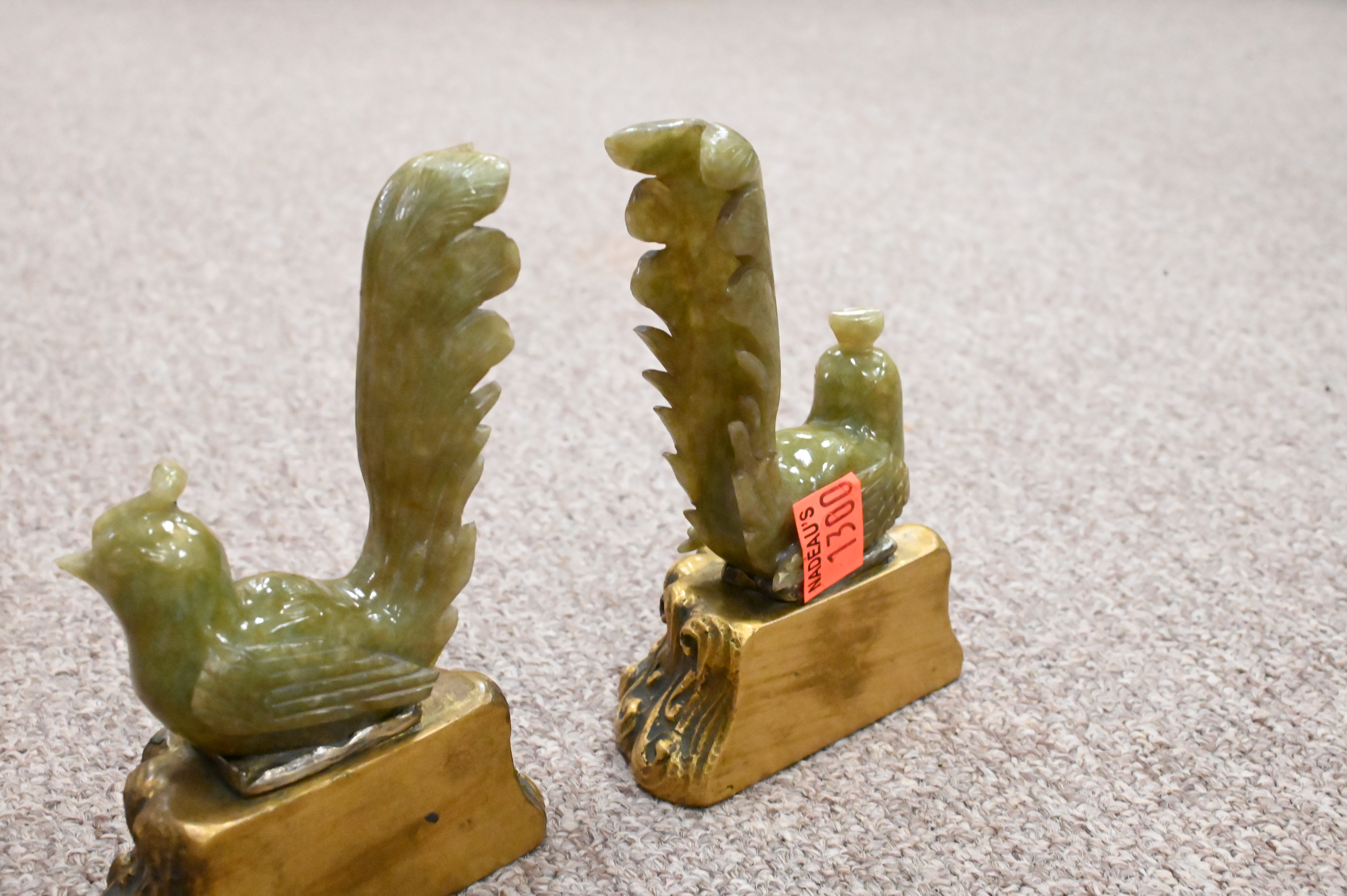 Pair of Yamanaka Bookends, having carved hardstone peacock on bronze base, marked Yamanaka & Company, Inc., made in Japan, height 5 inches.
