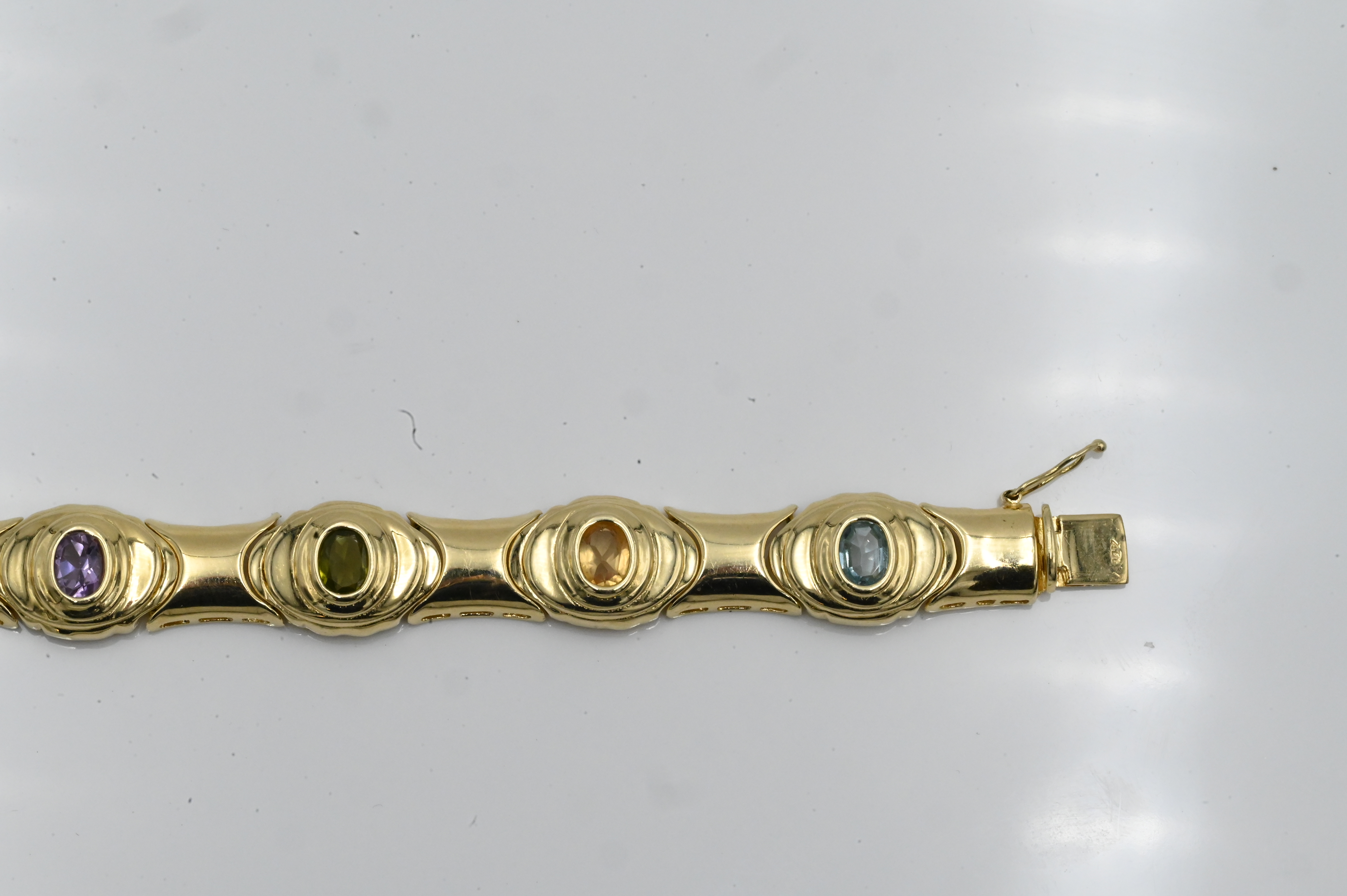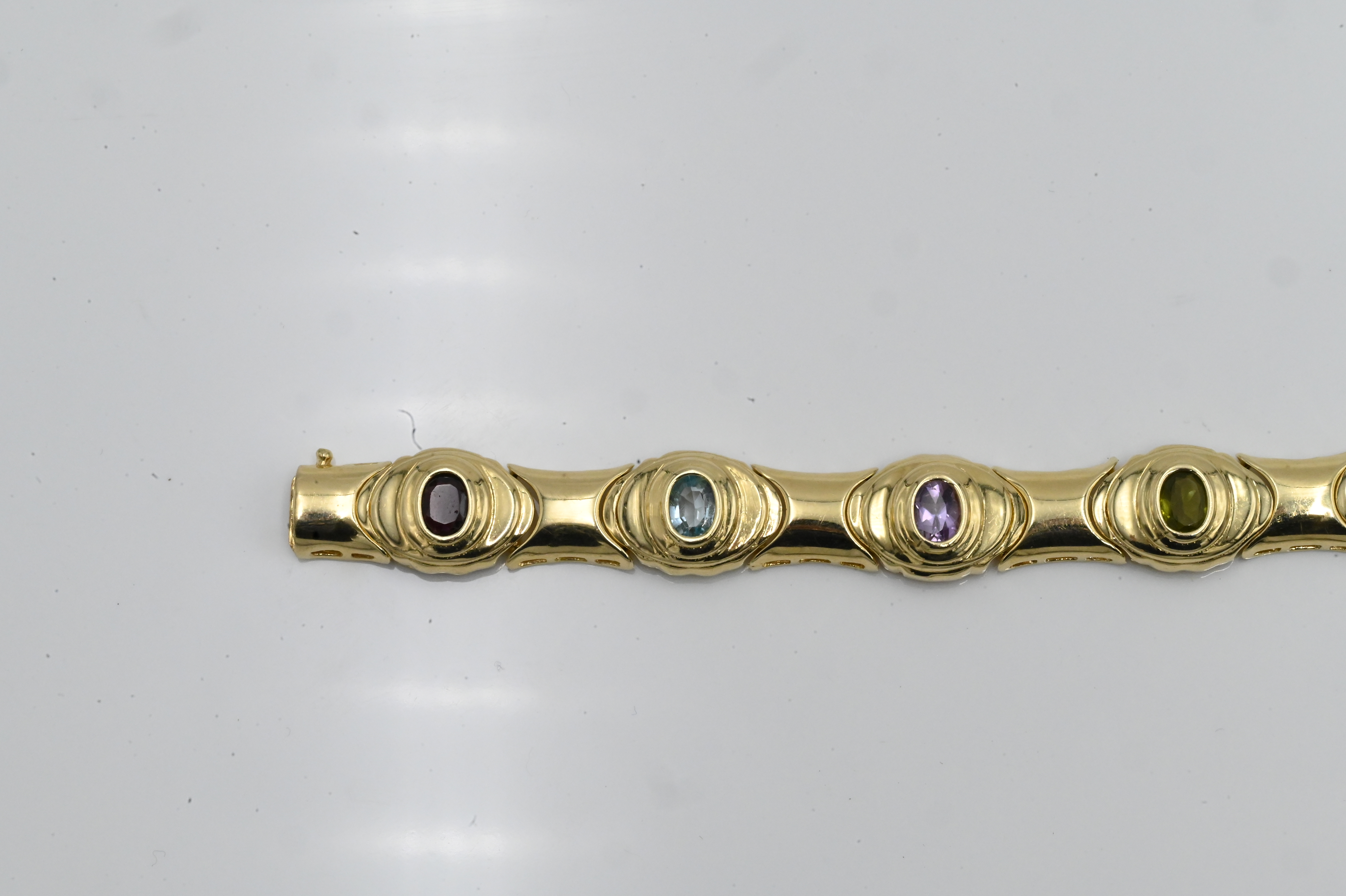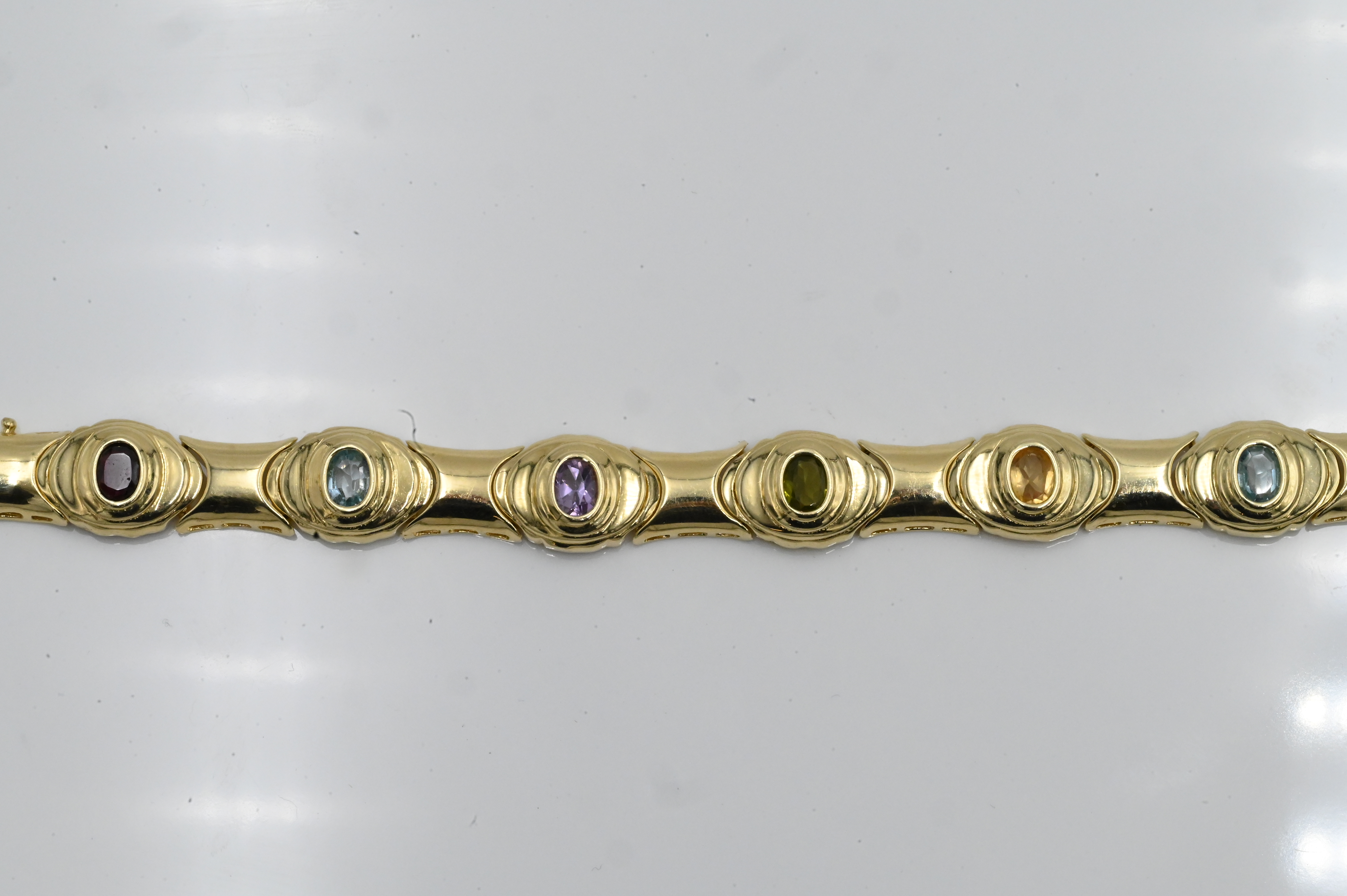 14 Karat Yellow Gold Bracelet, set with various colored stones, 7 inches, 35.2 grams.