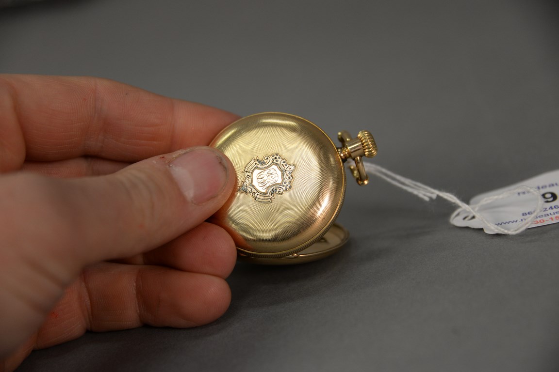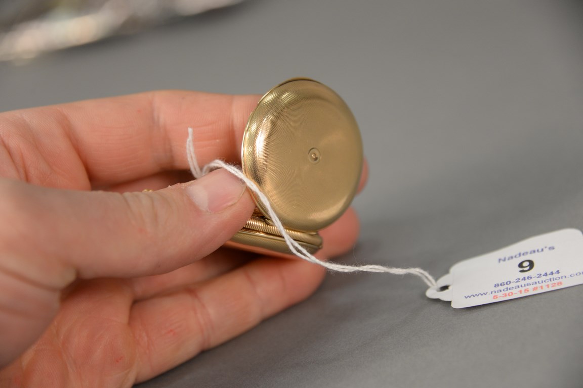 14K Bequelin Houriet Tramelan closed face pocket watch signed on cover and works.