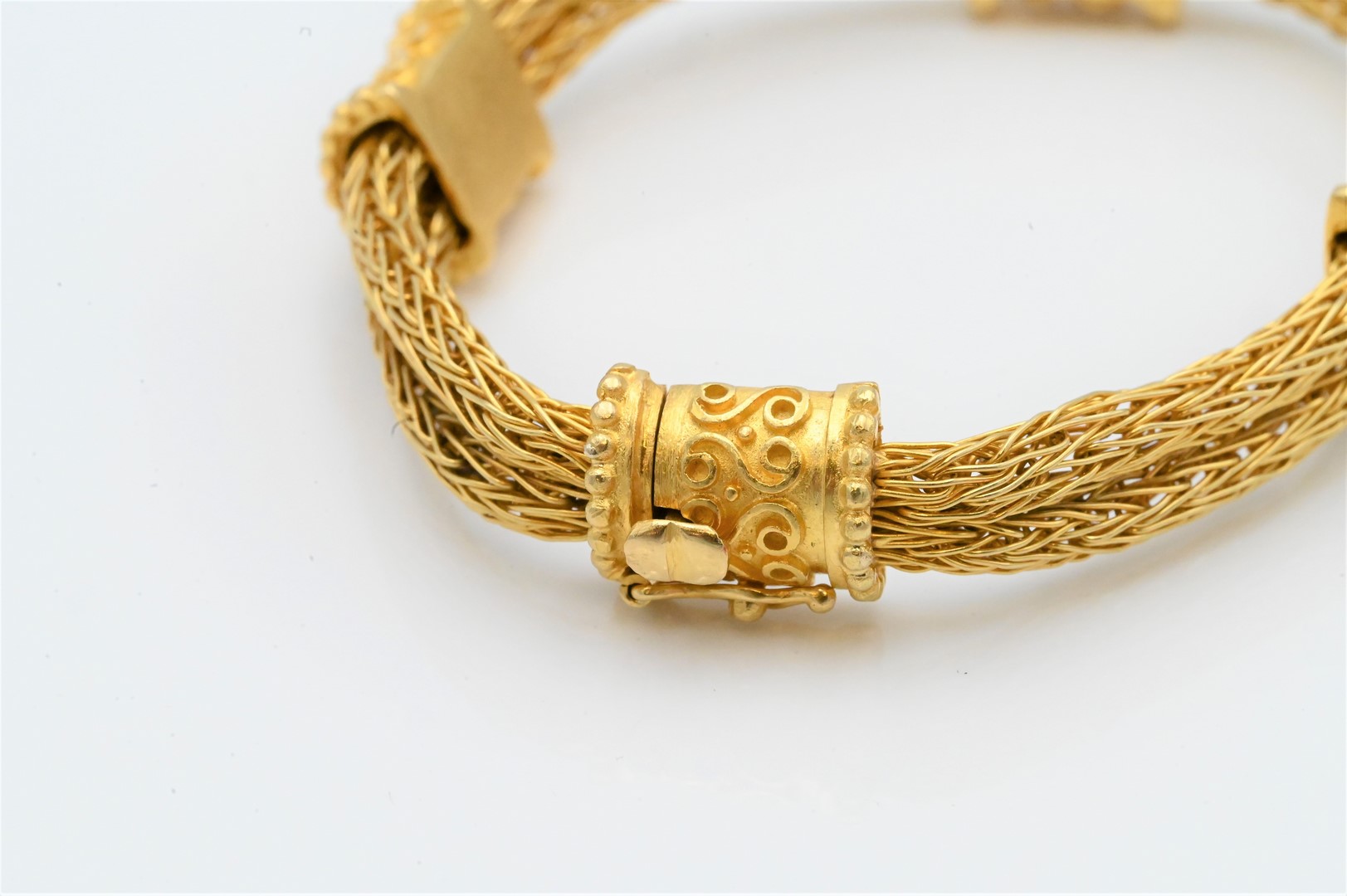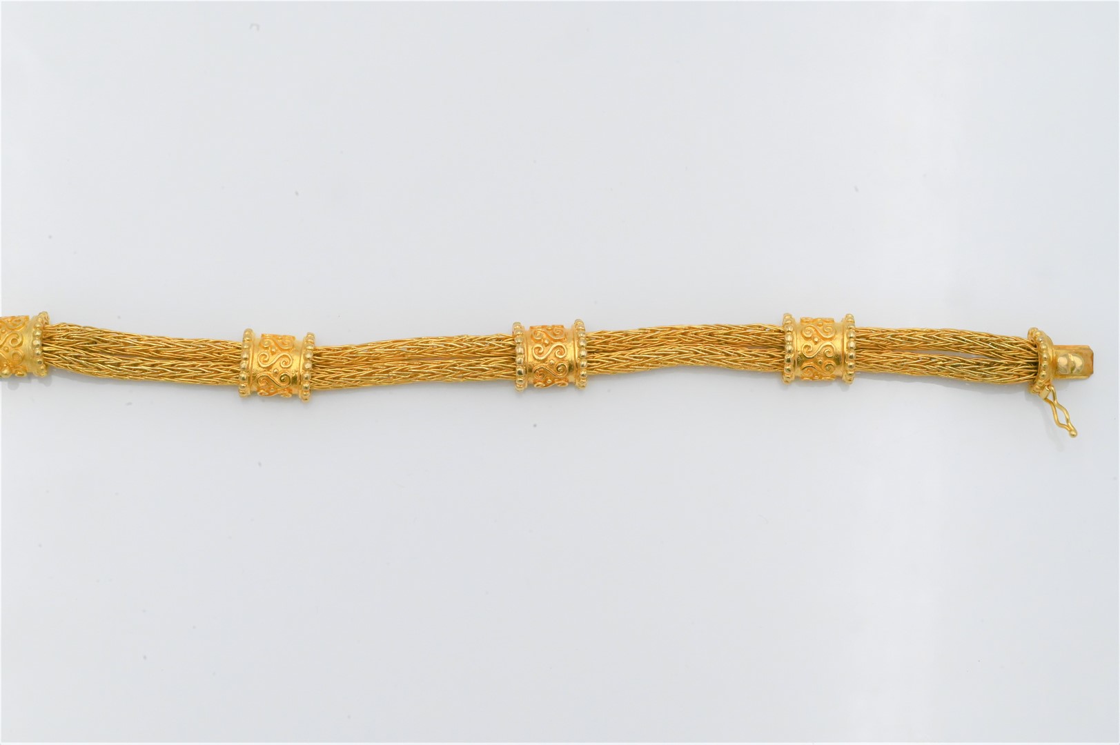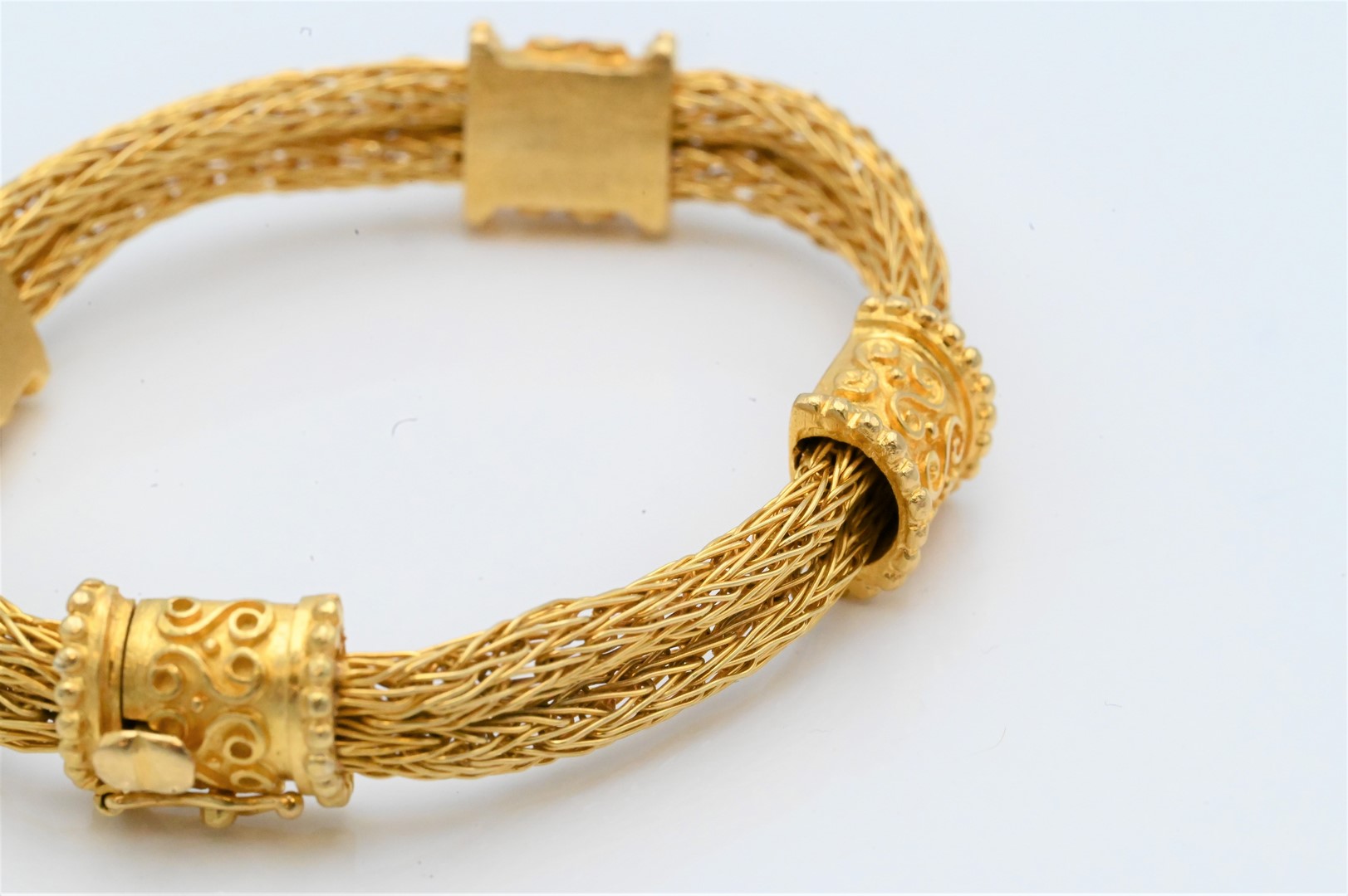 18 Karat Yellow Gold Bracelet, double woven bands set with three collars length 7 1/2 inches, 39.8 grams Condition: good condition